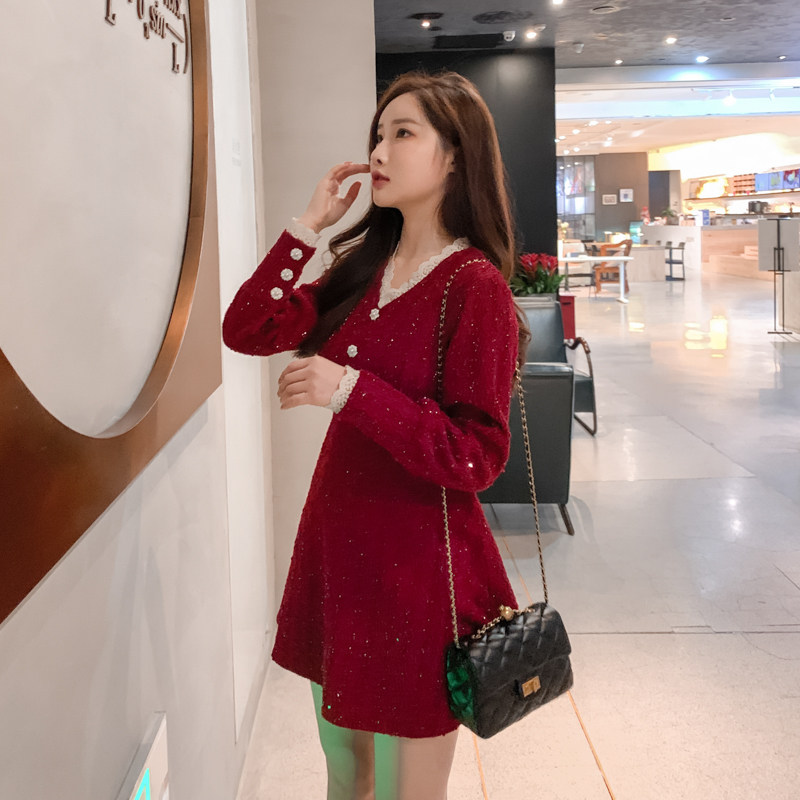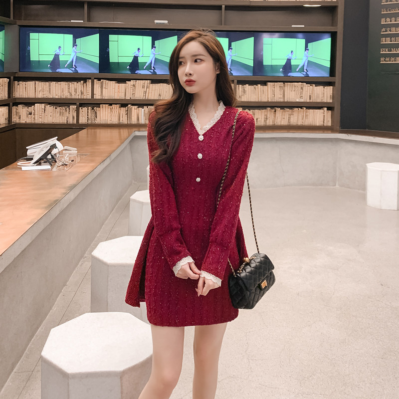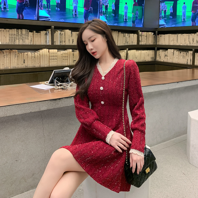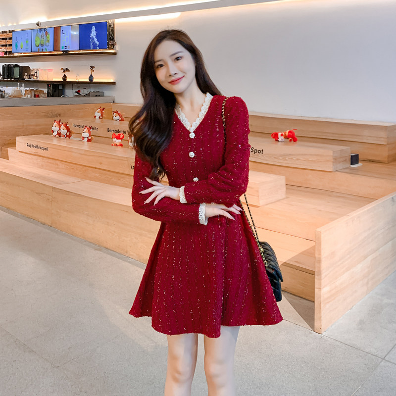 2025秋冬装新款女装小个子红色洋气长袖厚款连衣裙高腰A字裙子潮