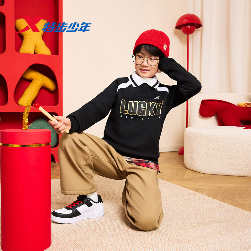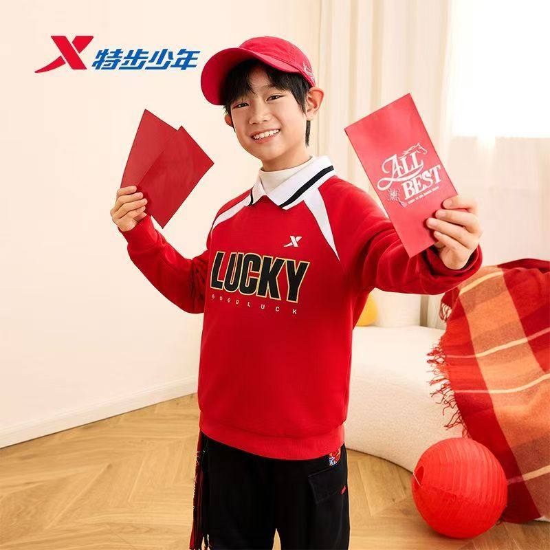 特步儿童红色卫衣加绒2025新款男童过年衣服马年本命年男孩上衣冬