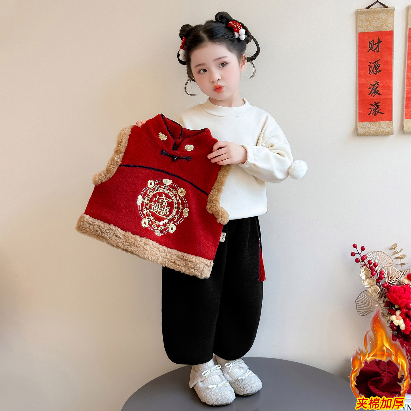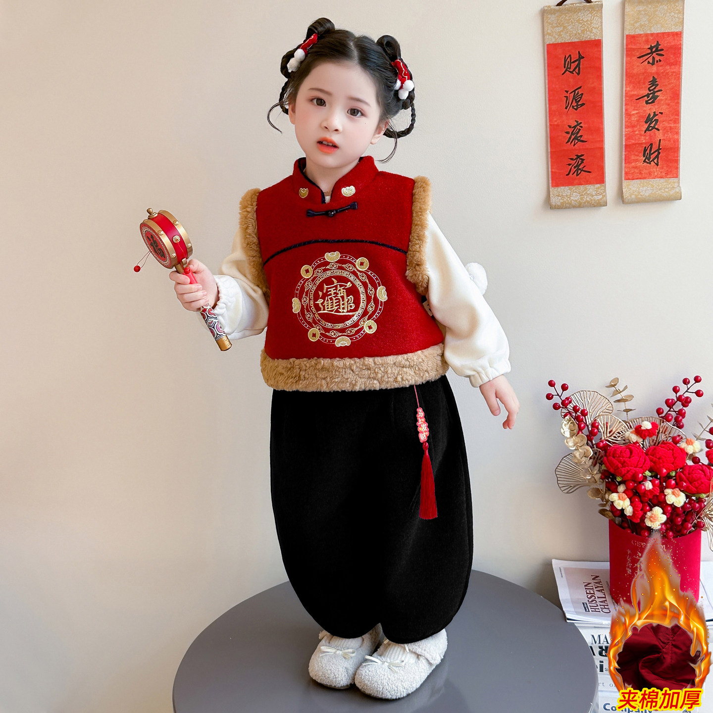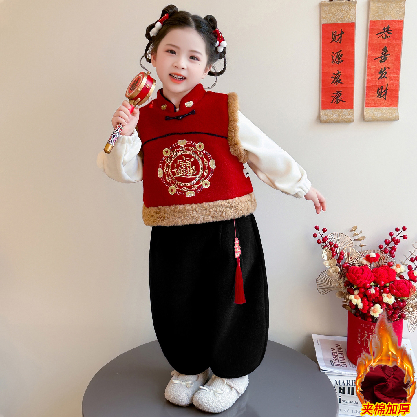 女童中国风新年拜招财进宝年服三件套冬季加绒加厚唐装套装