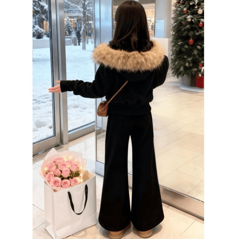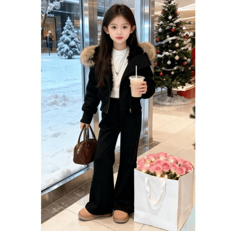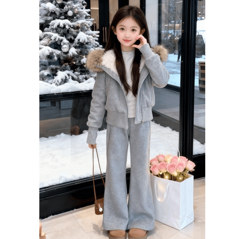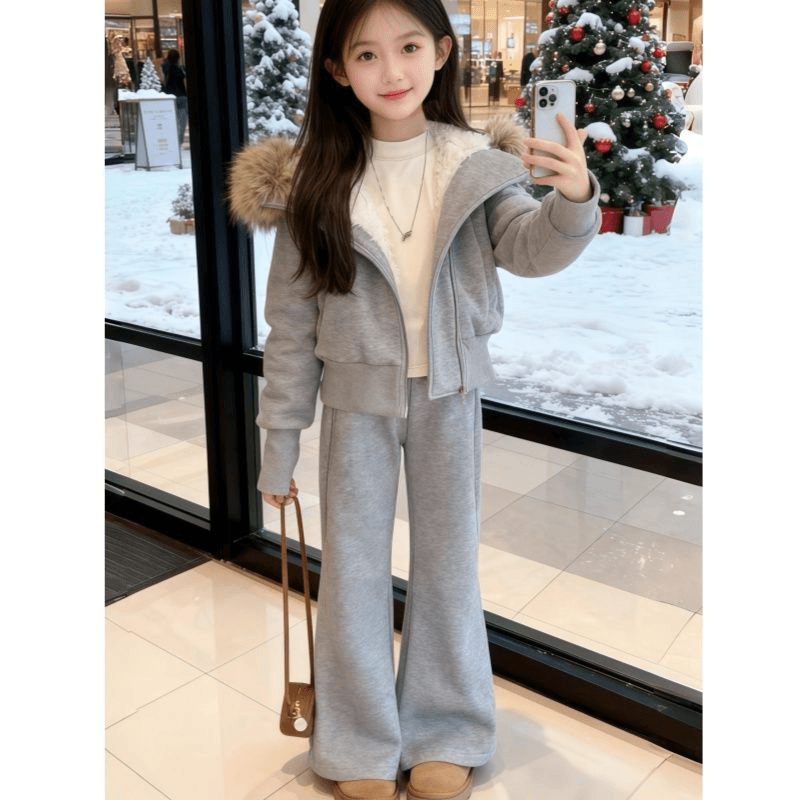 女童加绒套装冬季加厚卫衣大毛领洋气时尚韩版2025新款修身中大童