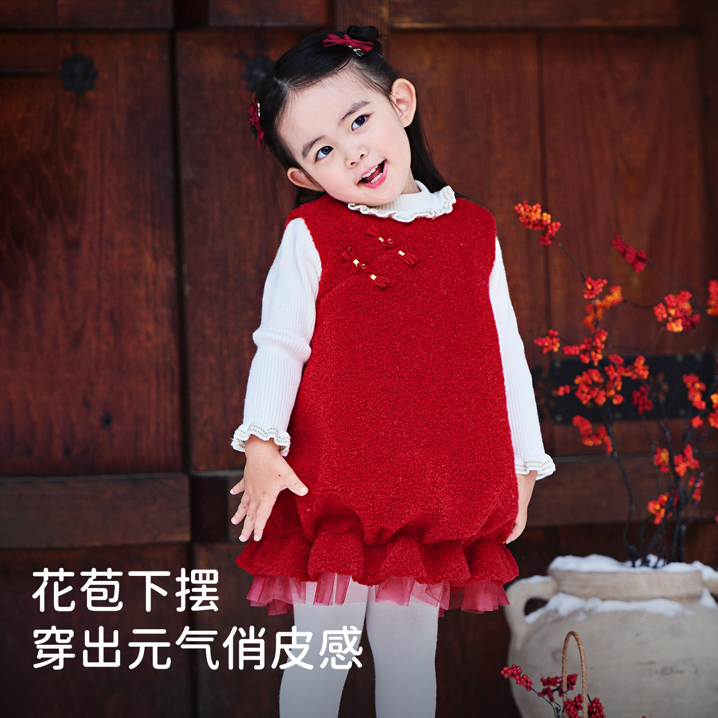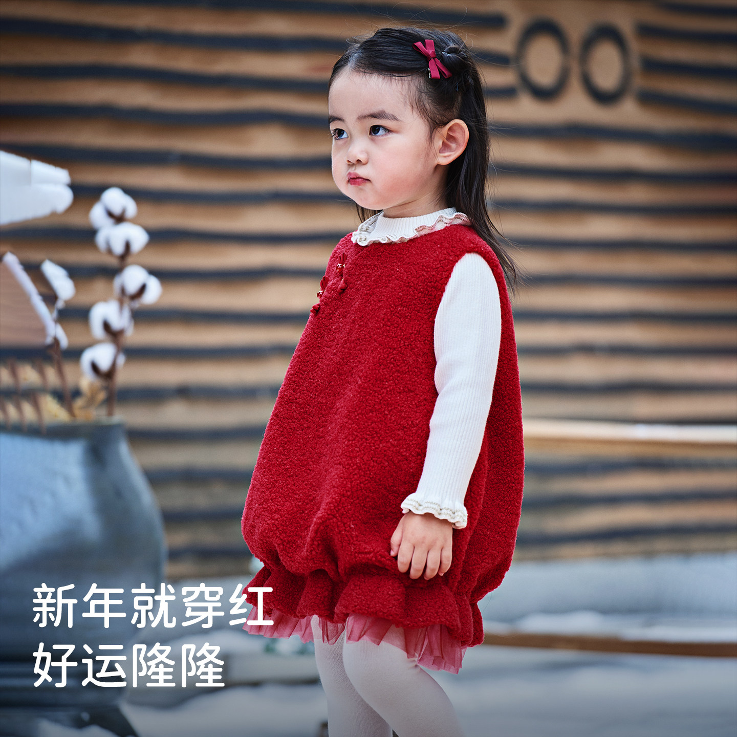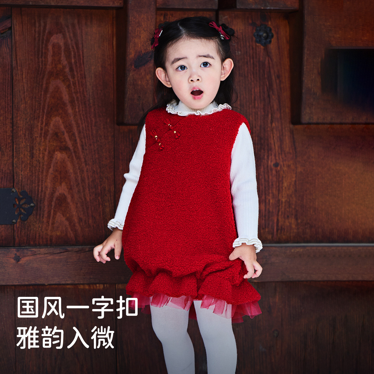 戴维贝拉2025冬装新款女童毛绒连衣裙宝宝A类背心裙儿童国风裙子