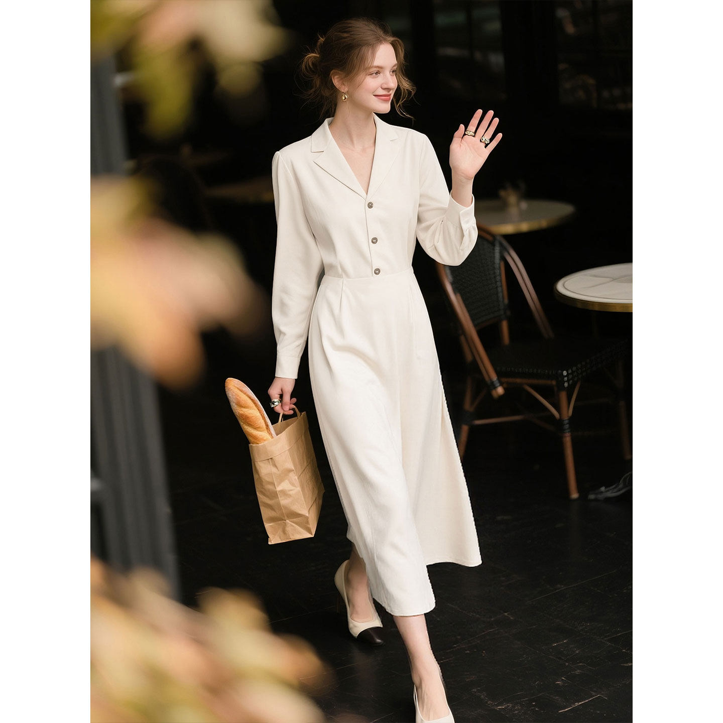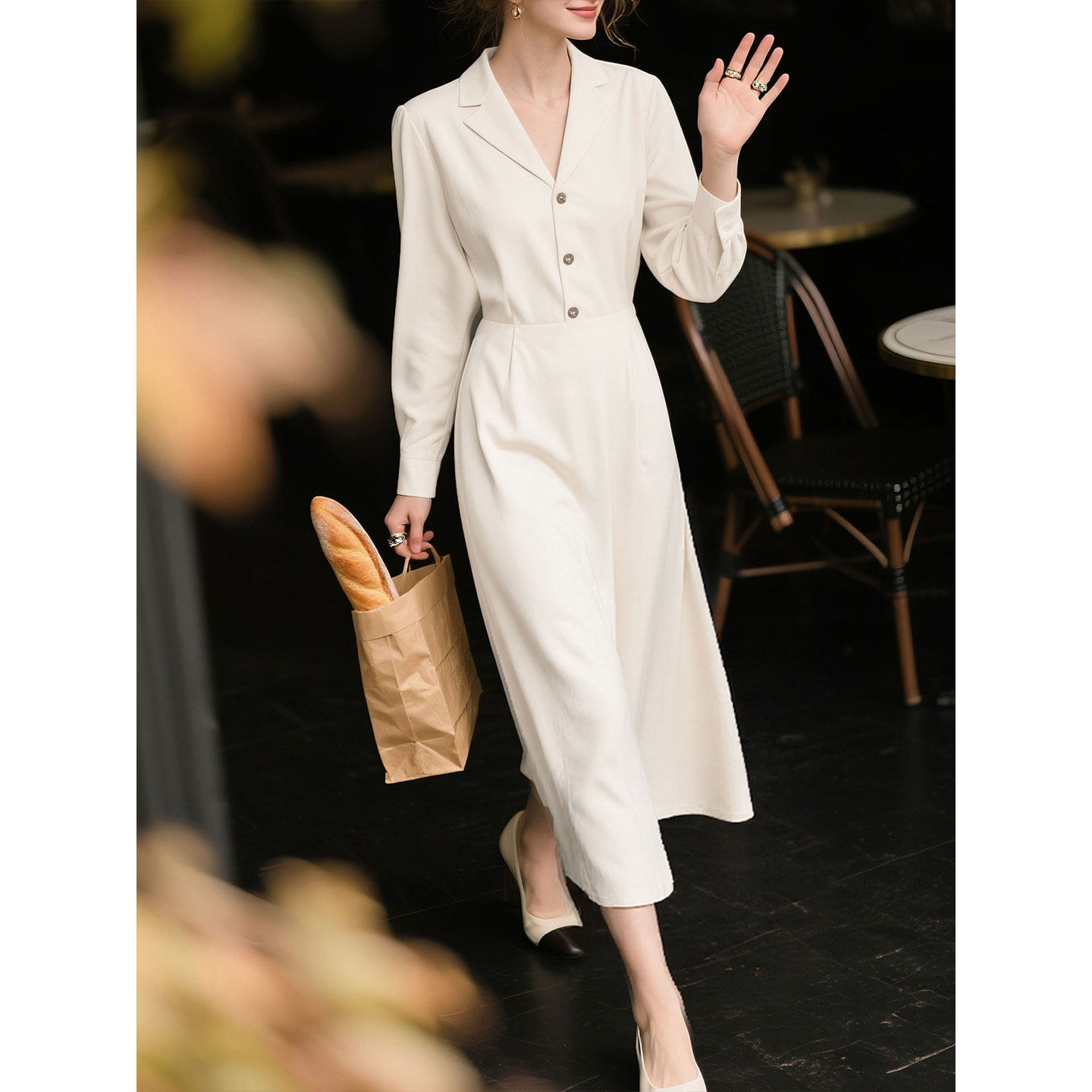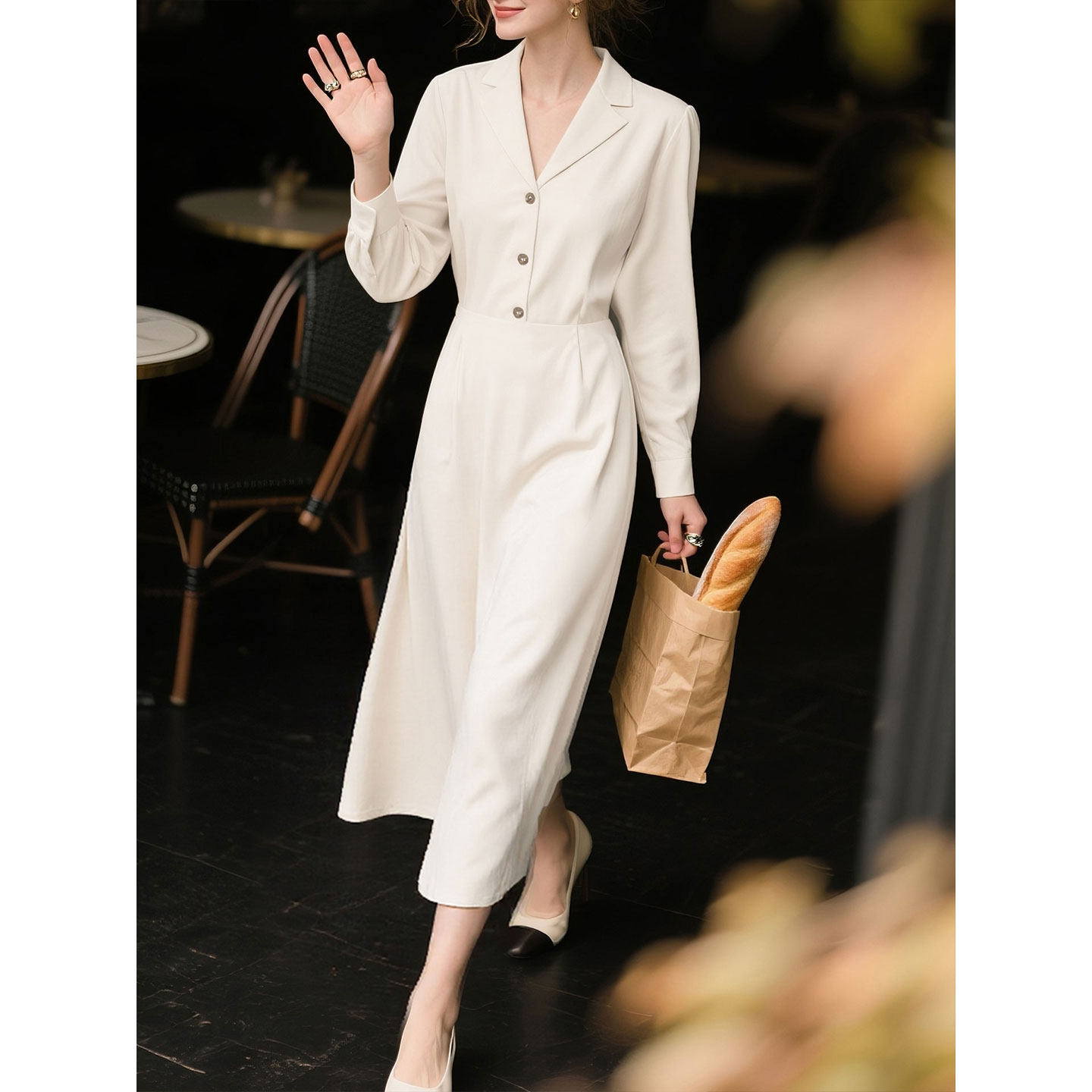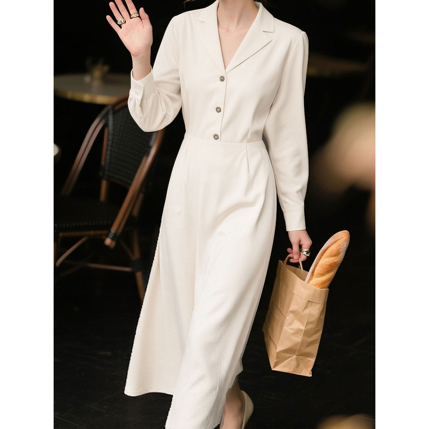 白色长袖连衣裙女2026年春季新款气质随性慵懒知性V领中长款裙子