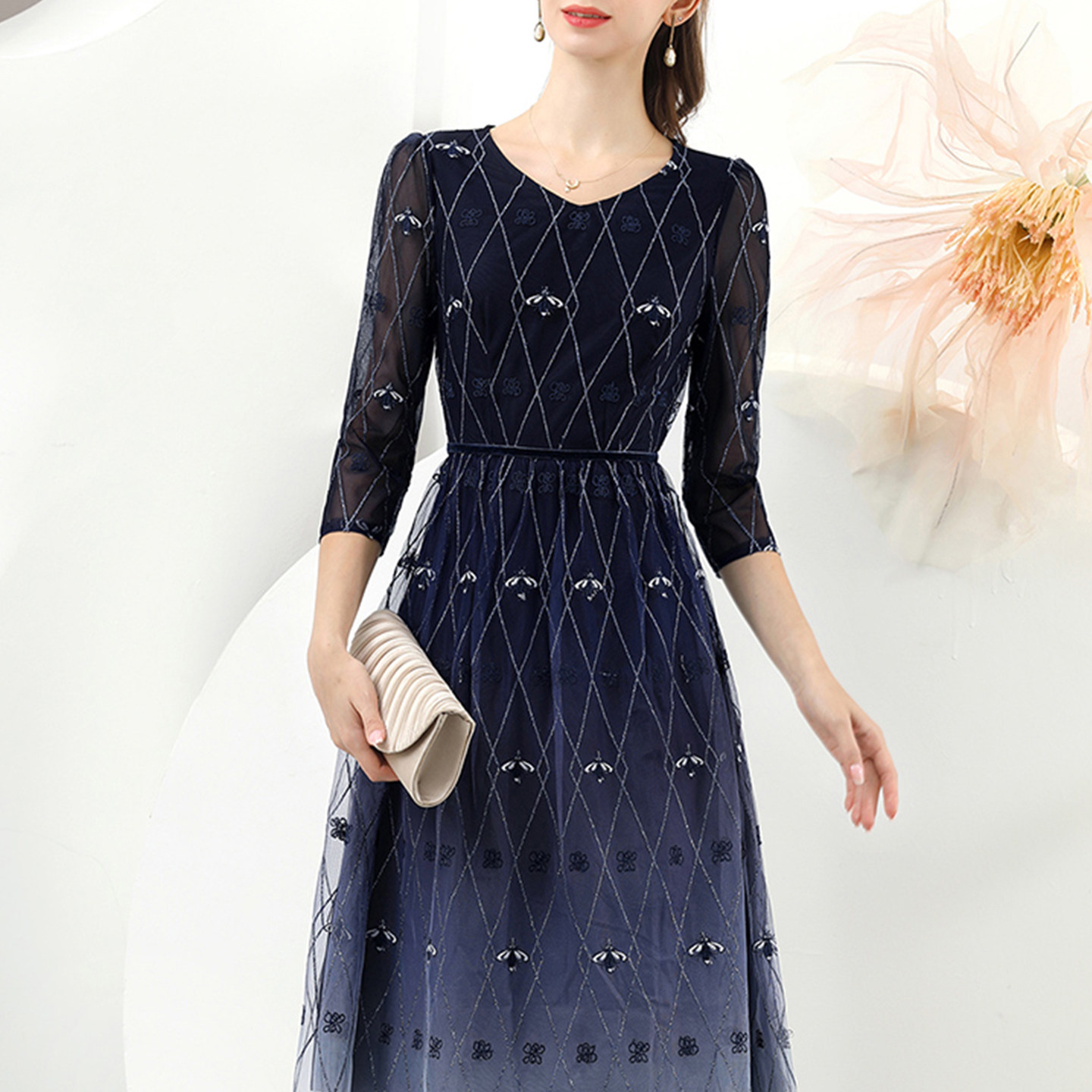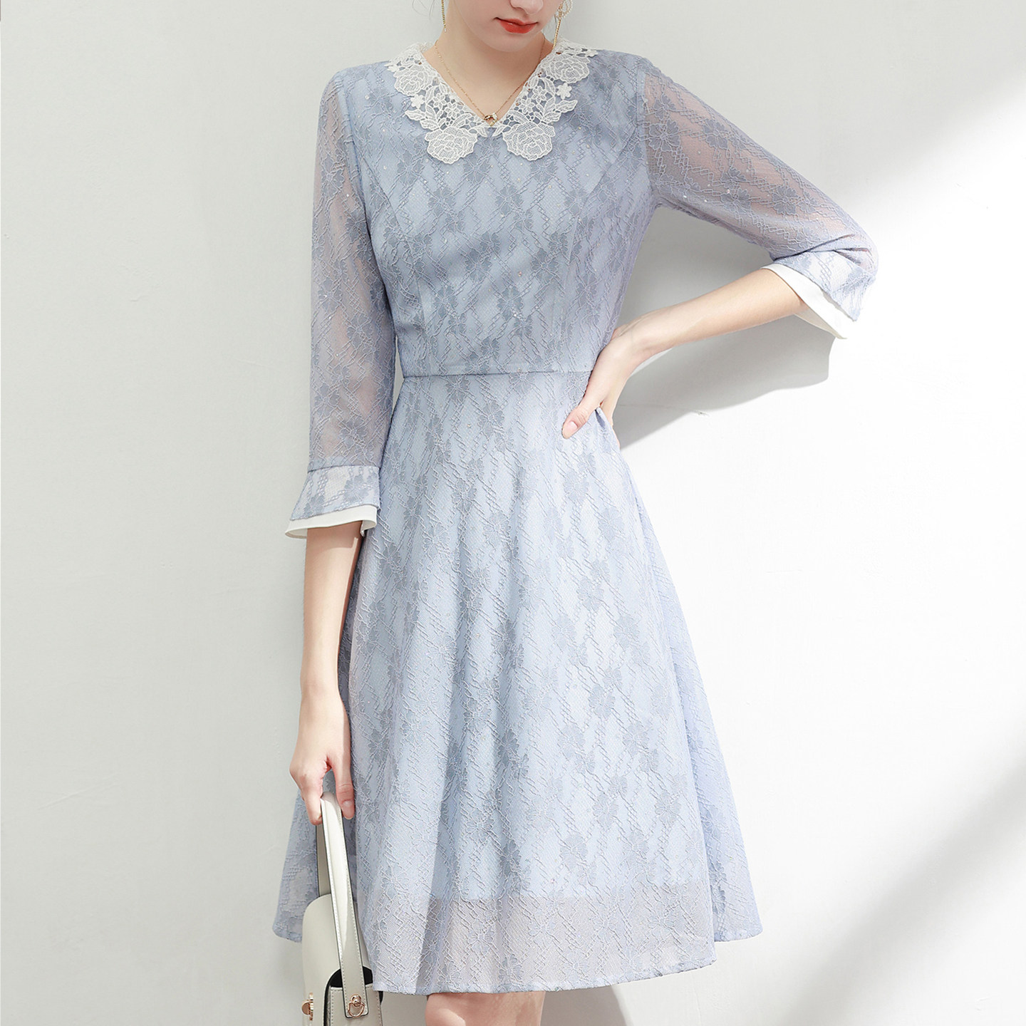 【风迷福利】蕾丝连衣裙女轻奢高级感网纱裙子修身显瘦秋新款长袖