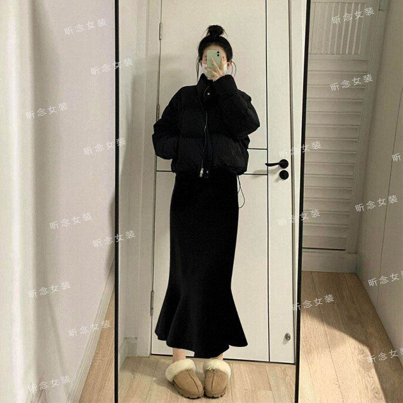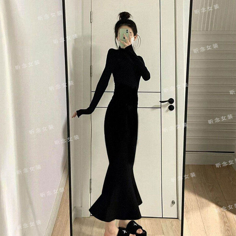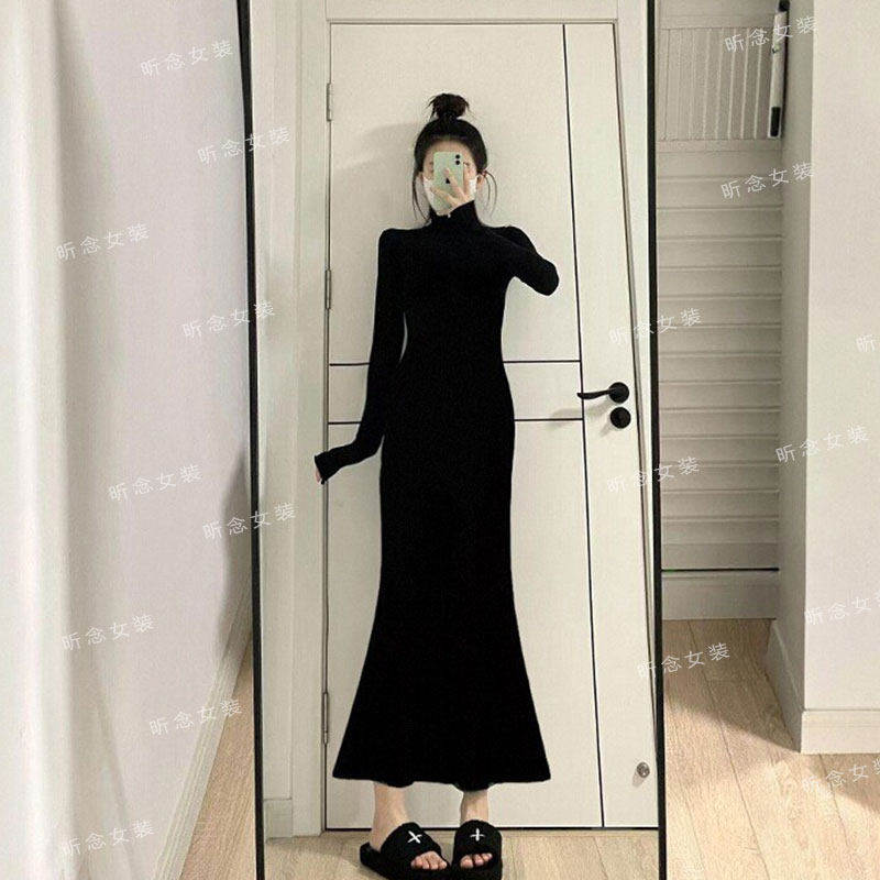 赫本风高级感黑色针织连衣裙女冬季配大衣内搭打底修身长款鱼尾裙