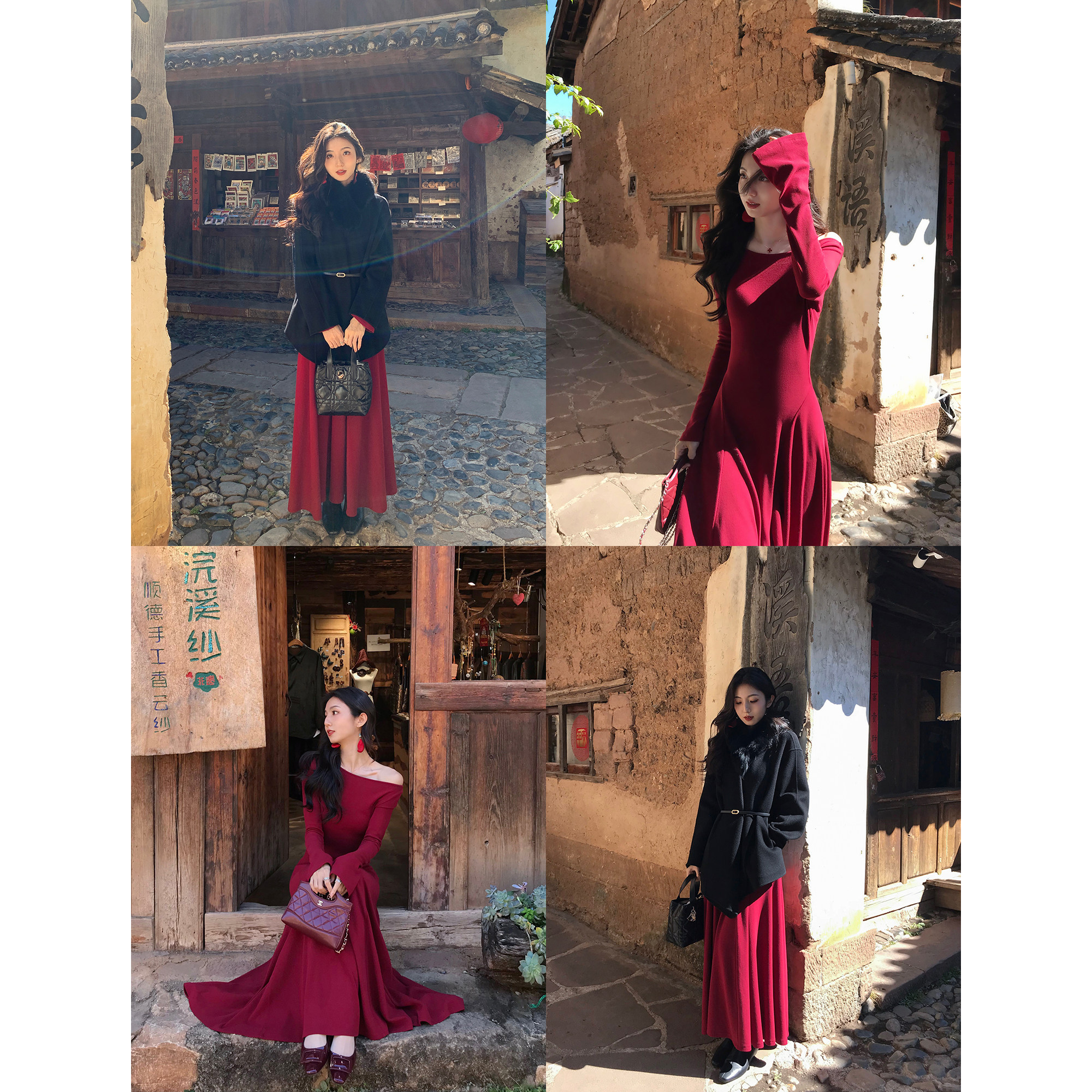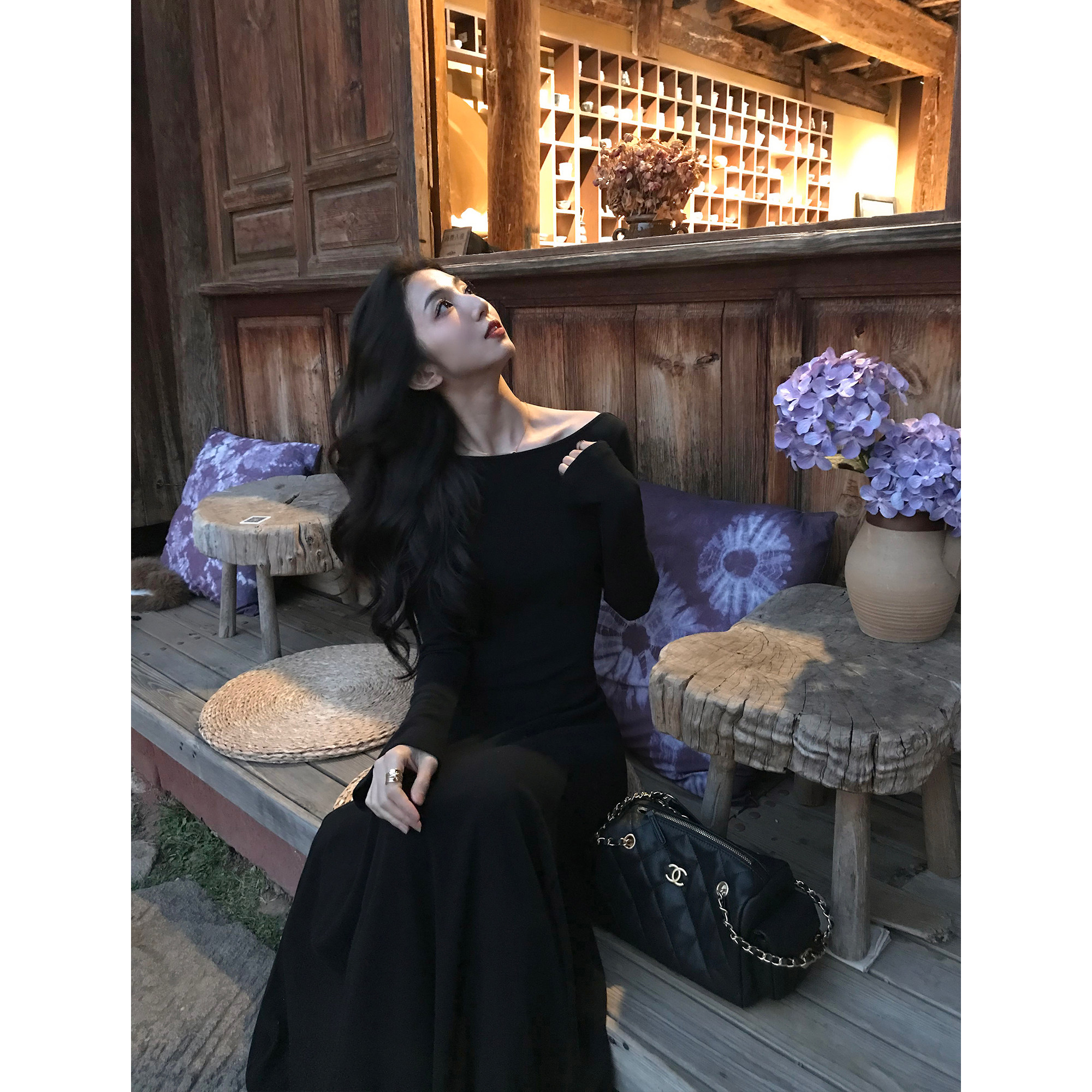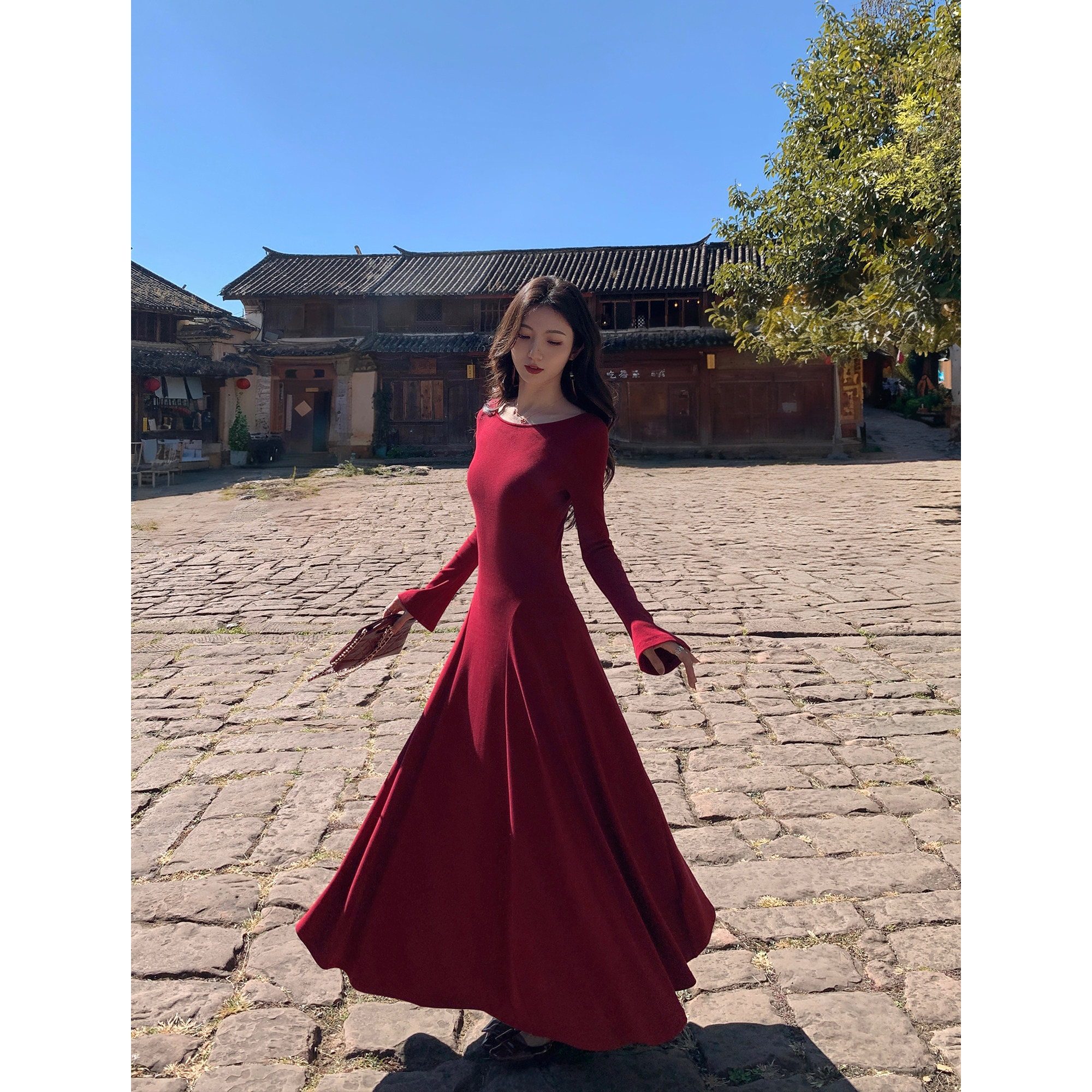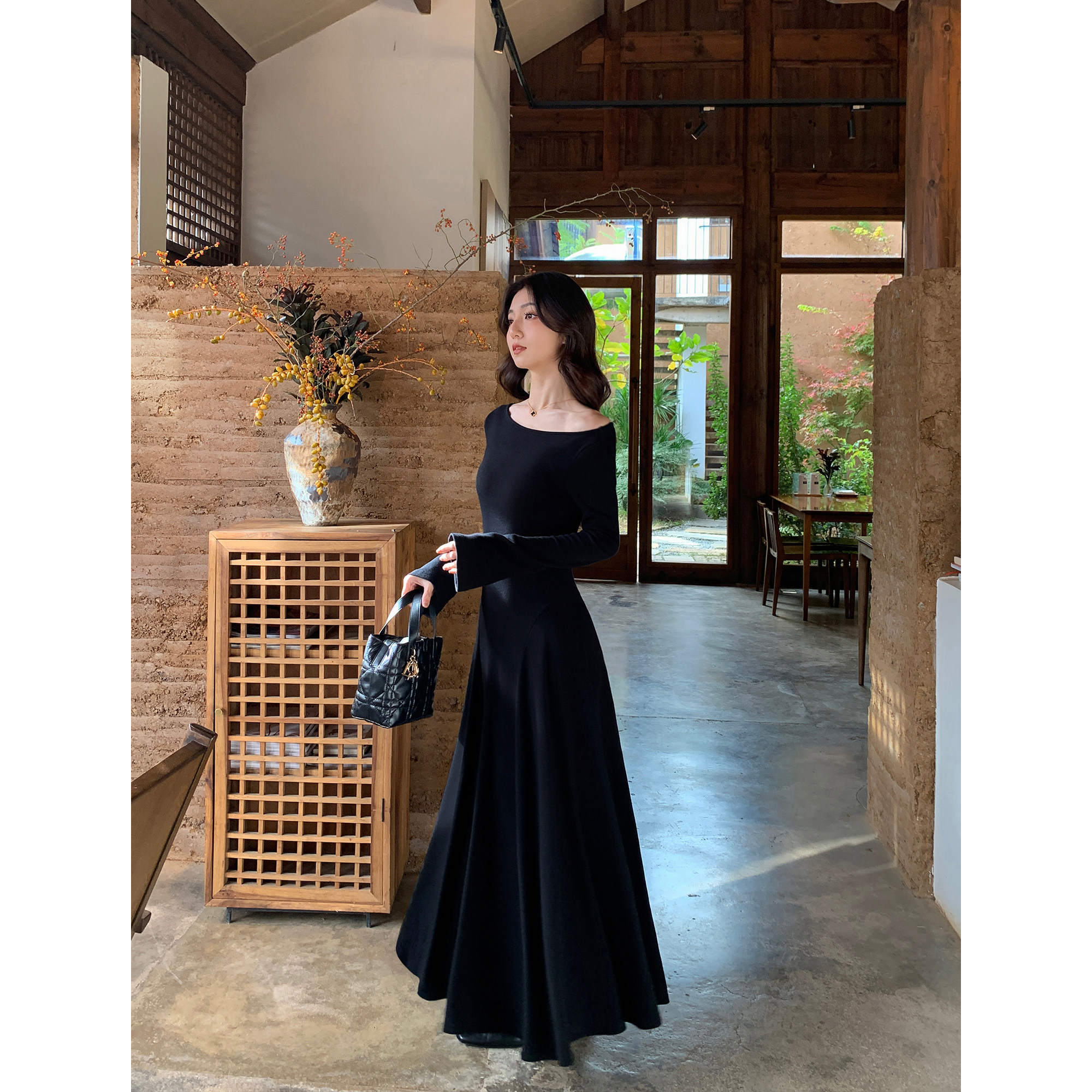 MULVAN 三穿式领型~黑色喇叭袖针织连衣裙女气质修身显瘦内搭长裙
