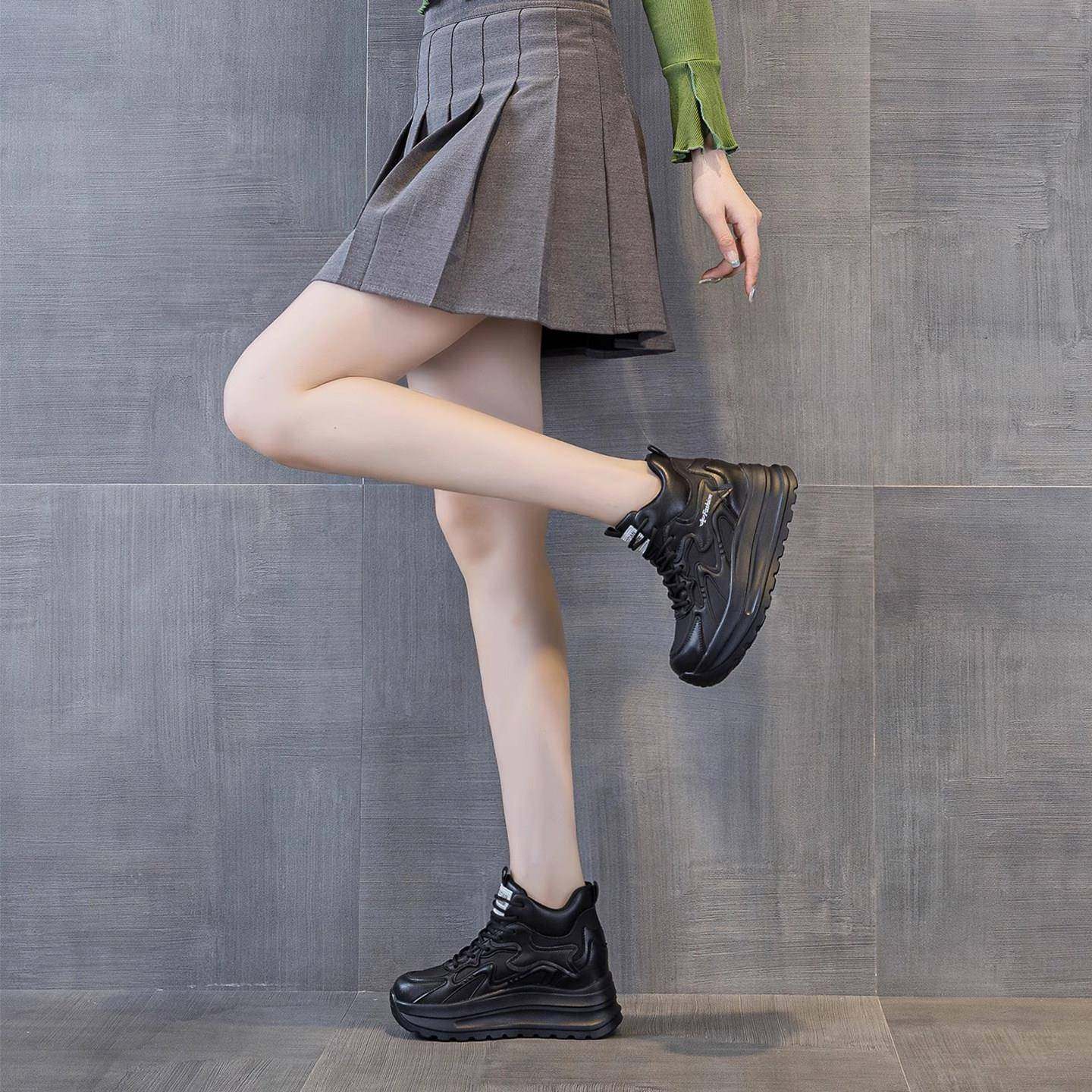 香港皮面厚底老爹鞋女2025冬季加绒内增高休闲运动高帮女鞋不累脚