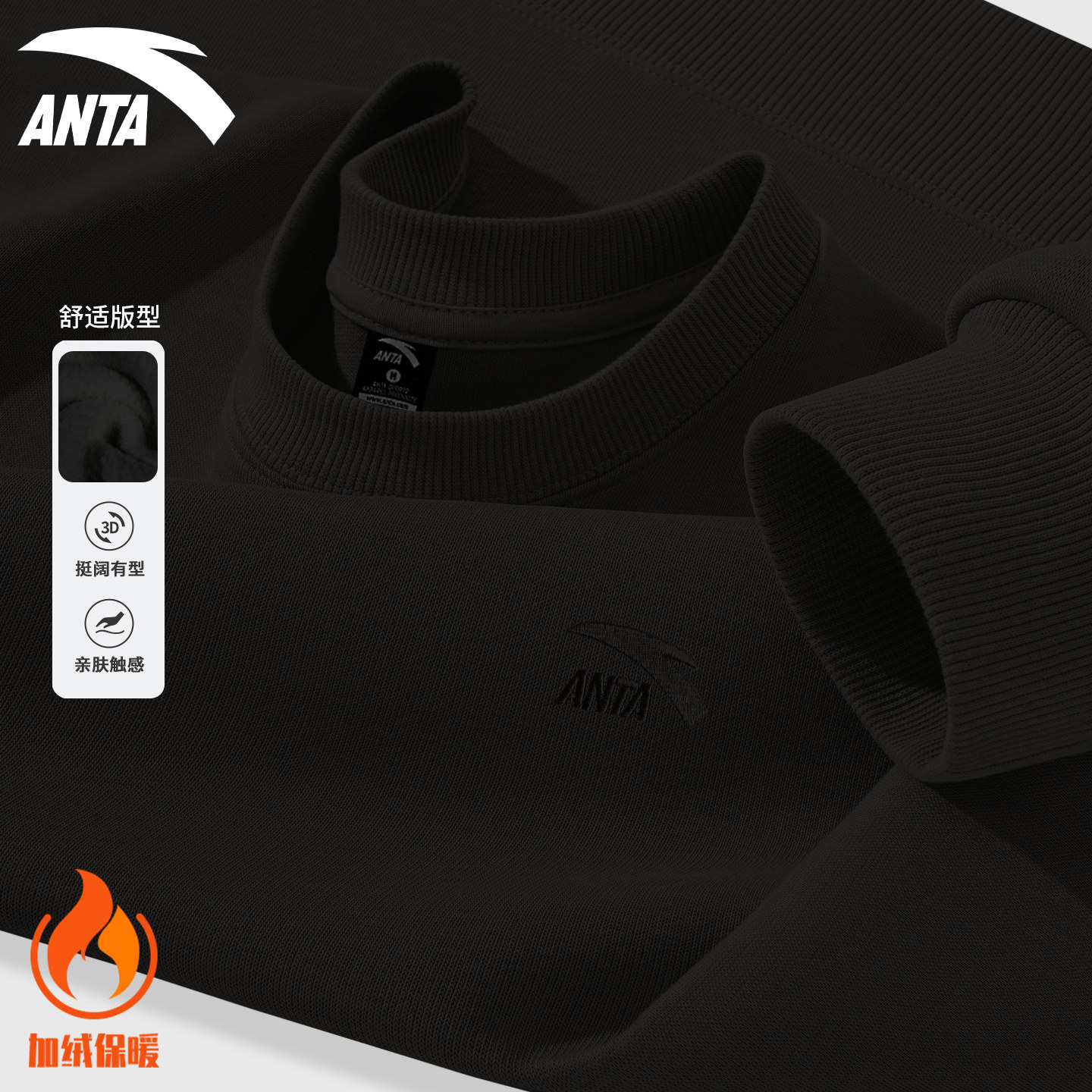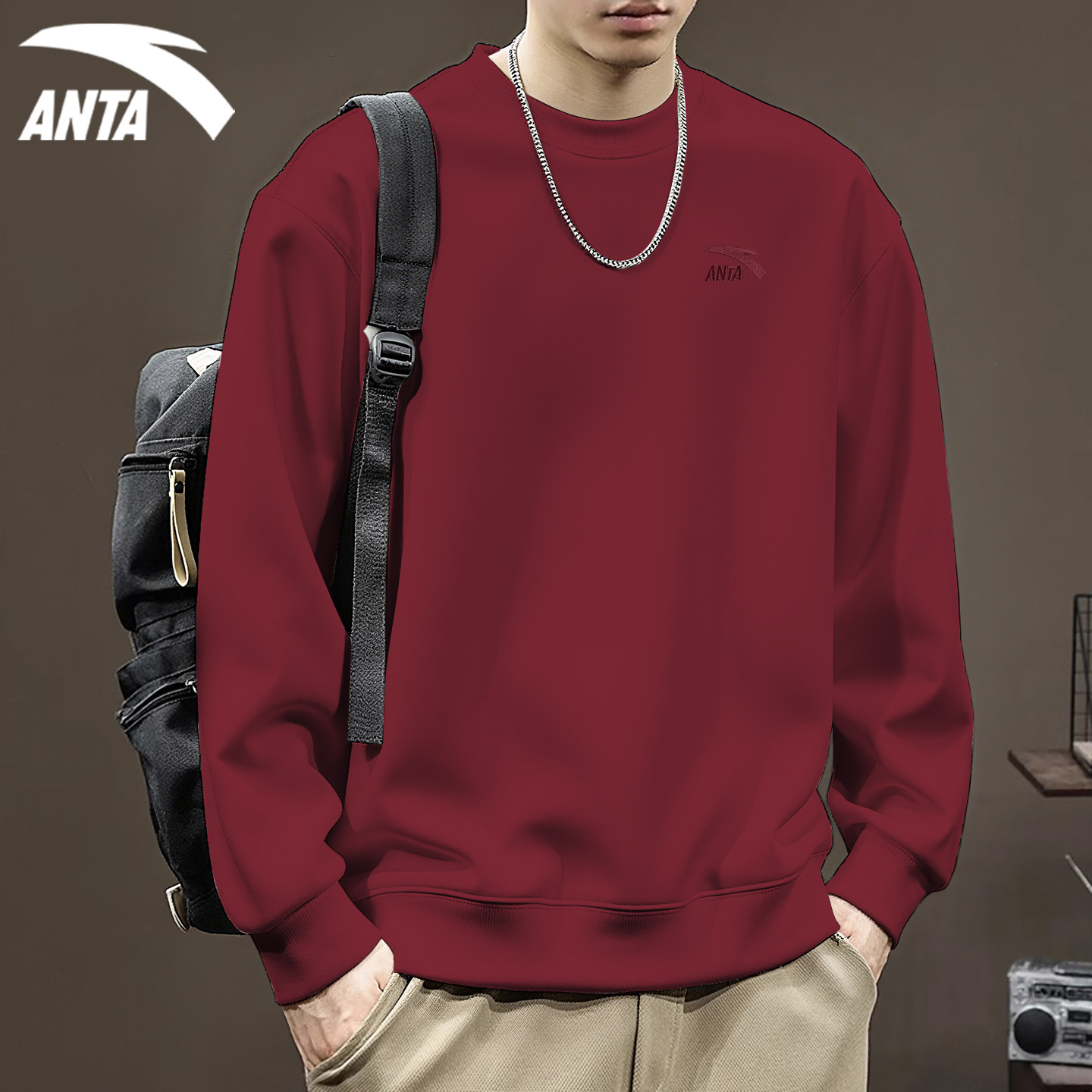 安踏宽松卫衣男新年红色打底衫圆领加绒2025冬季新款潮流运动上衣