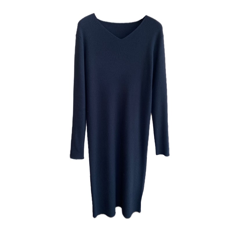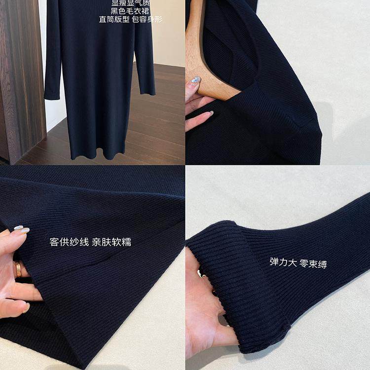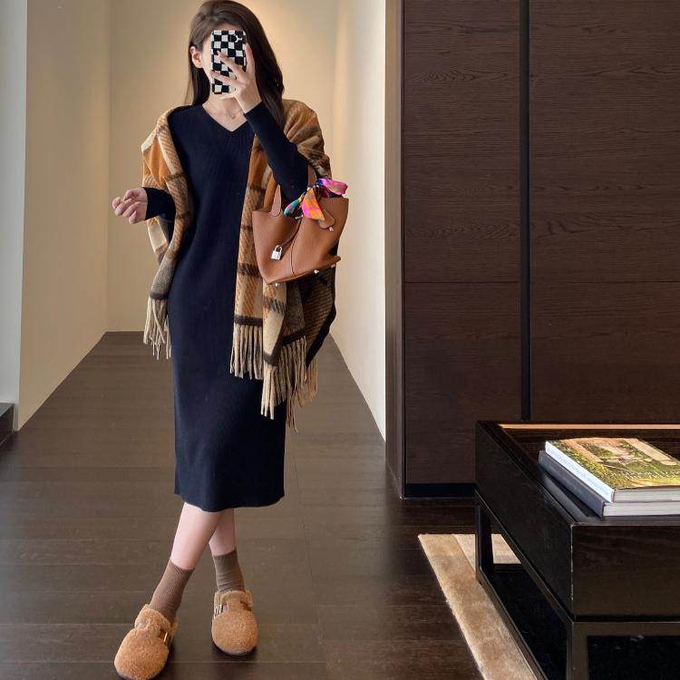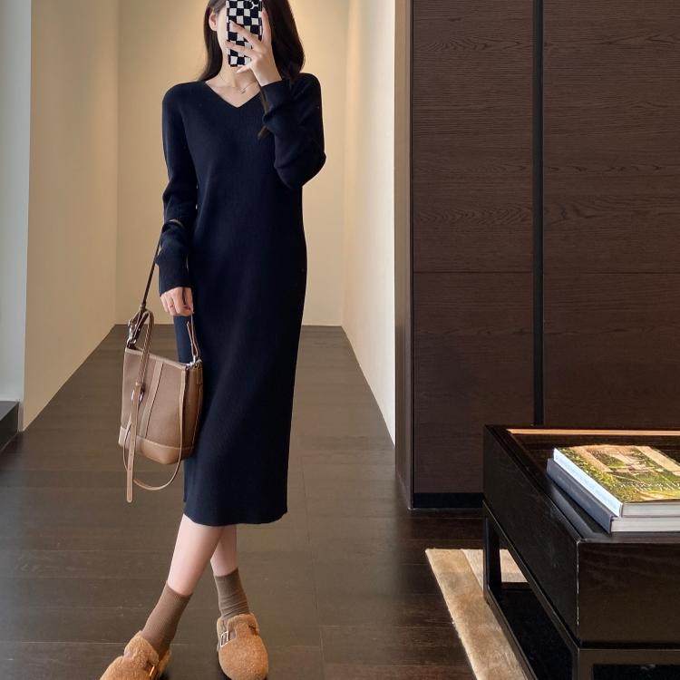 AMR UU◆博主范 气质V领针织裙显瘦小黑裙中长款连衣裙女秋冬新款