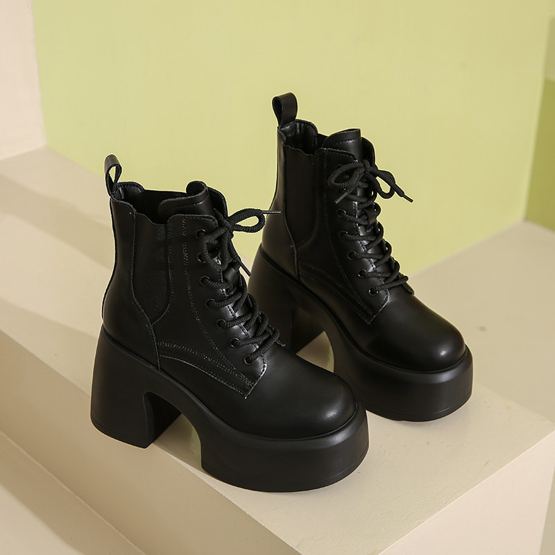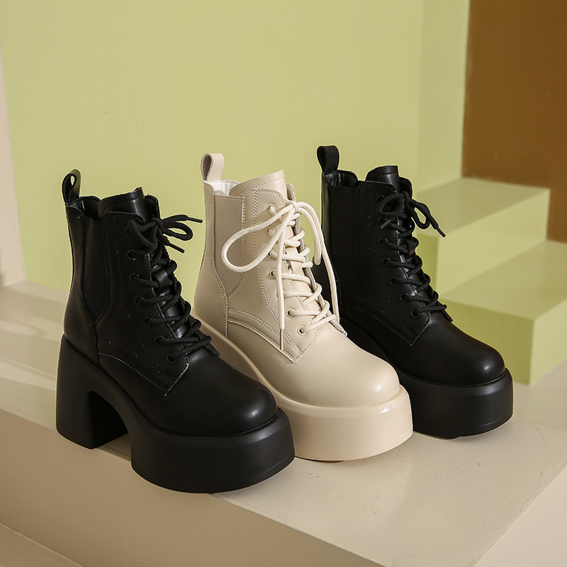 品牌百搭显瘦高跟时装靴女真皮厚底马丁靴2025秋新款白色系带短靴