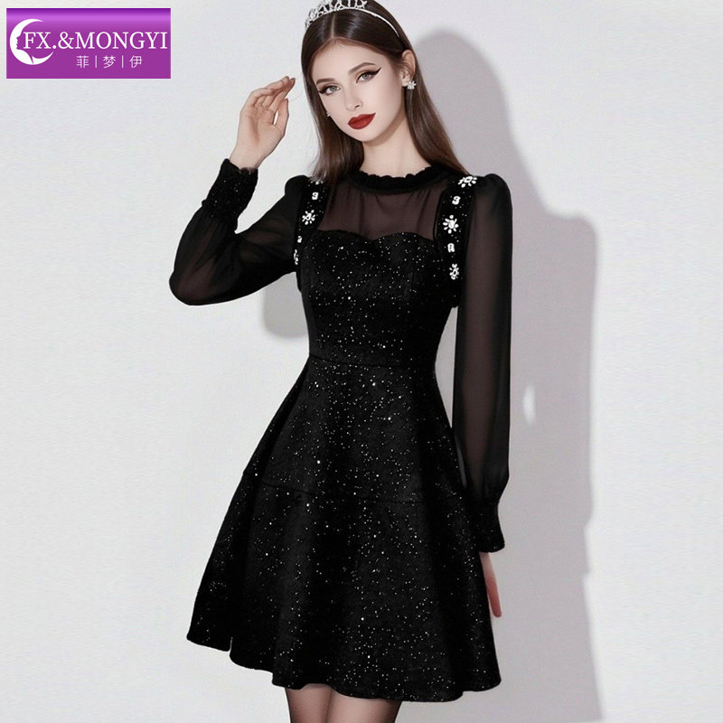 菲梦伊烫钻黑色衬衫连衣裙女长袖春季法式小香风名媛收腰A字短裙