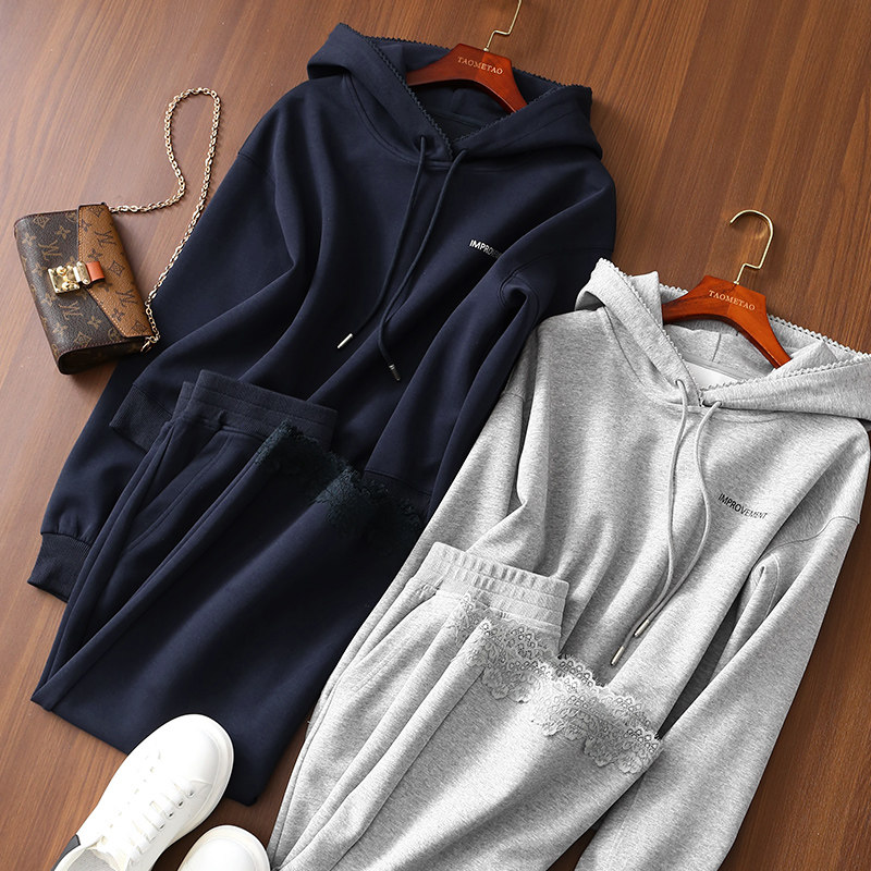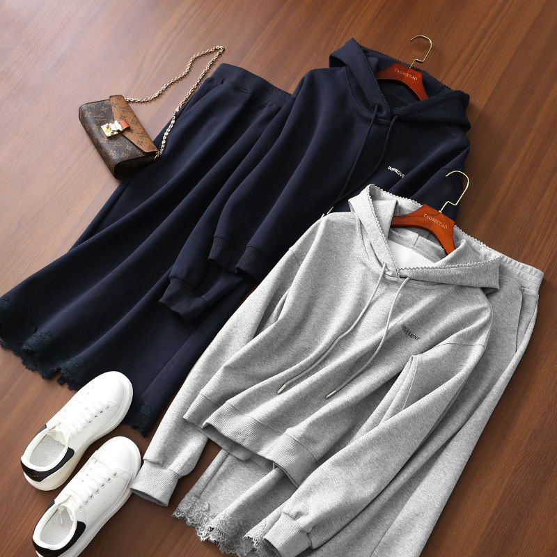 淘么淘 都市松弛派 字母蕾丝花边连帽卫衣半裙套装女2026早春新款