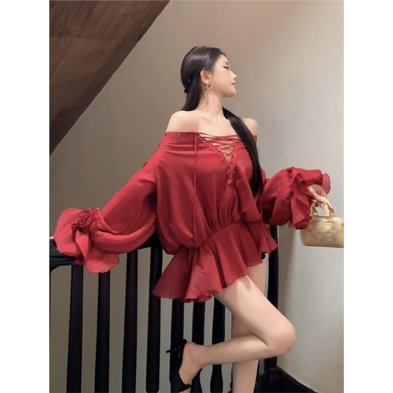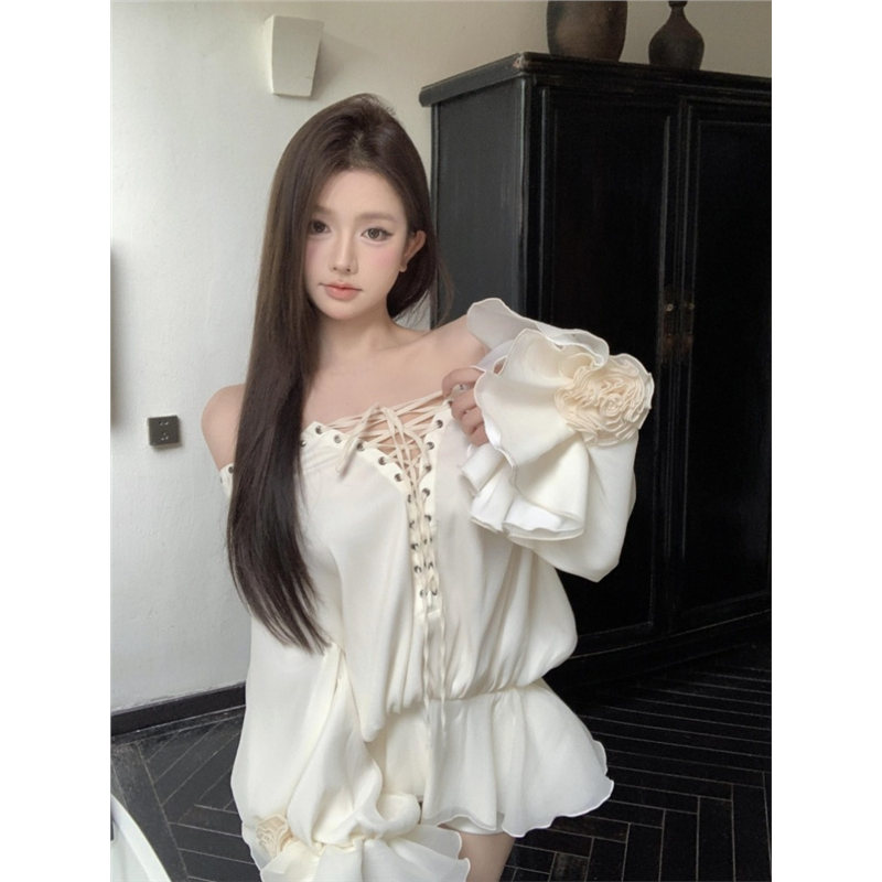 一字肩花朵绑带长袖连衣裙女夏季法式白色短裙设计感收腰a字裙子