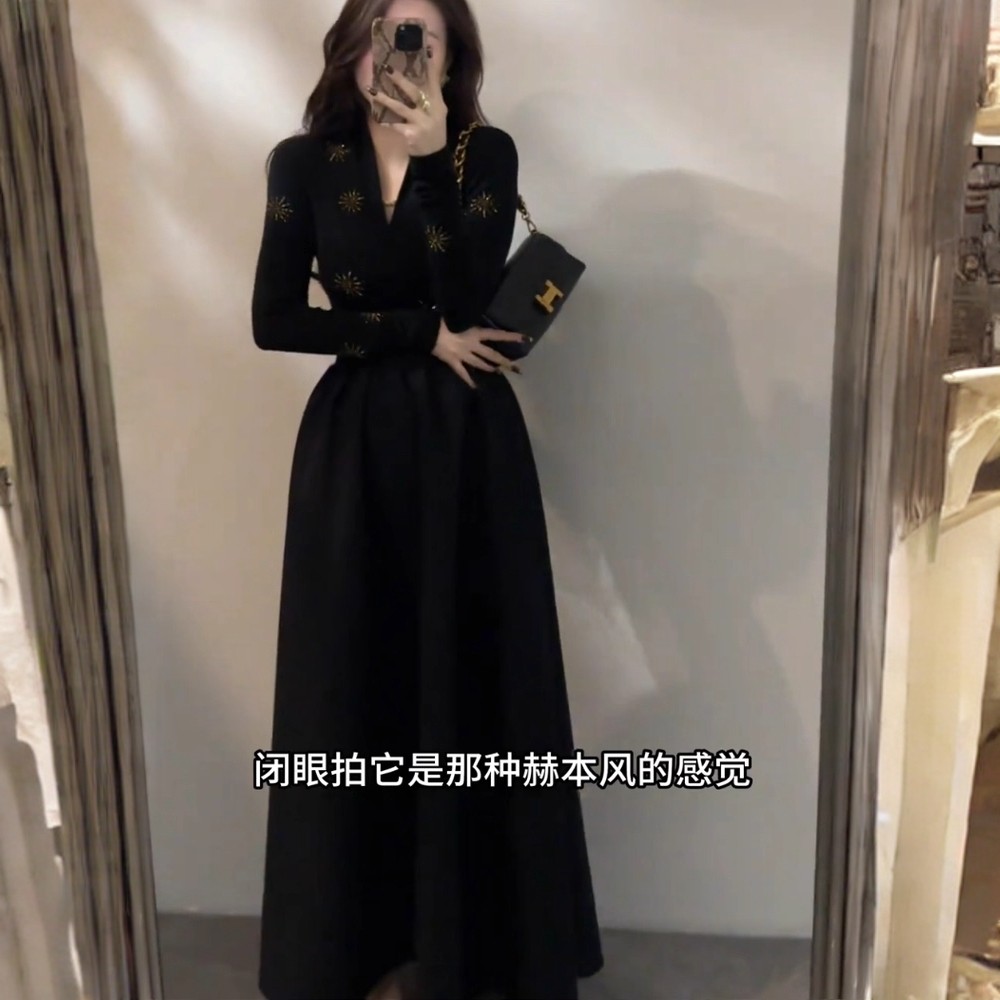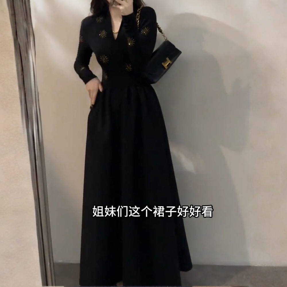 法式重工烫钻黑色长袖连衣裙女2025新款秋季裙子气质收腰打底长裙