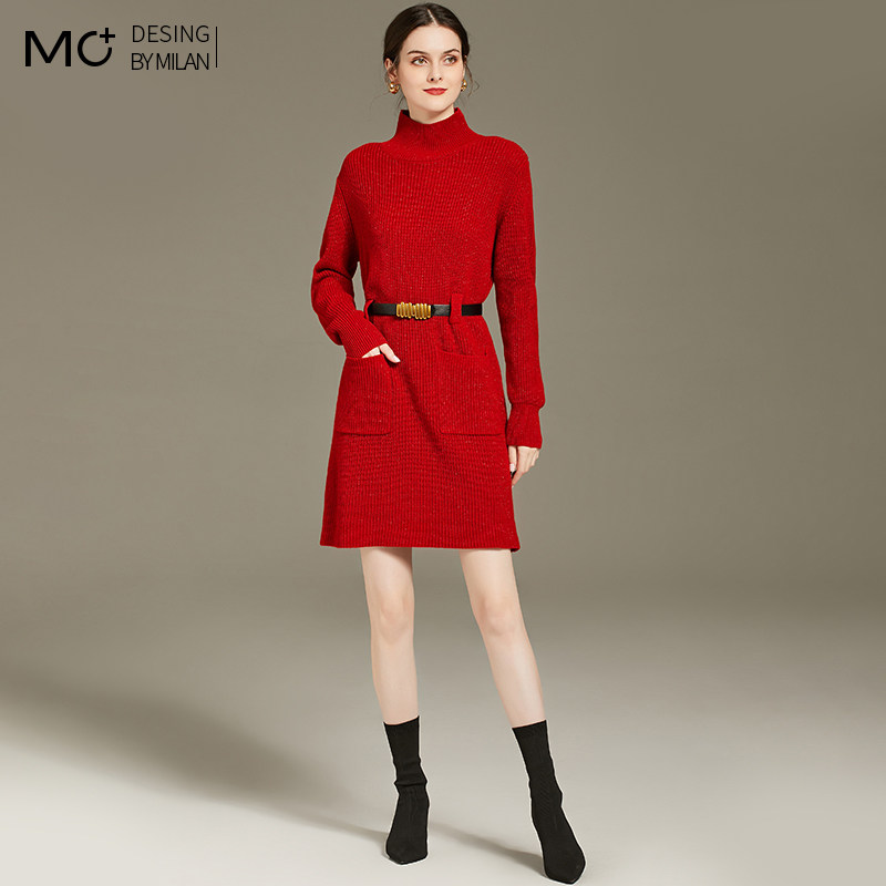 高领毛衣女中长款2025秋冬新款红色羊毛衫收腰时尚亮丝针织连衣裙