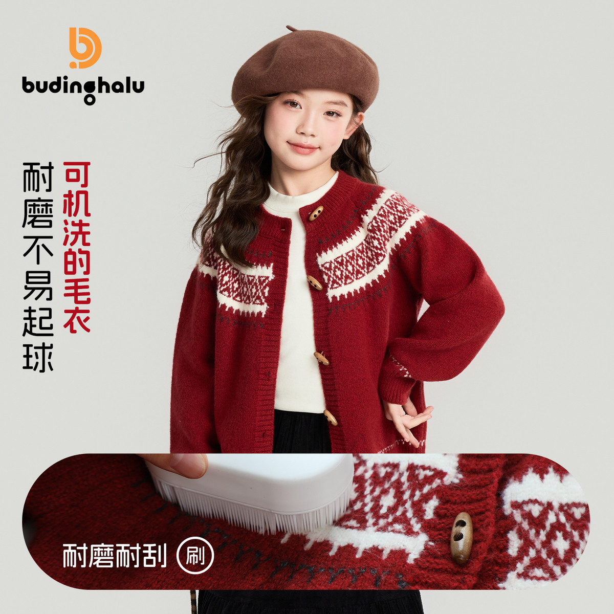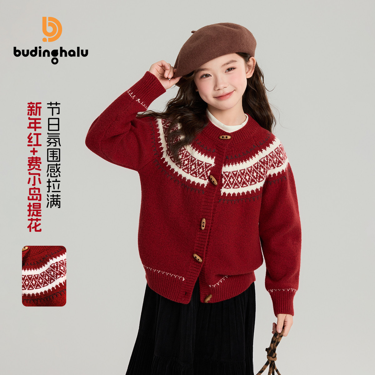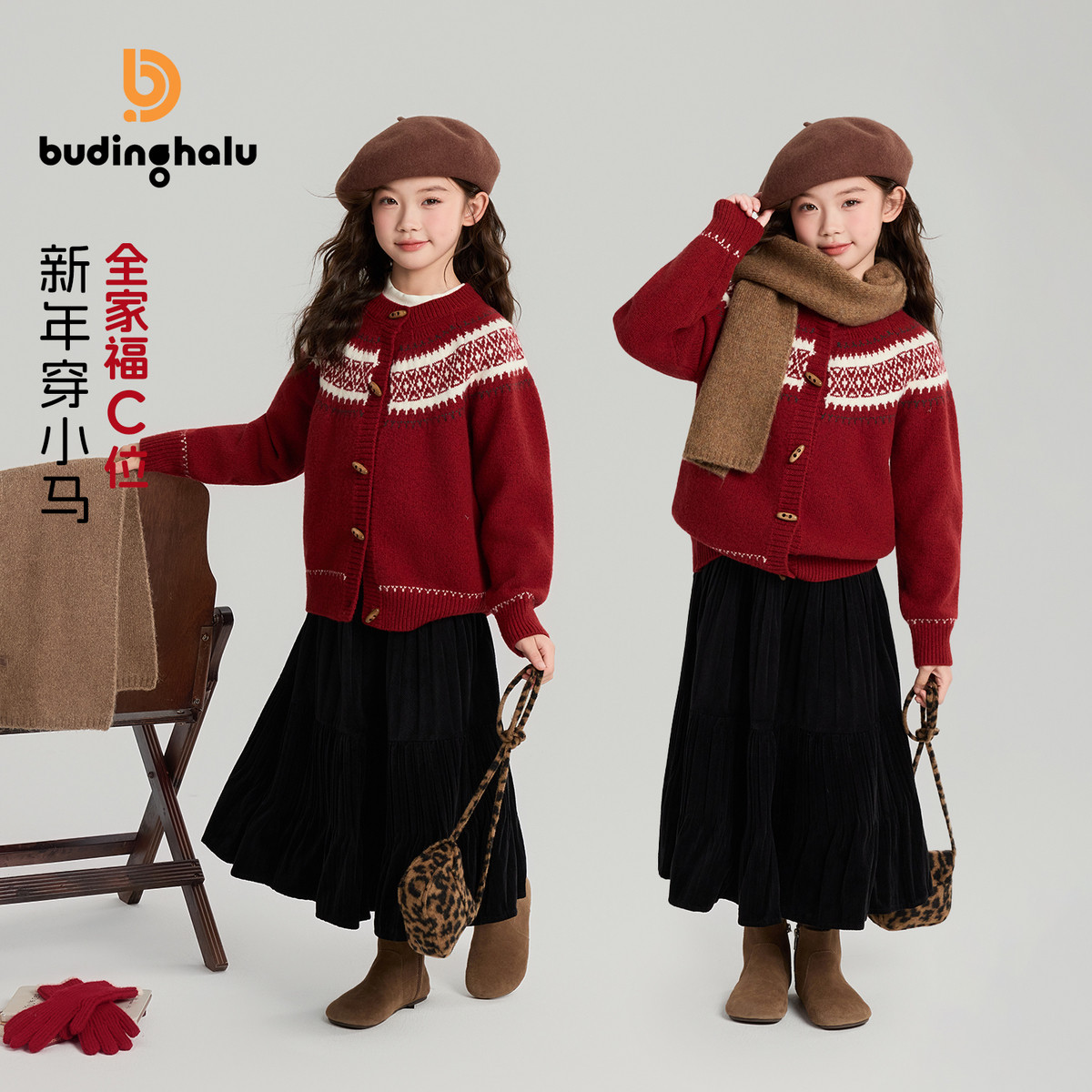 布丁哈鲁冬装女童童装上衣2026秋冬季新款儿童复古新年毛衣开衫