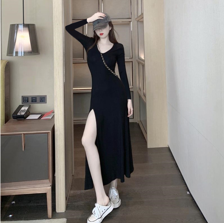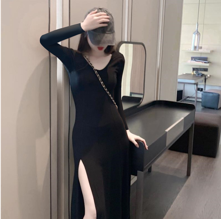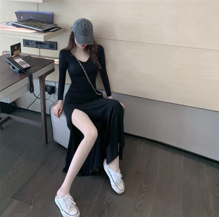 秋装2020年新款女大码长袖连衣裙收腰显瘦显高气质黑色长款连衣裙