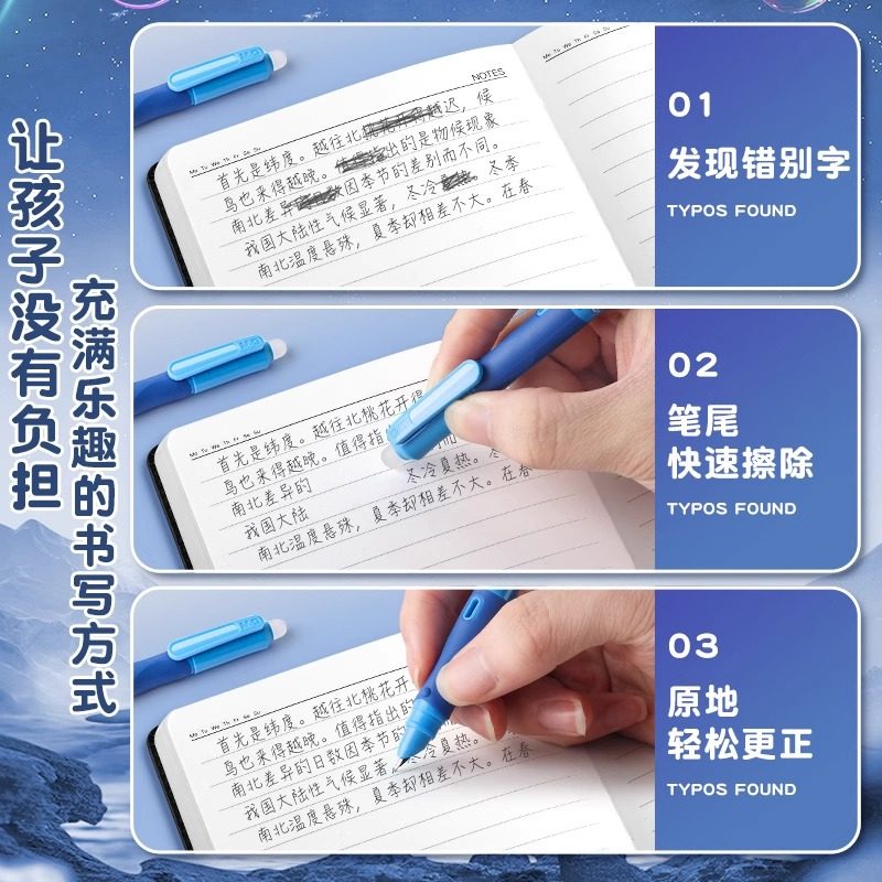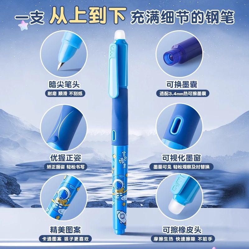 晨光优握热可擦钢笔套装三年级小学生专用3.4mm儿童练字刚笔高颜值钢笔热敏可擦可替换墨囊晶蓝黑色墨蓝色