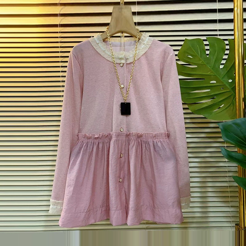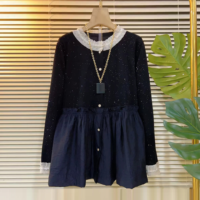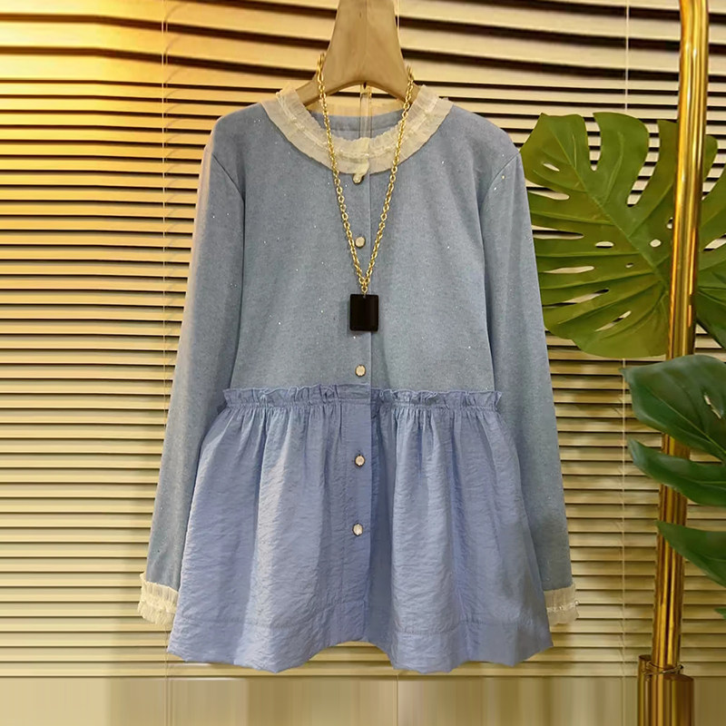 加肥女拼色压褶领长袖小衫胖妹妹甜美减龄淑女风2026早春新款上衣
