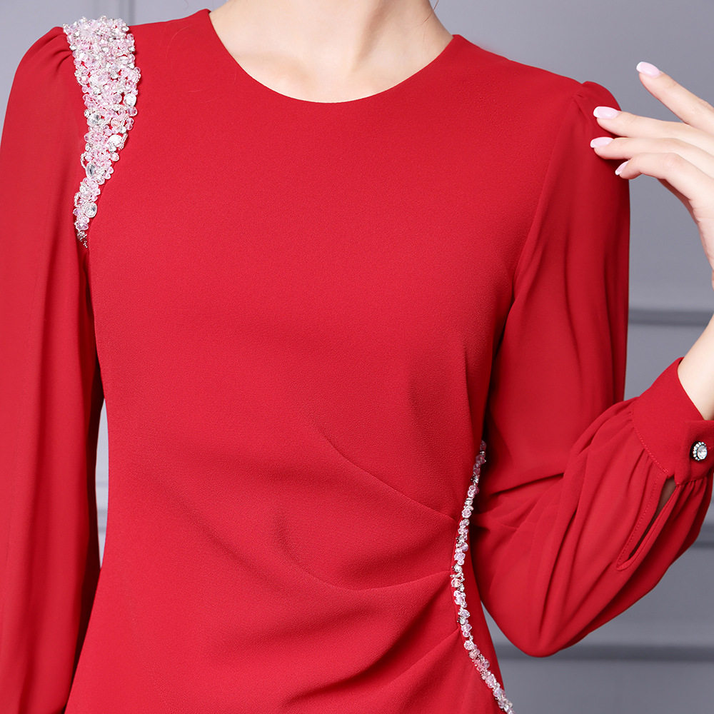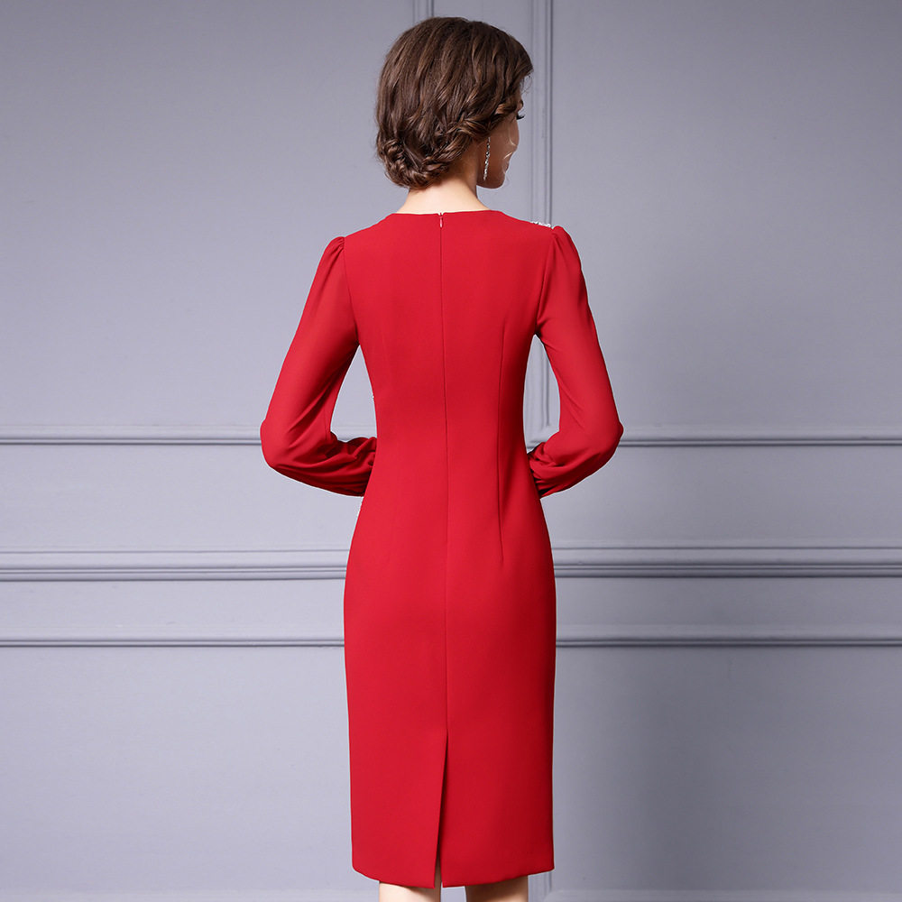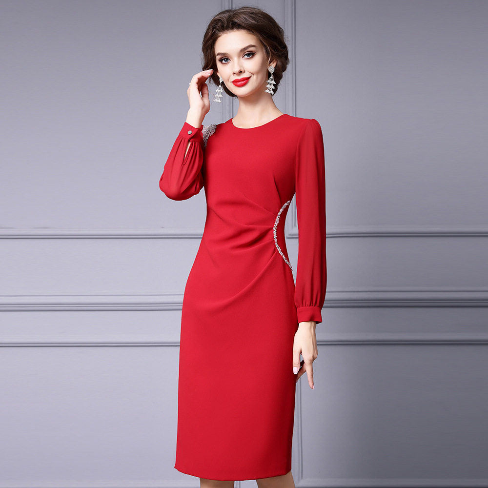 星译修身显瘦秋连衣裙女高级感2025新款轻奢长袖钉钻红色礼服裙子