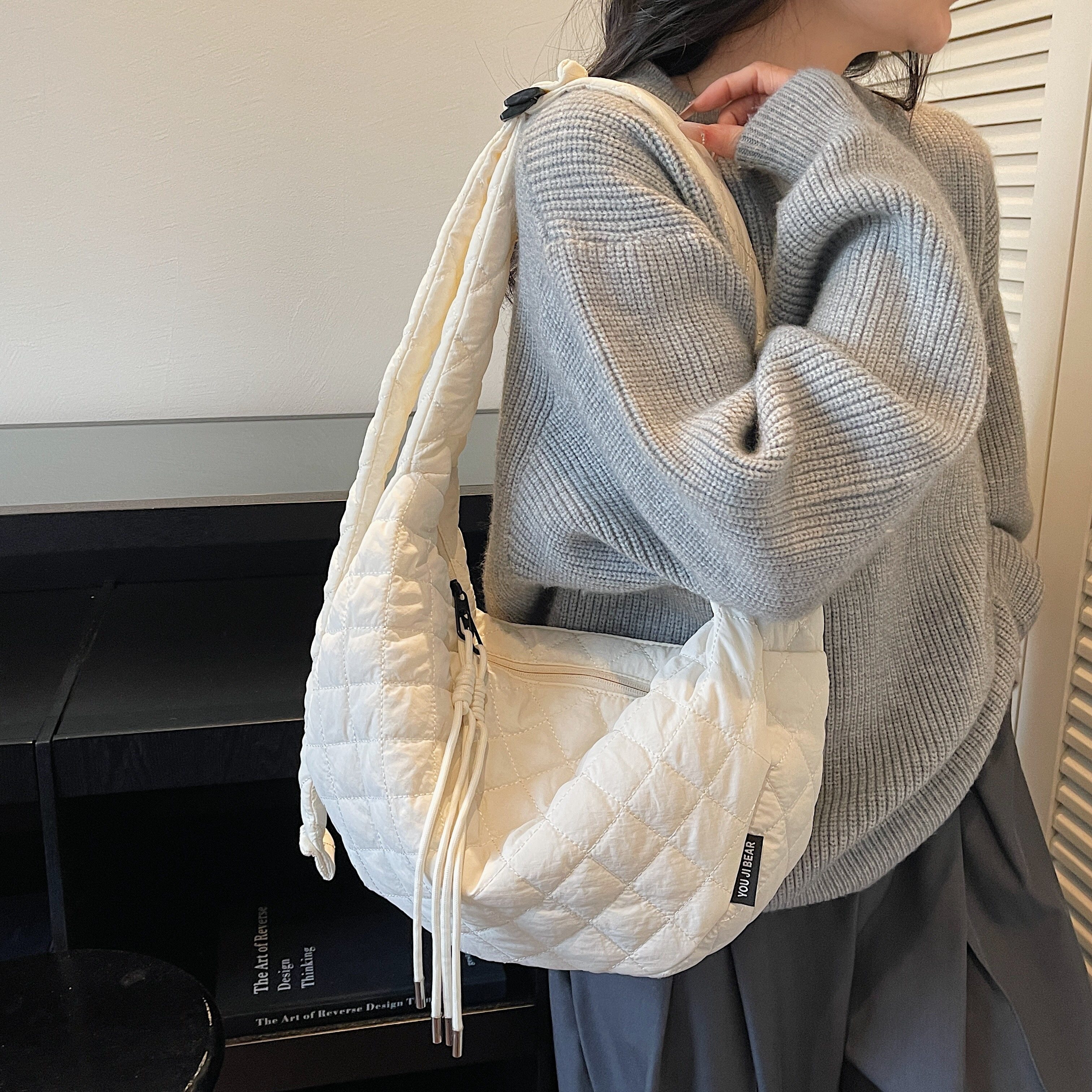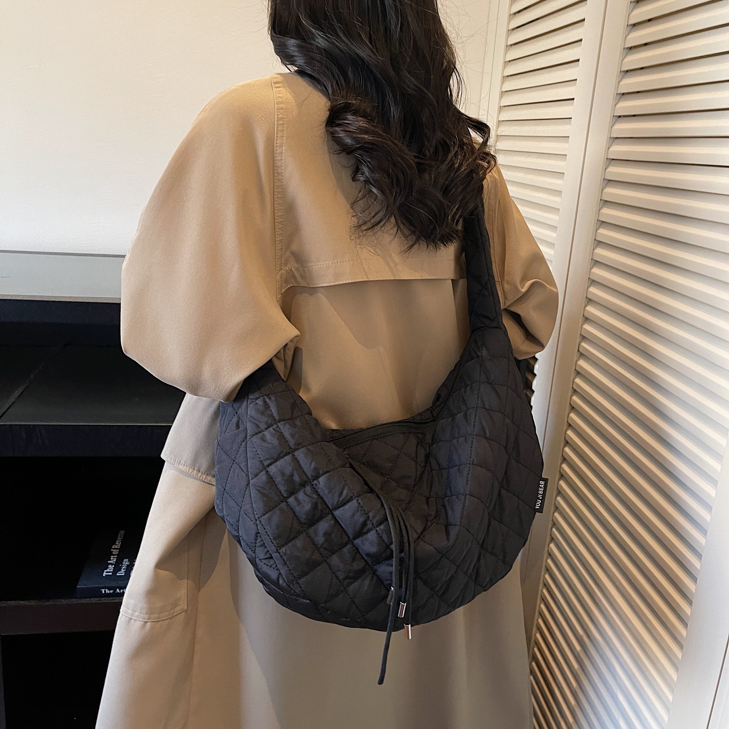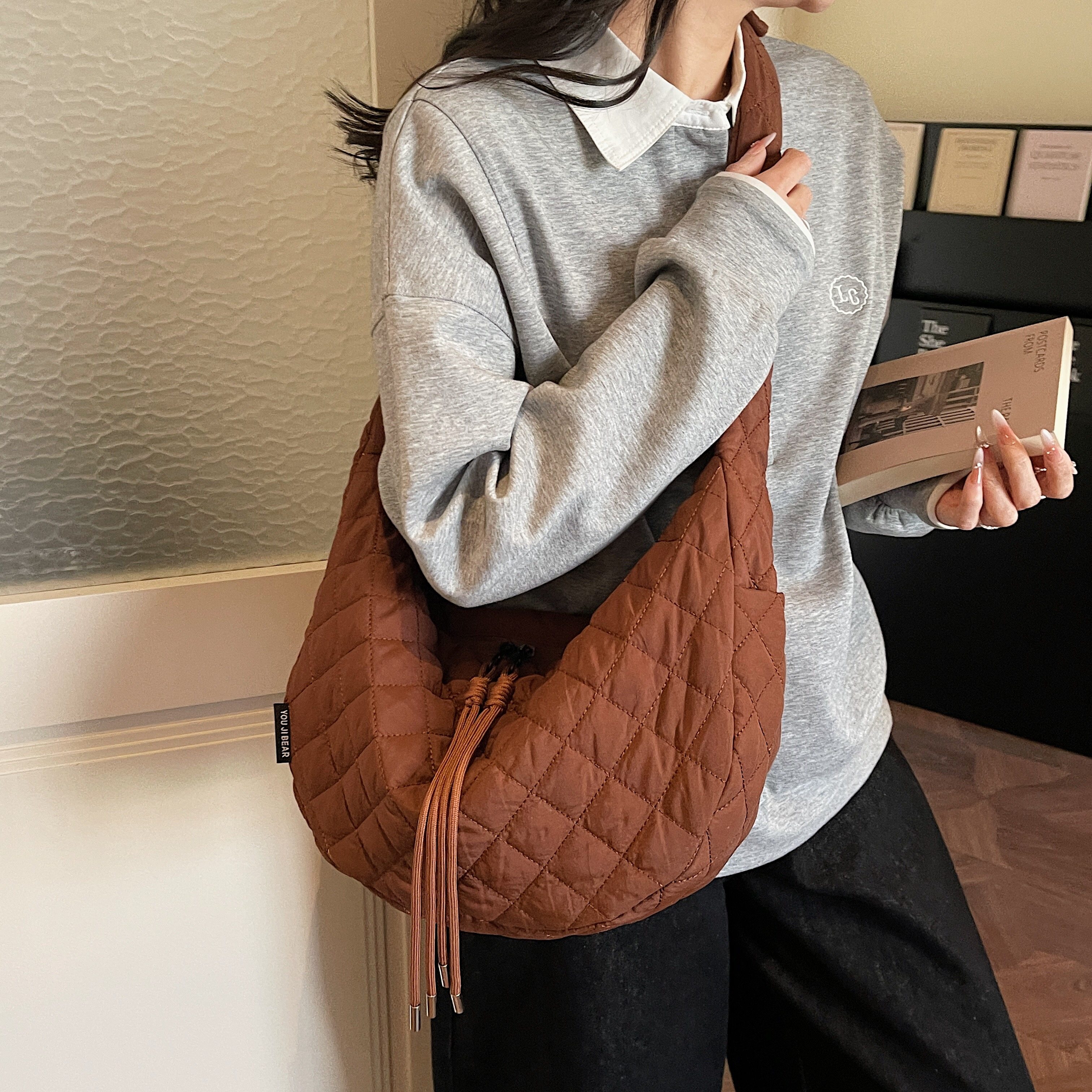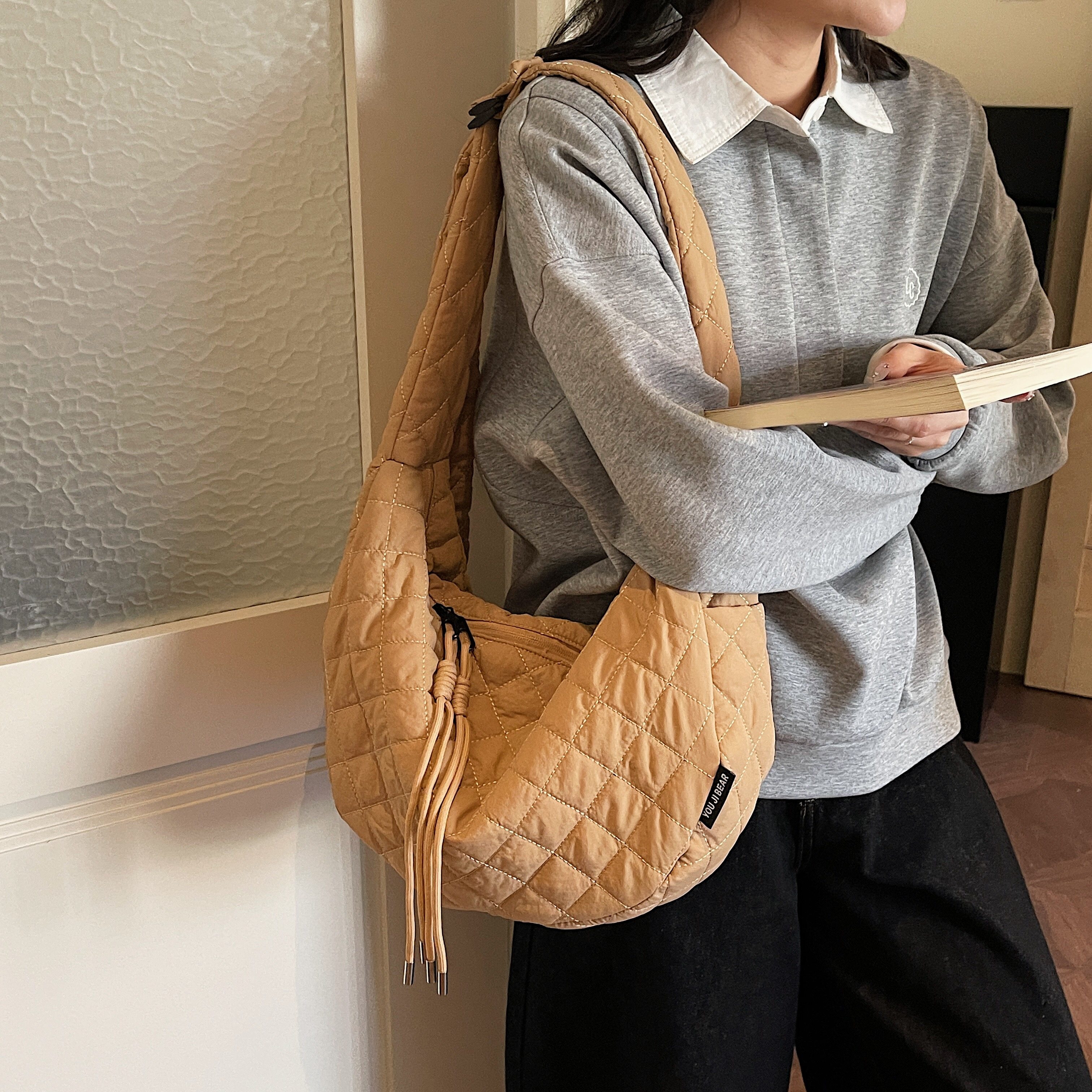 韩系棉服包包斜挎女款日常通勤百搭绗缝夹棉包咖色经典休闲饺子包