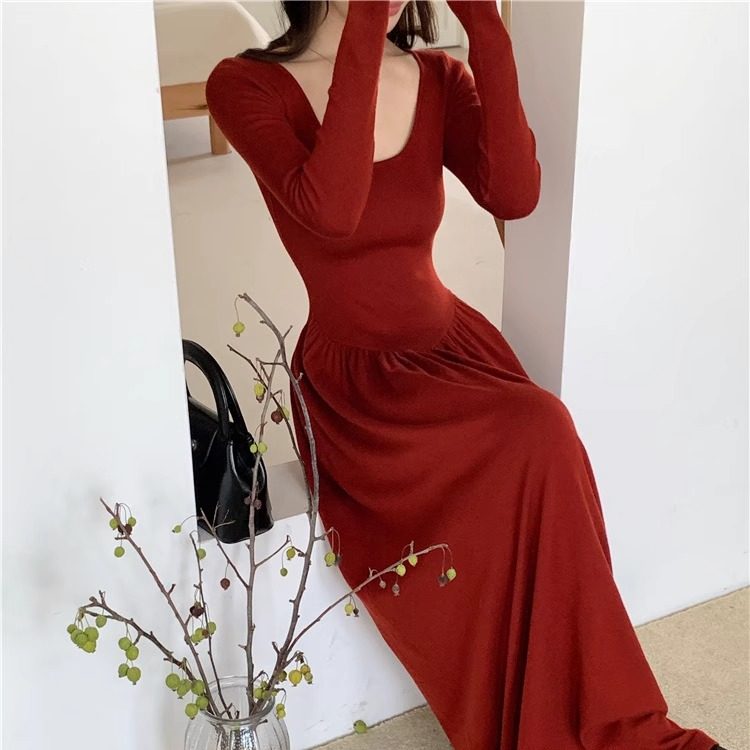 港风复古u领羊毛针织连衣裙长袖A字收腰打底修身显瘦气质芭蕾长裙
