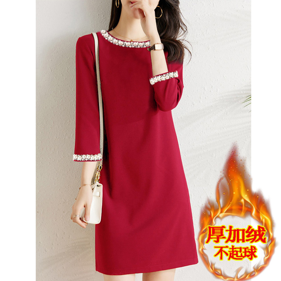 不起球高档纯棉红色连衣裙加绒秋冬季显瘦遮肉小个子收腰礼服裙子