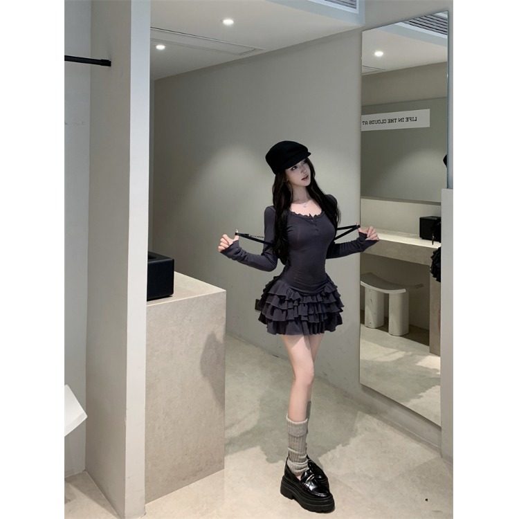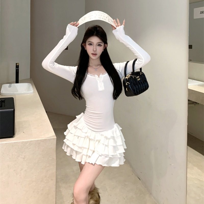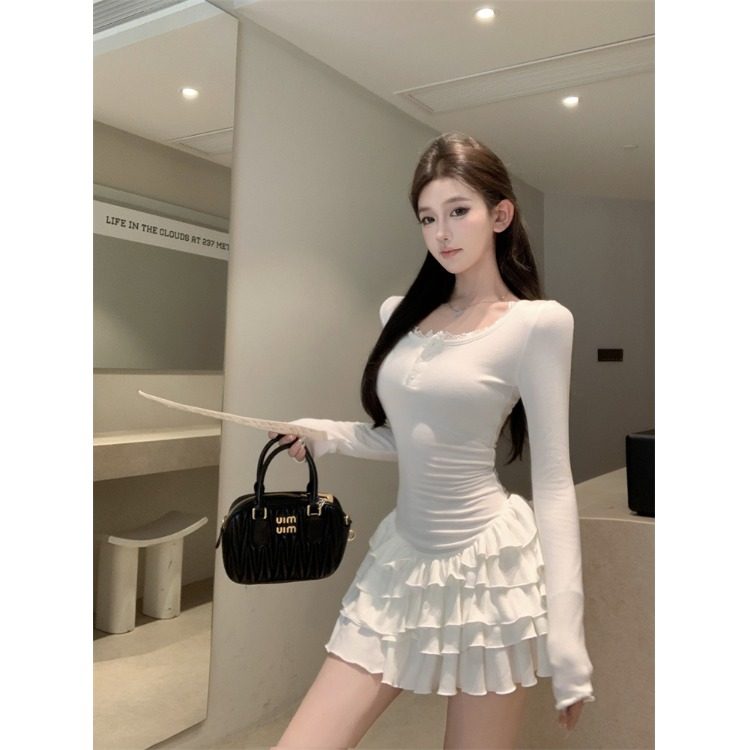白色假两件长袖连衣裙女秋冬芭蕾风内搭打底裙子蛋糕蓬蓬a字短裙