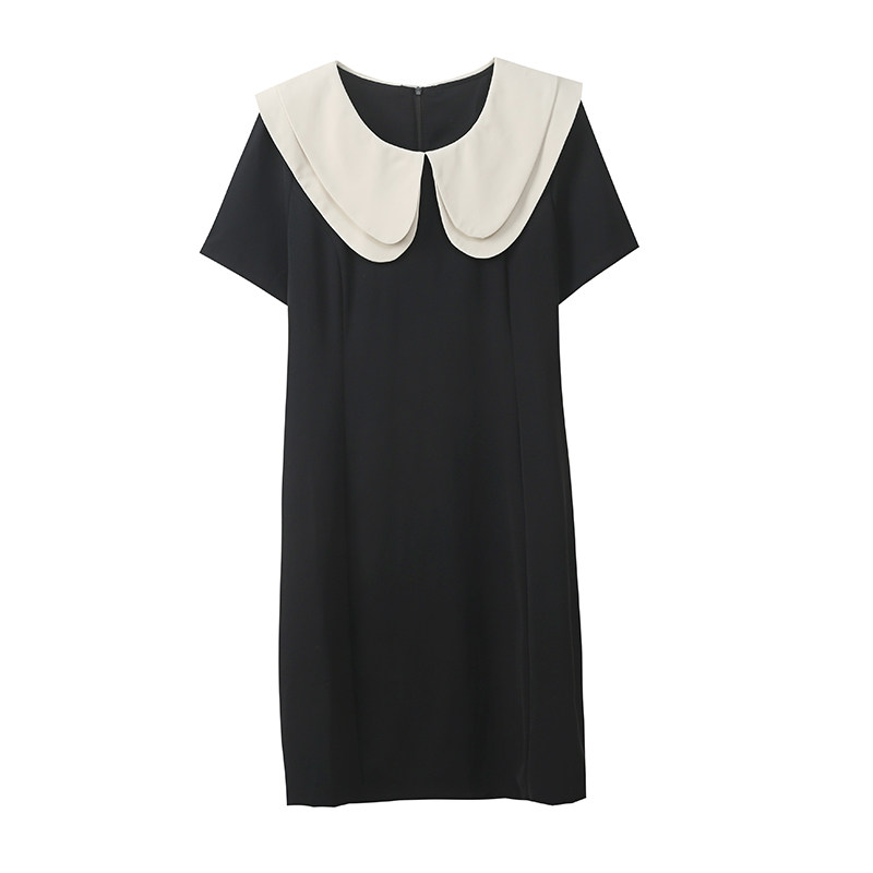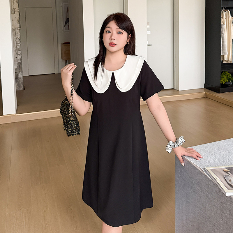 大码女装赫本风撞色娃娃领黑色连衣裙女夏新款胖mm长短款显瘦裙子