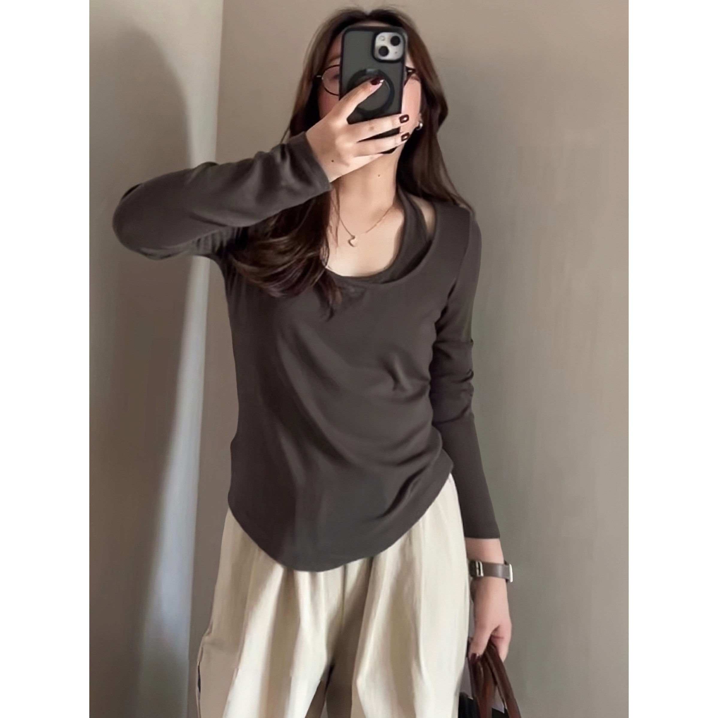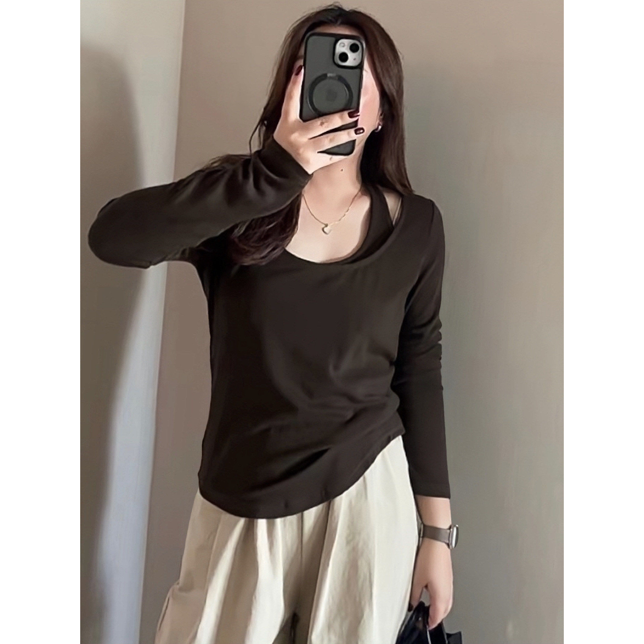 大码女装2026春季新款胖MM氛围感穿搭修身假两件正肩长袖T恤上衣