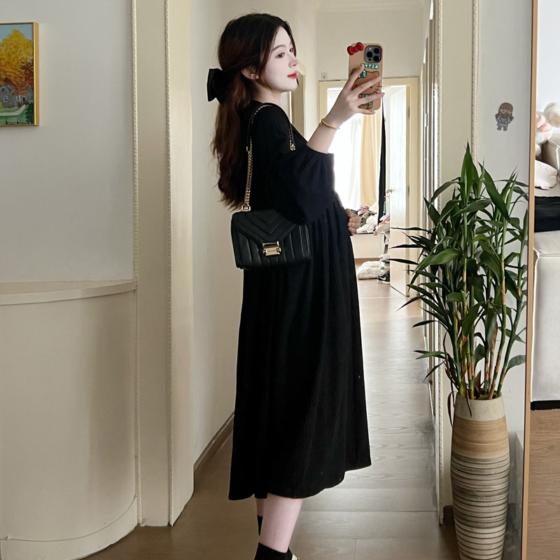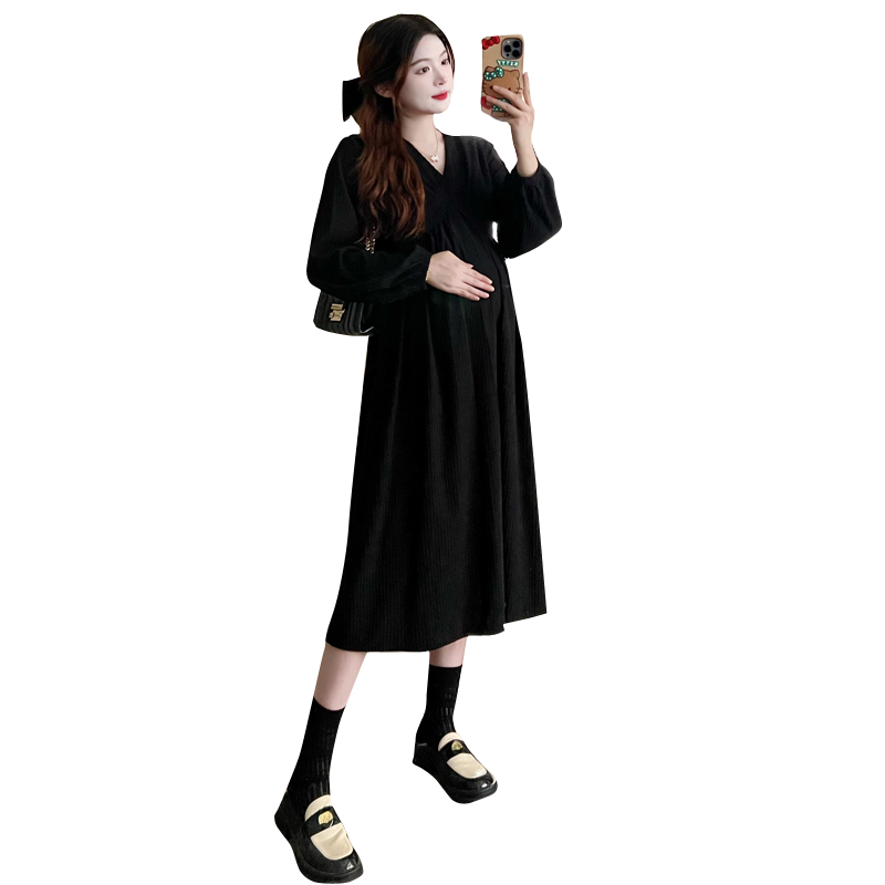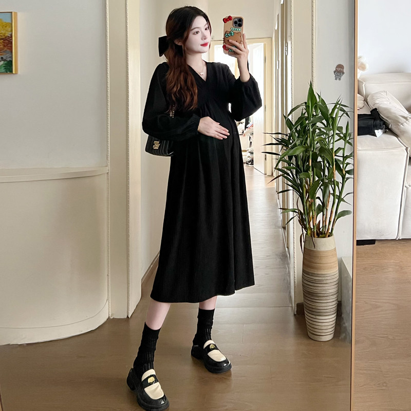 大码孕妇装秋冬装加厚灯芯绒V领收腰小黑裙中长款200斤宽松连衣裙