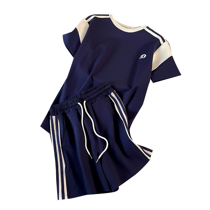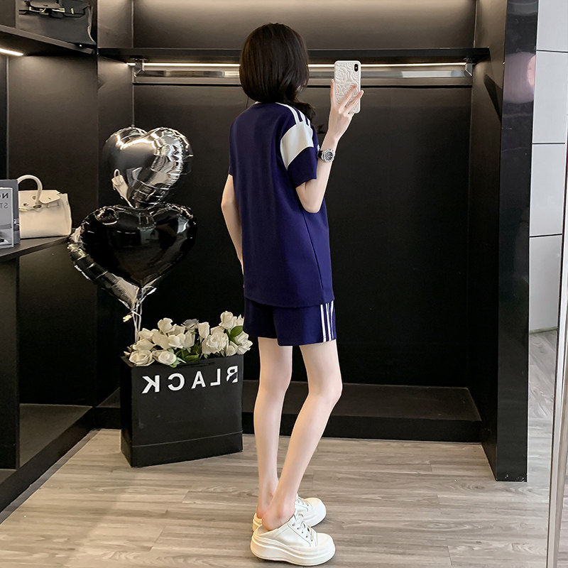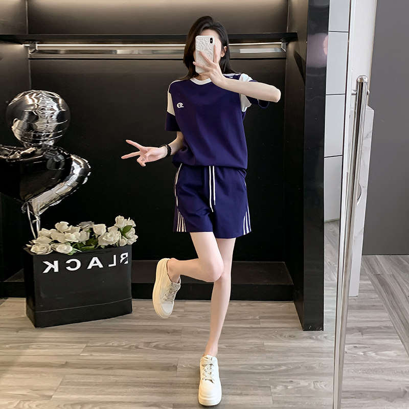 港风羽毛球服运动套装女夏拼色短袖宽松显瘦透气侧条纹短裤两件套