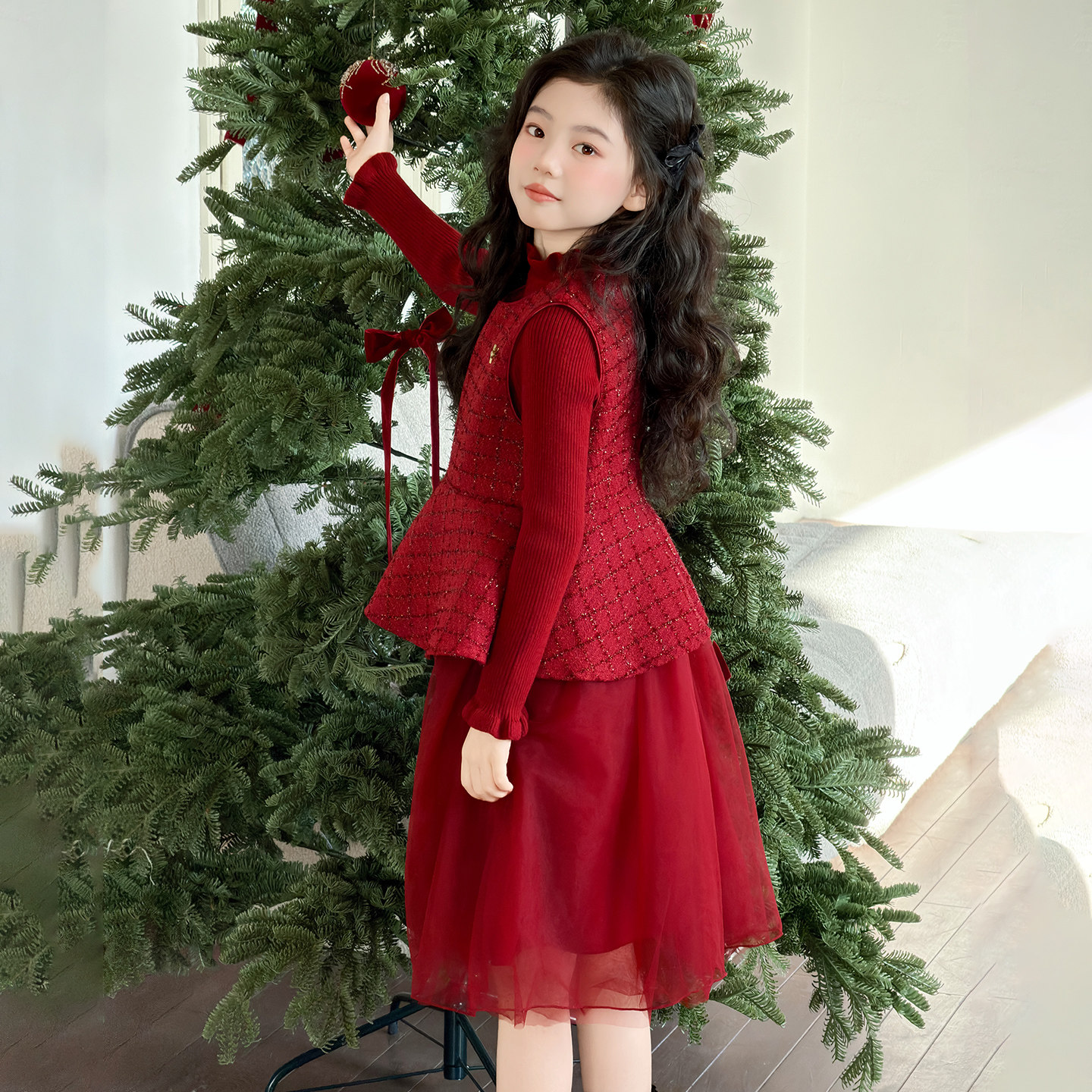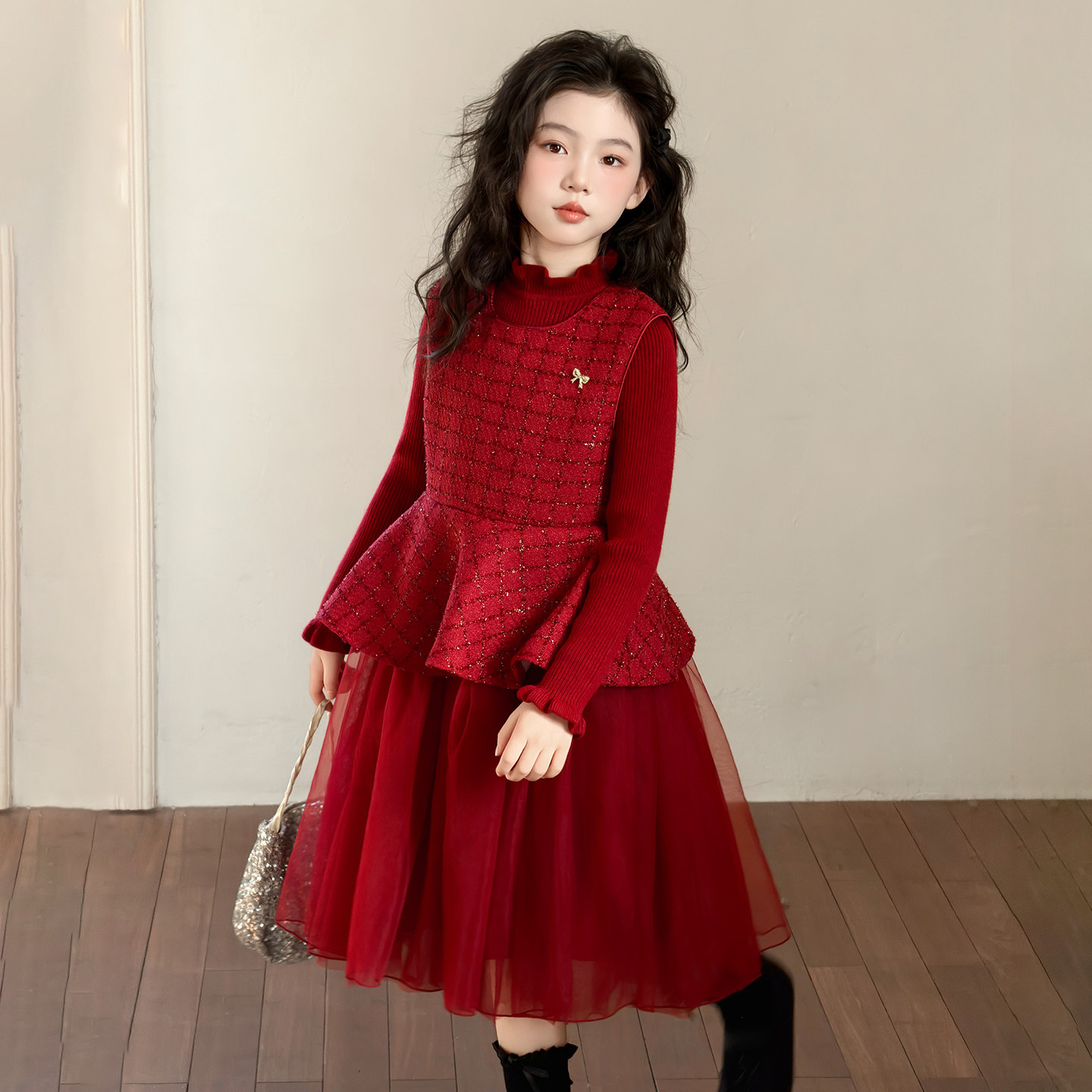 女童红色连衣裙套装冬季2025新款儿童加厚洋气新年拜年服公主裙潮