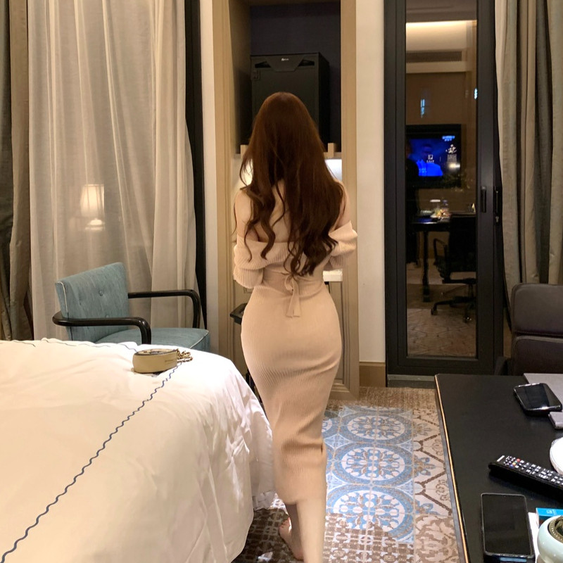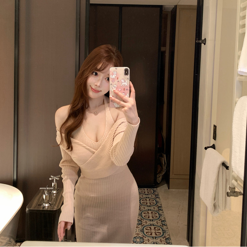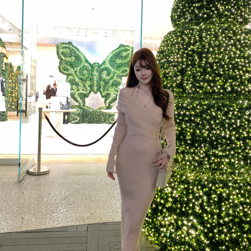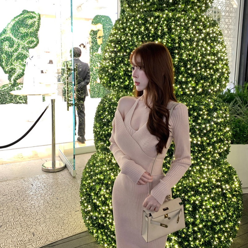 M900长袖纯欲风挂脖针织连衣裙女秋冬修身显瘦露肩包臀裙辣妹穿搭