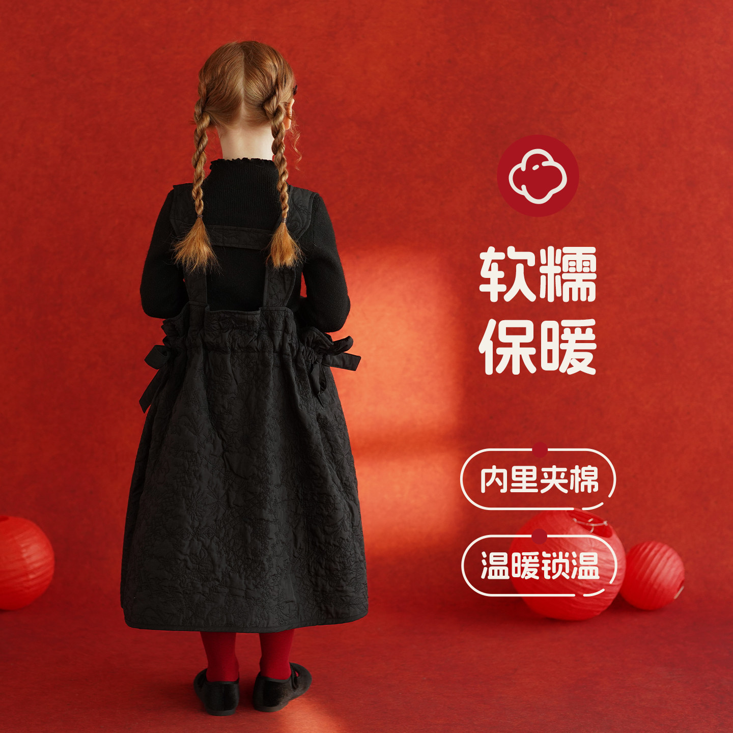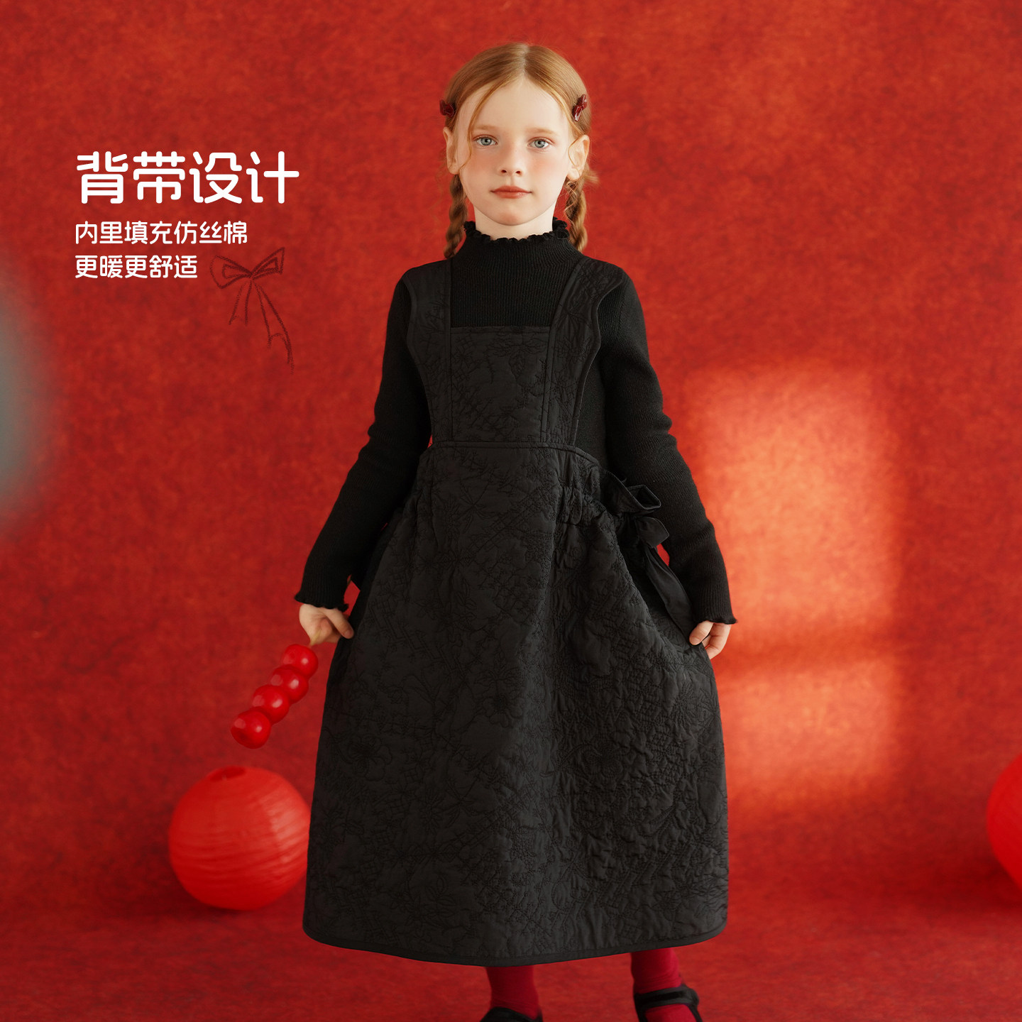砚台家女童夹棉黑色背带裙冬装新款儿童中长裙女宝加厚保暖连衣裙