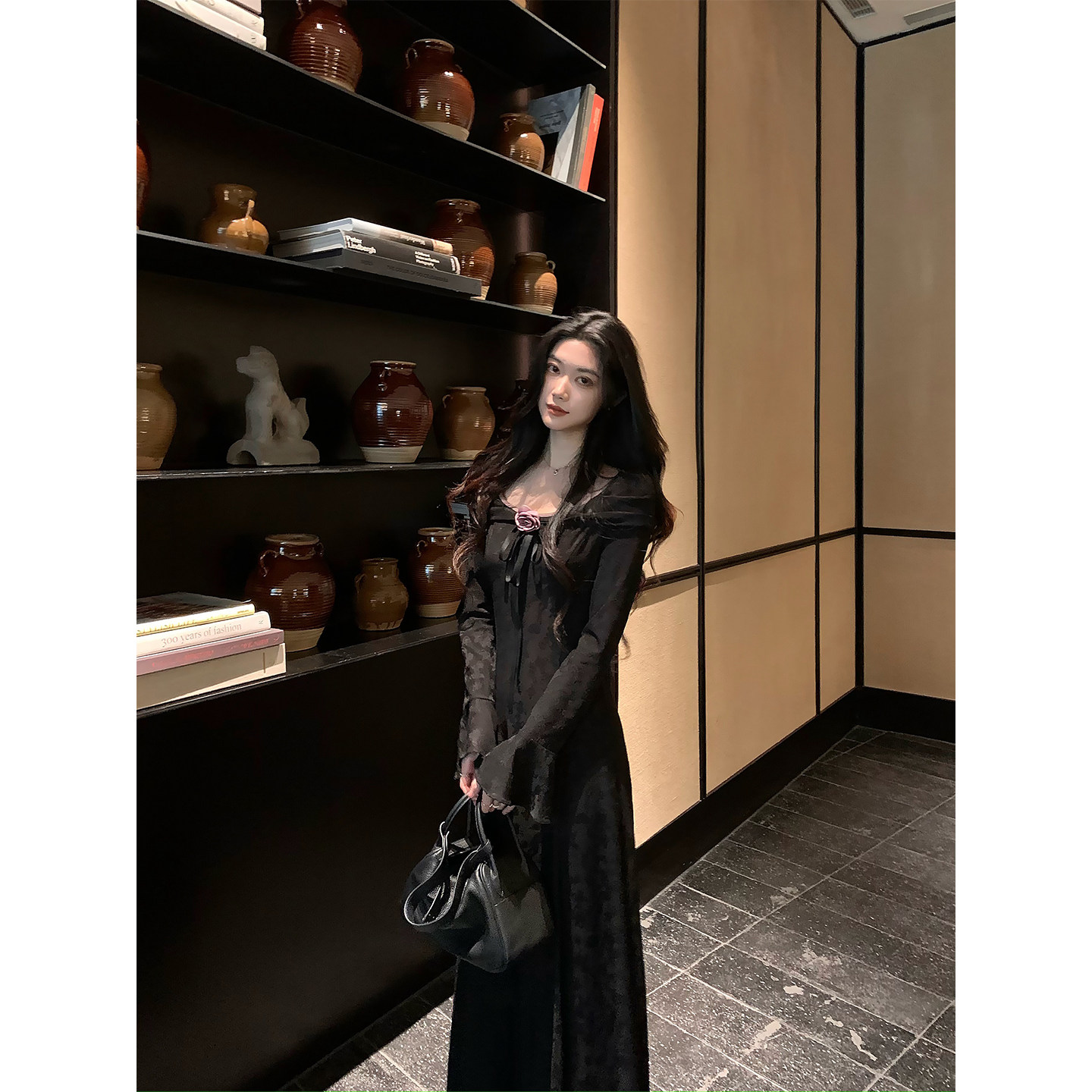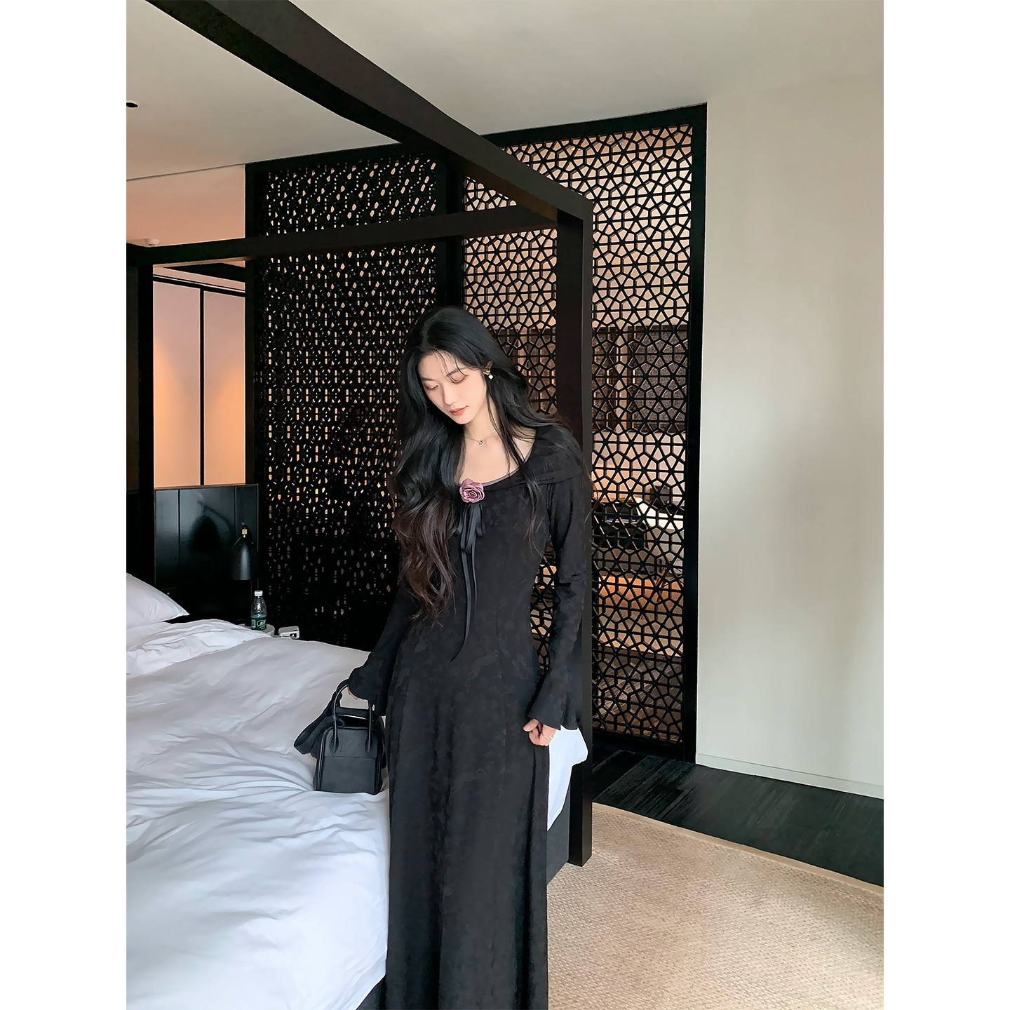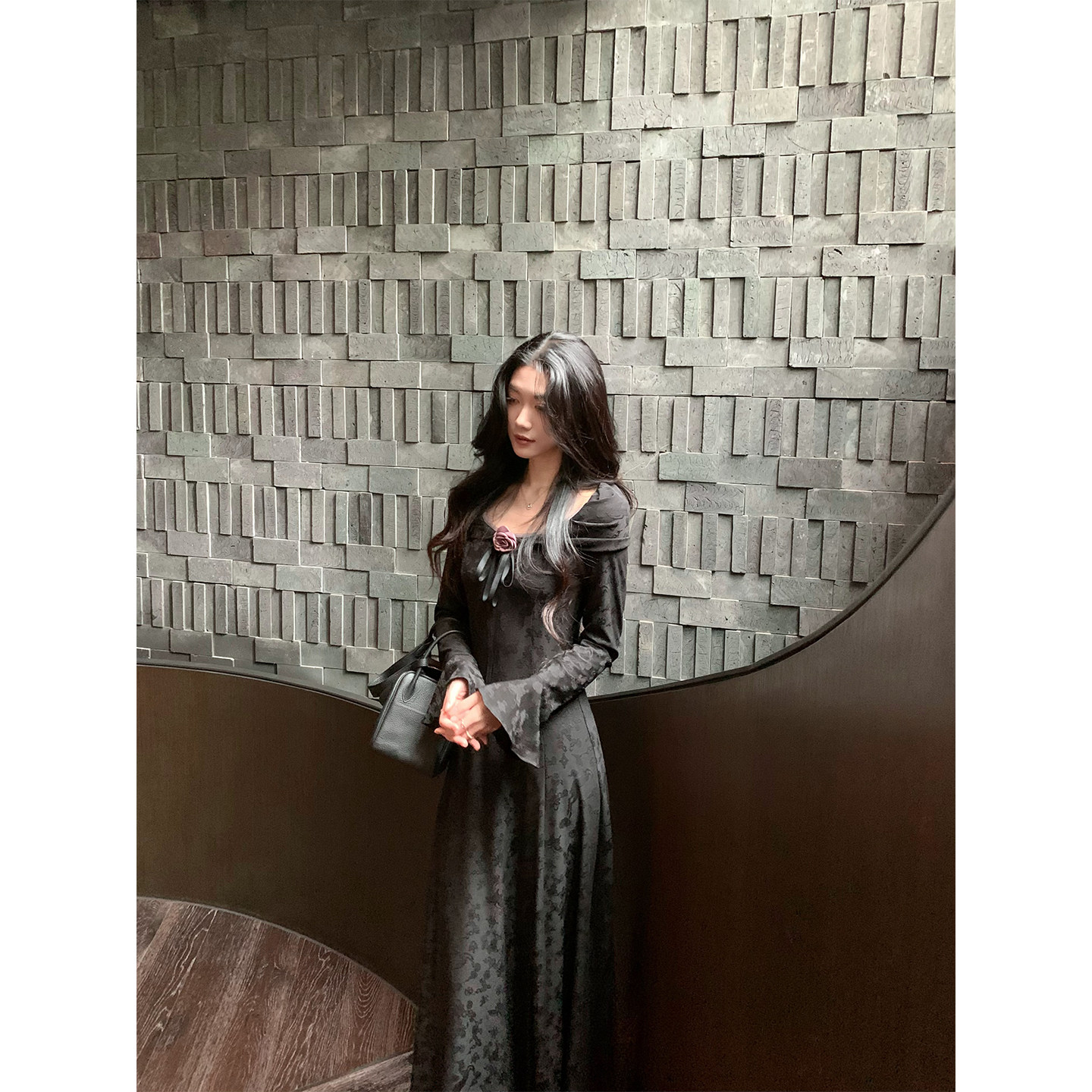 Norain不下雨黑色法式高级提花长袖连衣裙女冬季性感针织修身长裙