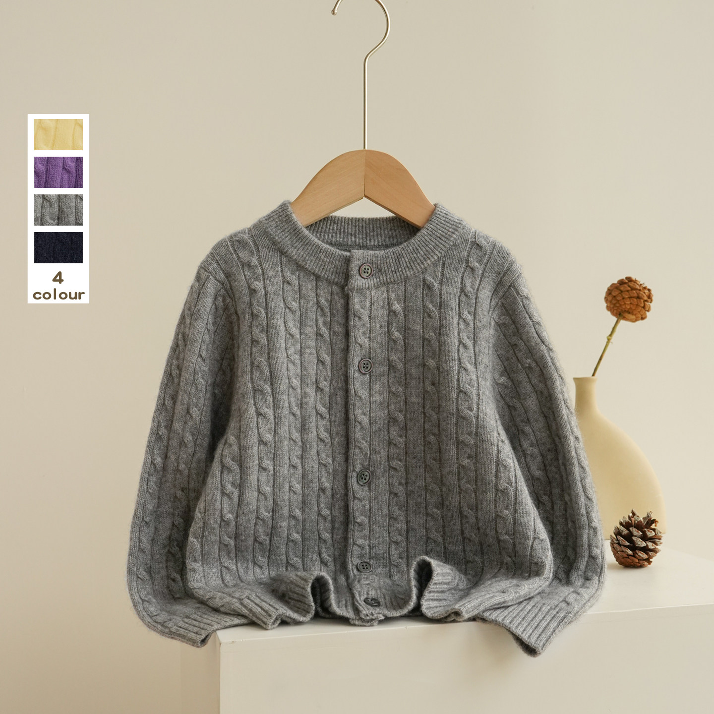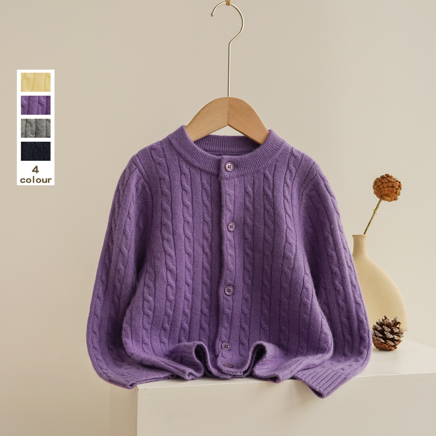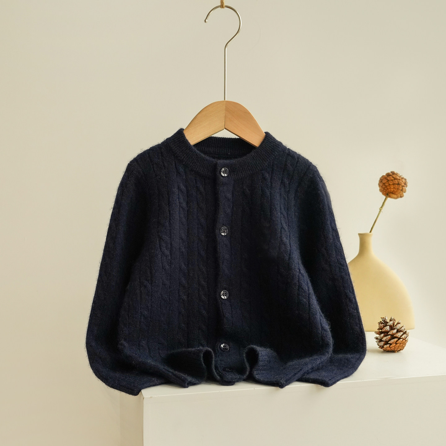 男女童山羊绒开衫圆领麻花百搭外套大中小童学院风针织毛衣双股厚