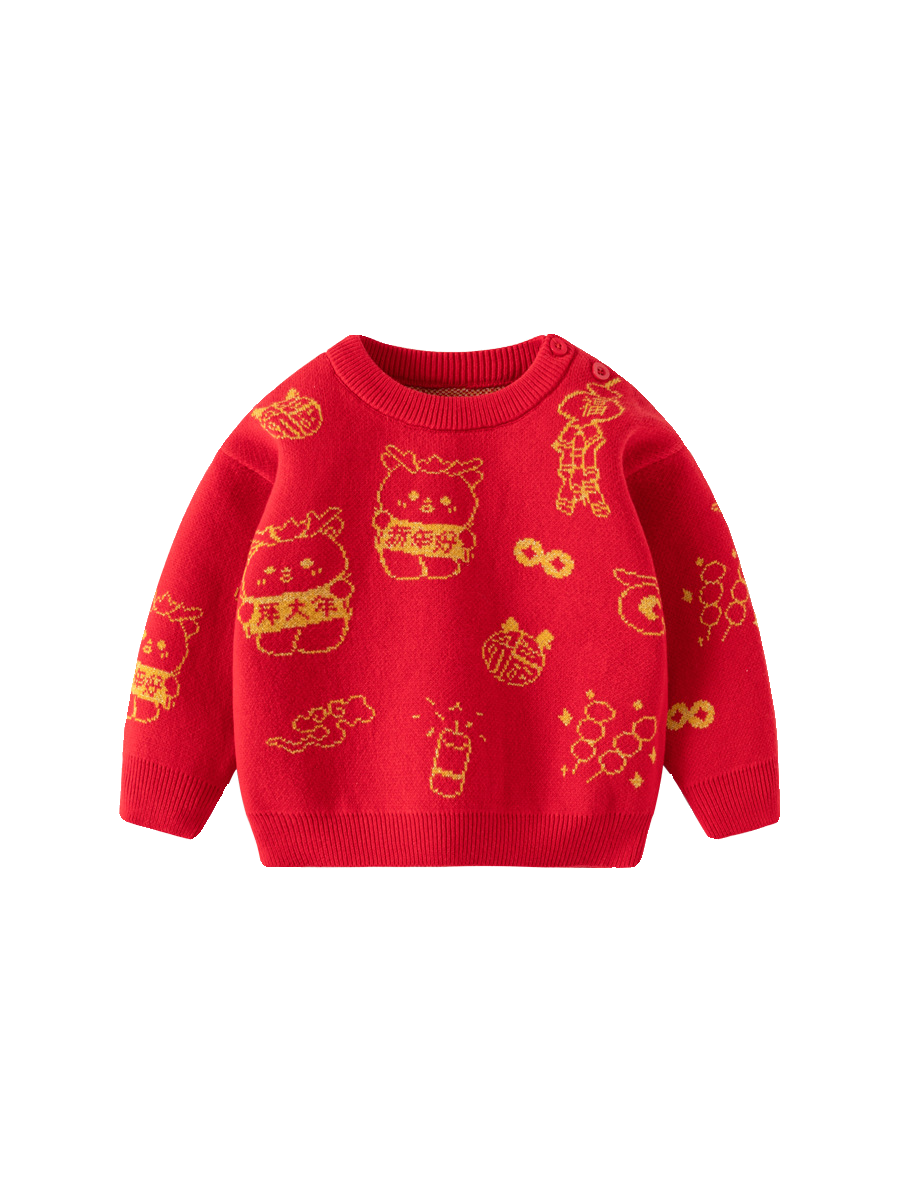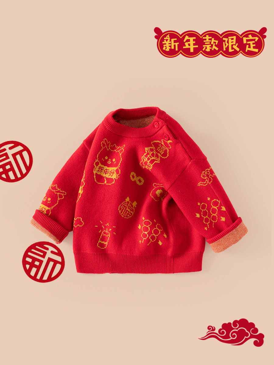 男童毛衣冬款针织衫套头婴儿红色中国风儿童装2025春季新年服上衣