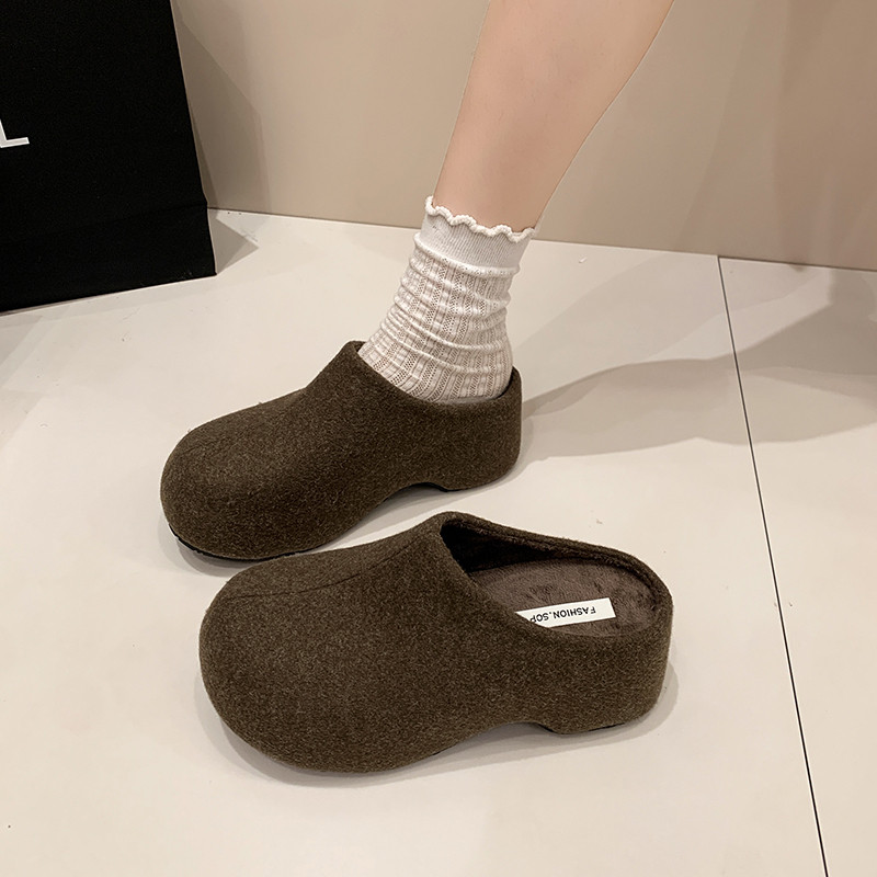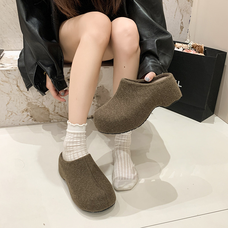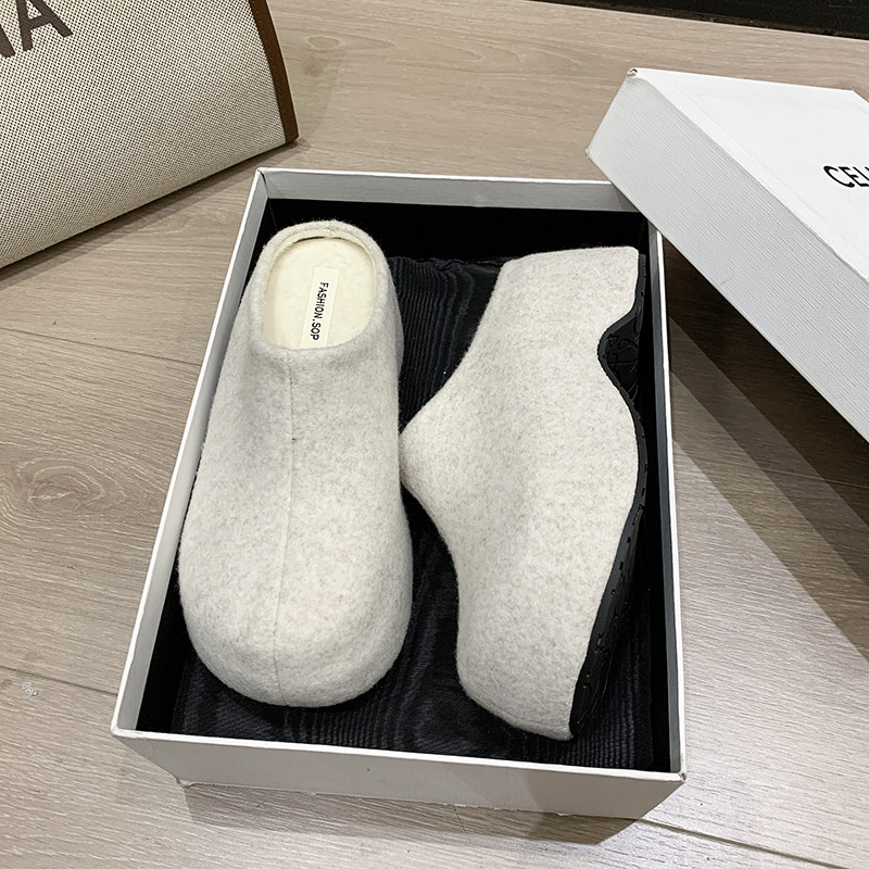 内增高6CM灰色毛呢勃肯鞋女外穿2025新秋冬复古厚底小个子半拖鞋