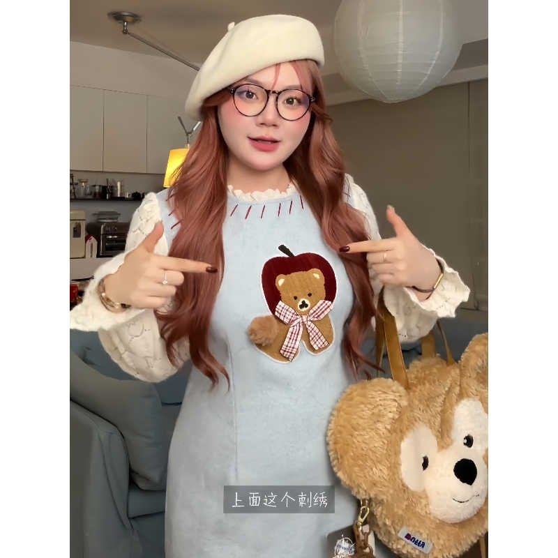 大码温柔风软糯减龄卡通印花长裙女胖MM冬季撞色拼接假两件连衣裙