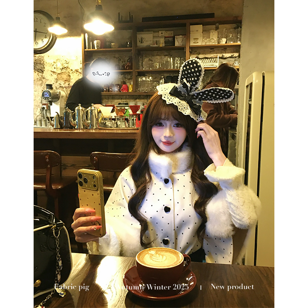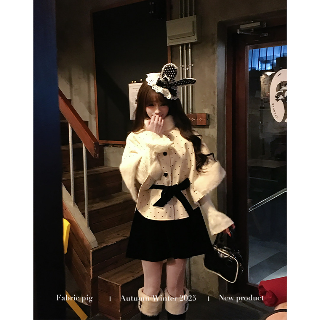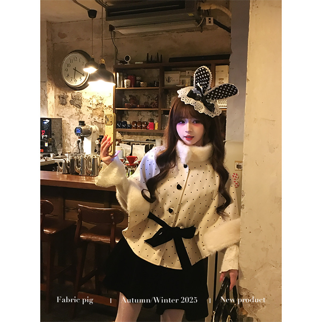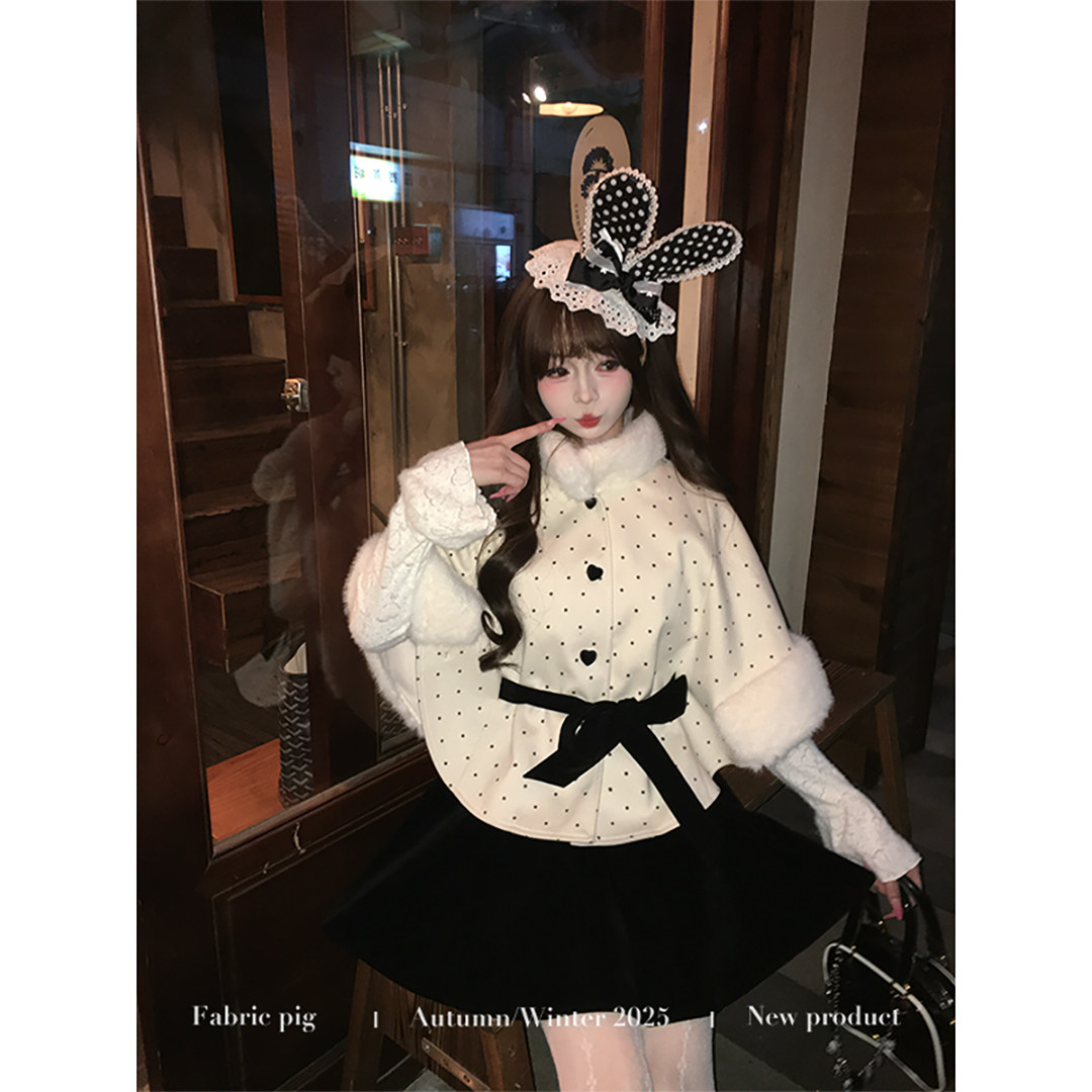 织物猪 赫本千金 蕾丝假两件连衣裙套装女秋冬波点斗篷外套两件套
