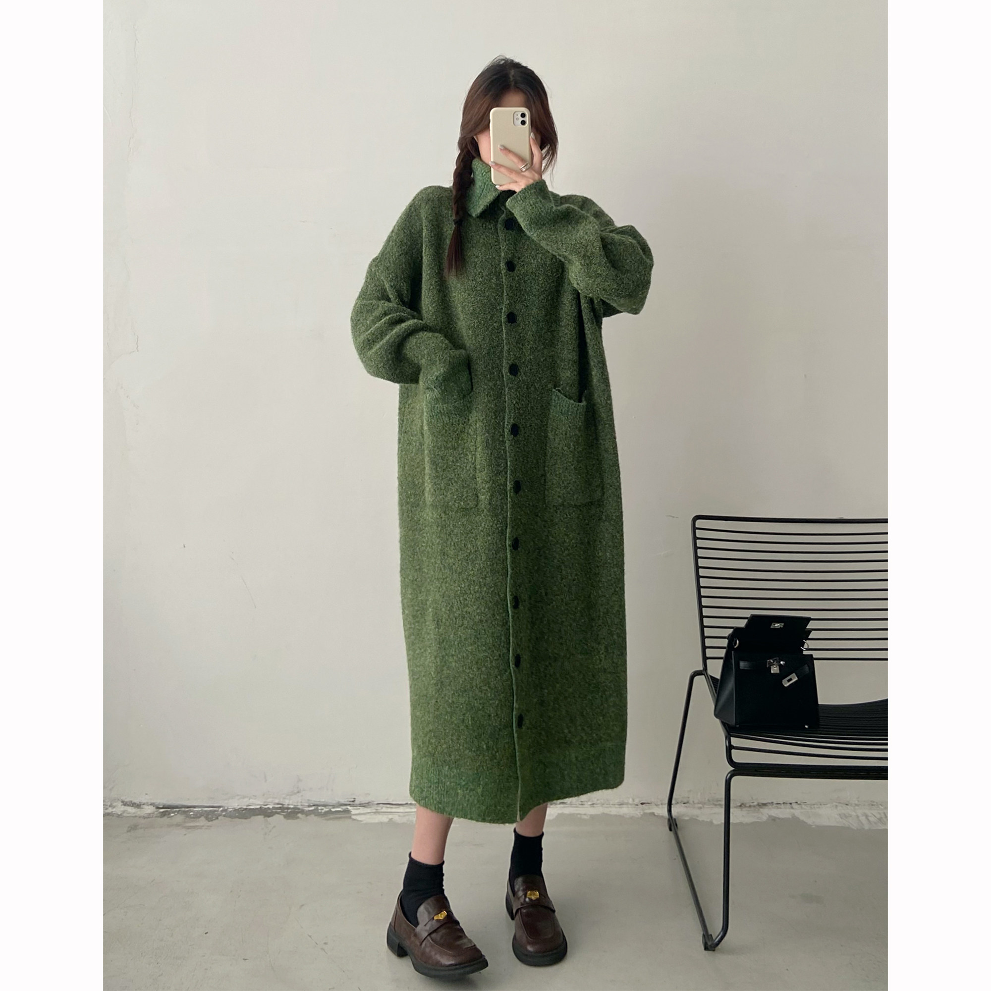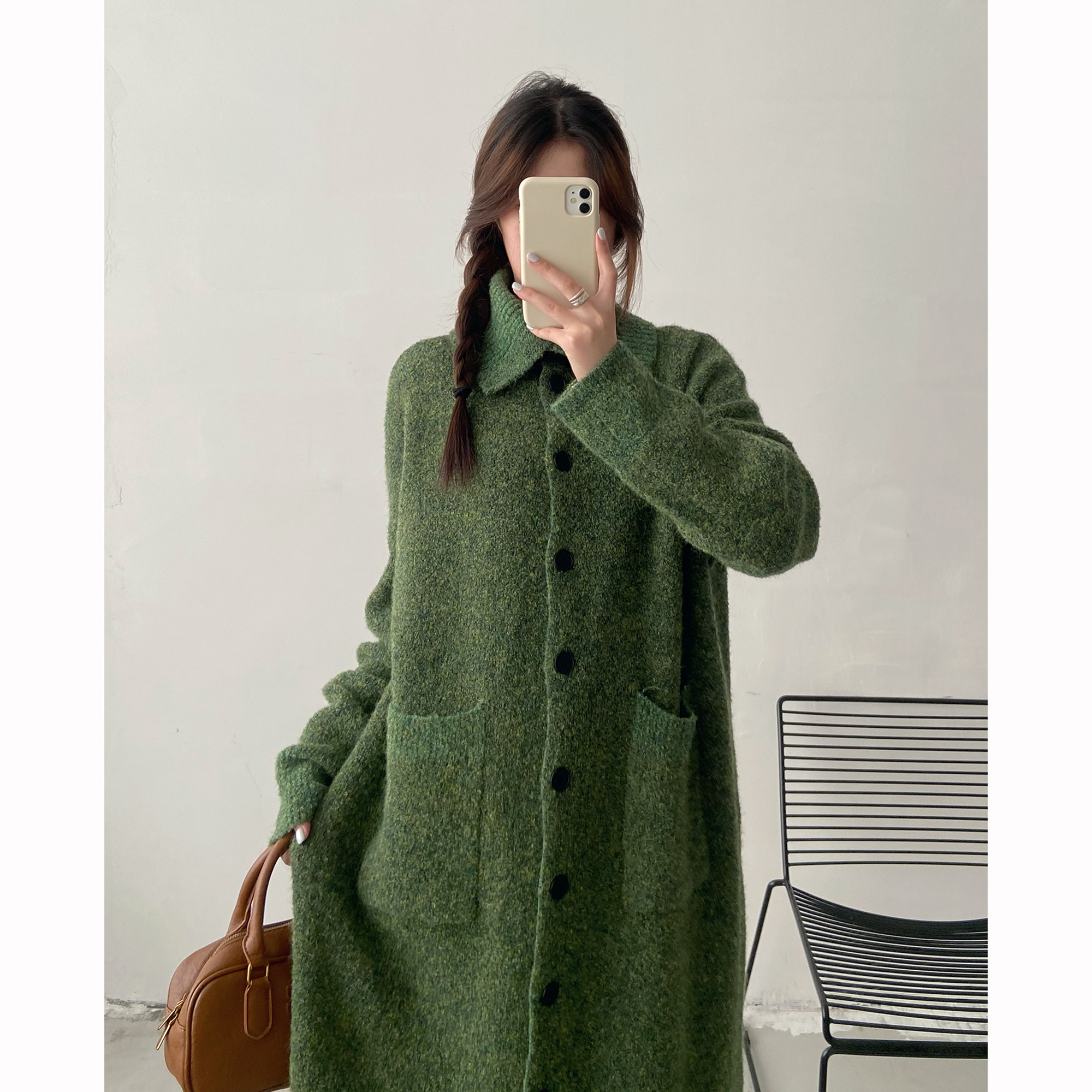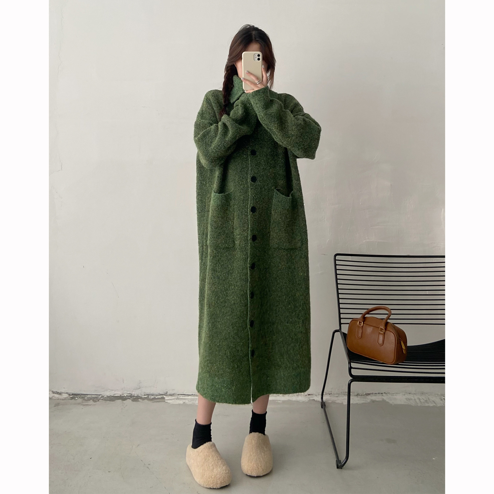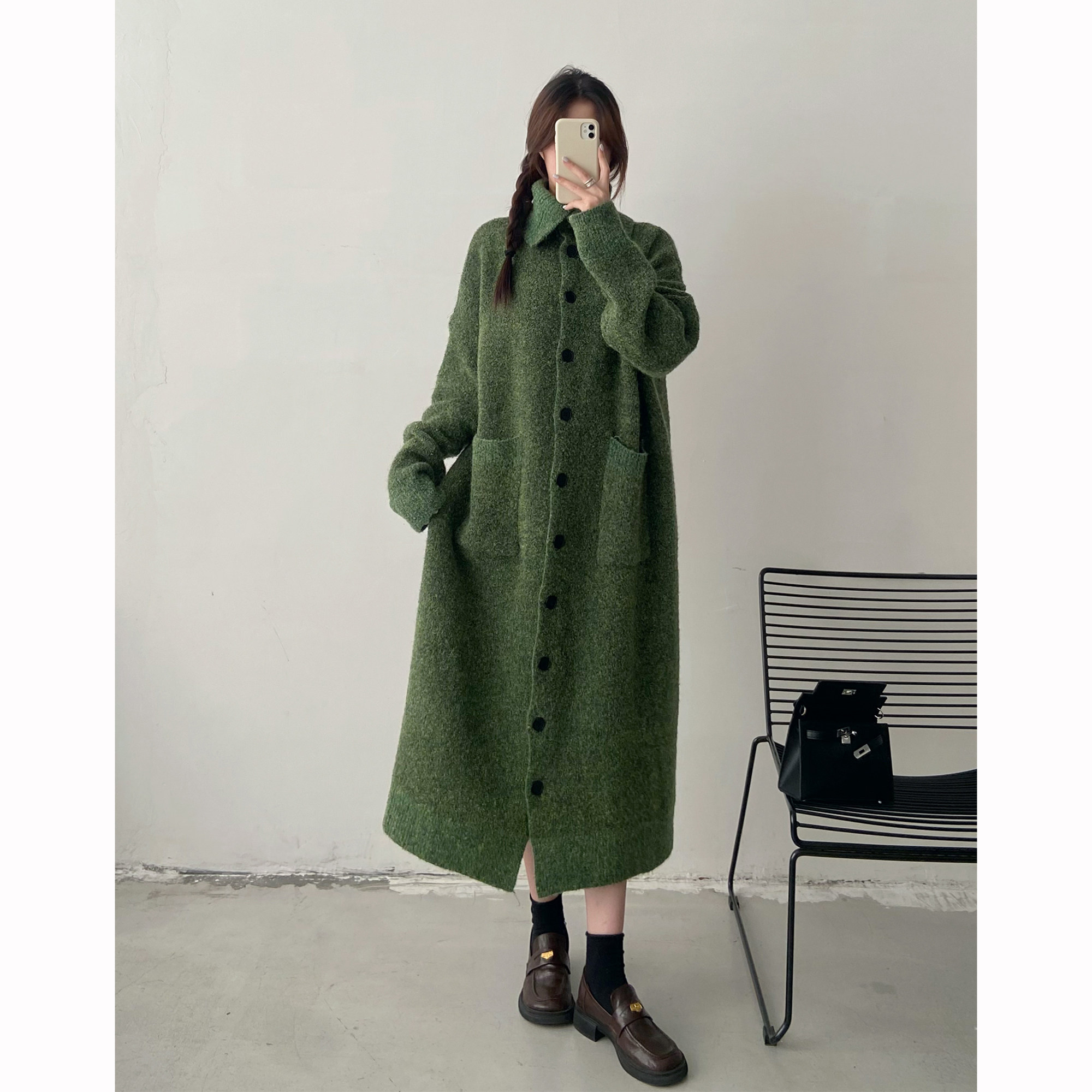 绿色超长款毛衣外套女2025冬季新款胖mm大码宽松开始针织连衣裙子