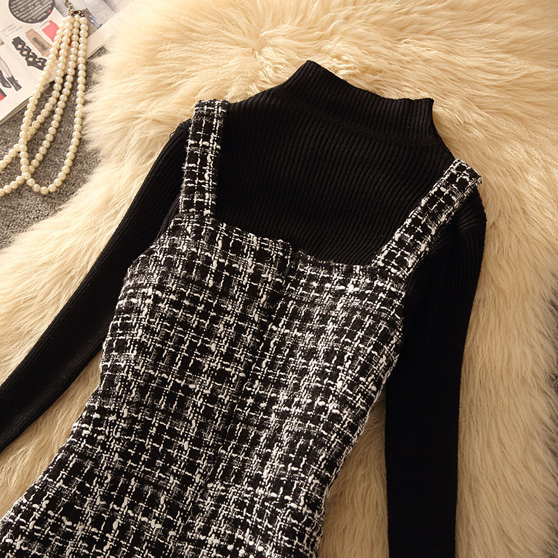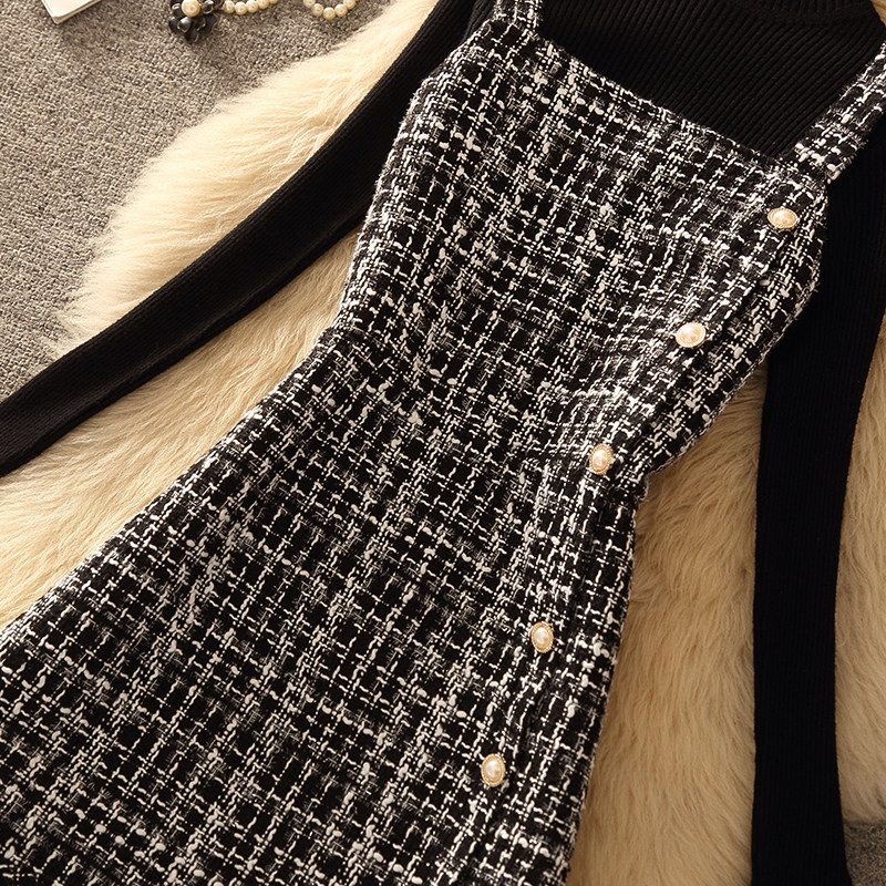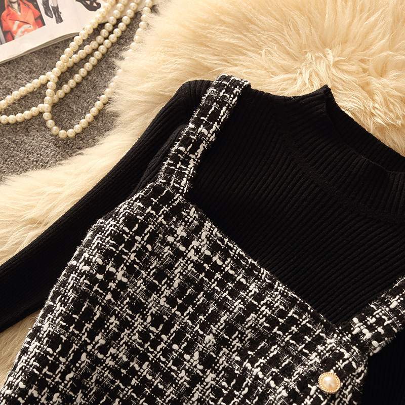 背带裙套装春秋冬洋气减龄显瘦中长款毛呢连衣裙两件套立领针织衫