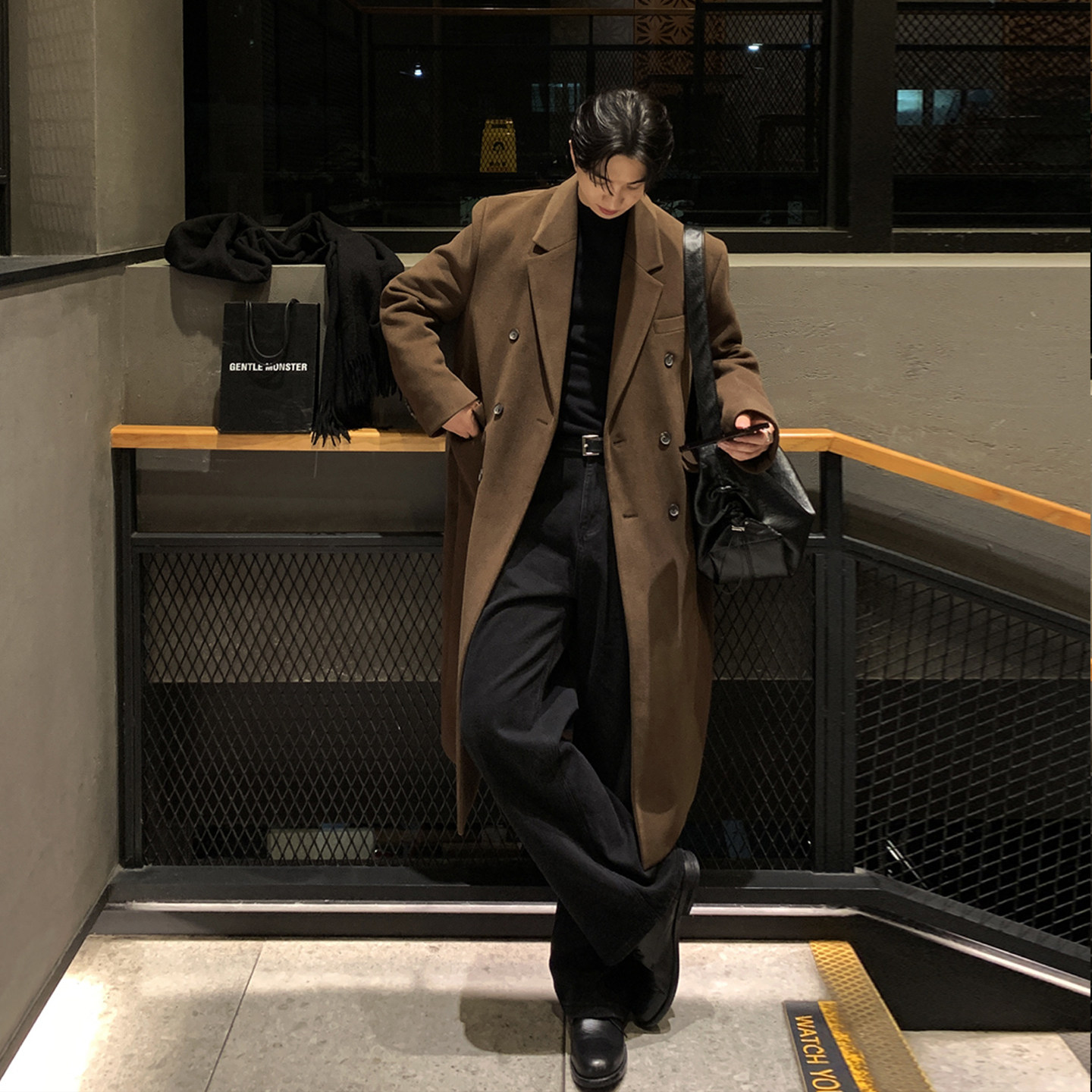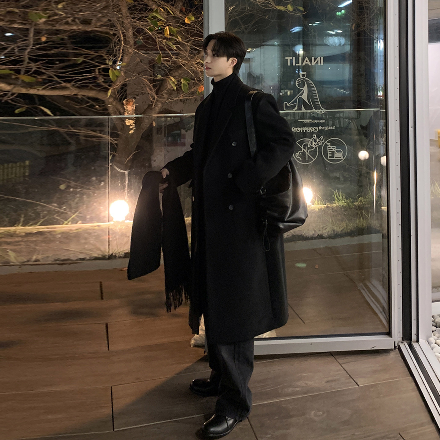 黑色毛呢大衣男款加厚中长2025新款冬装垫肩呢子西装教父风衣外套