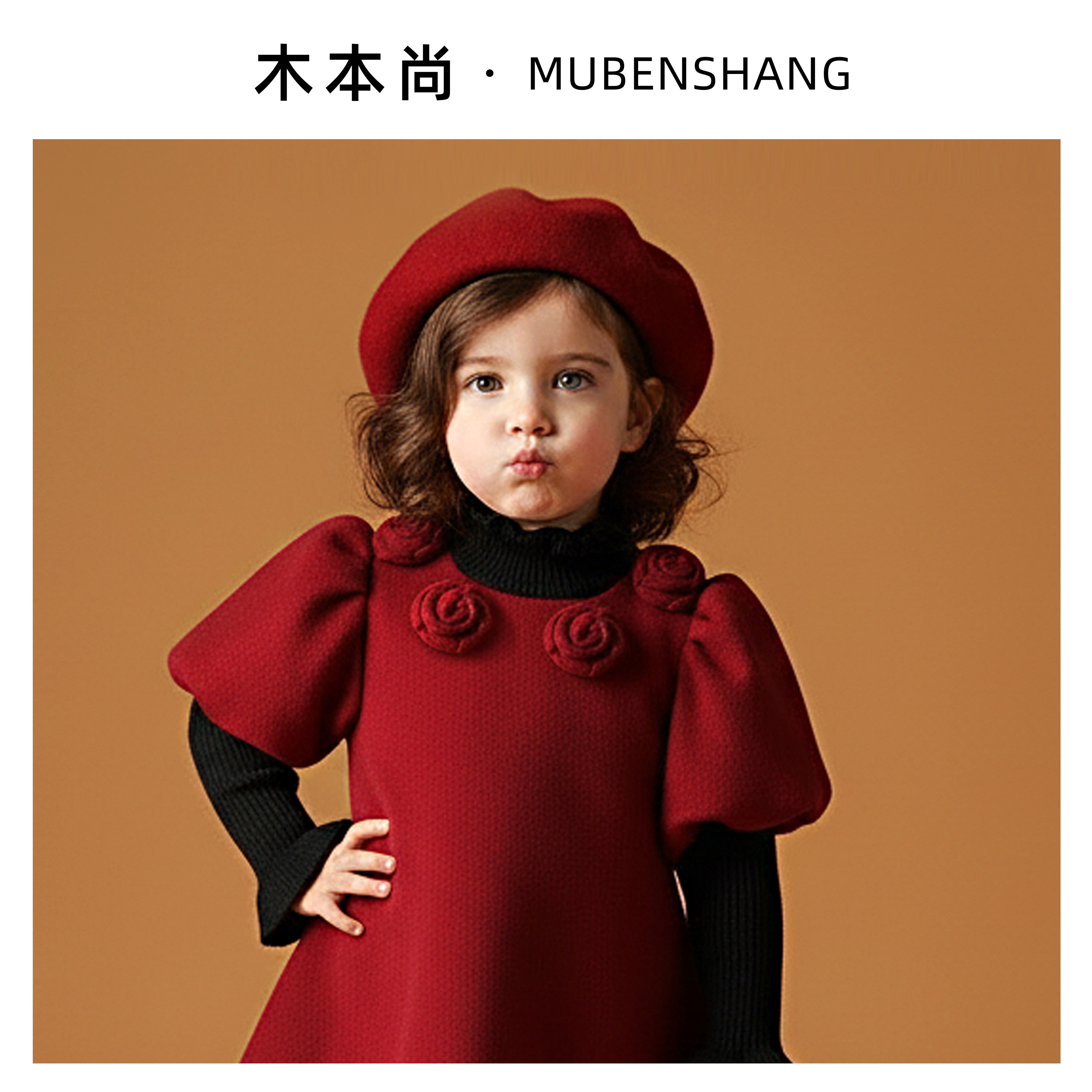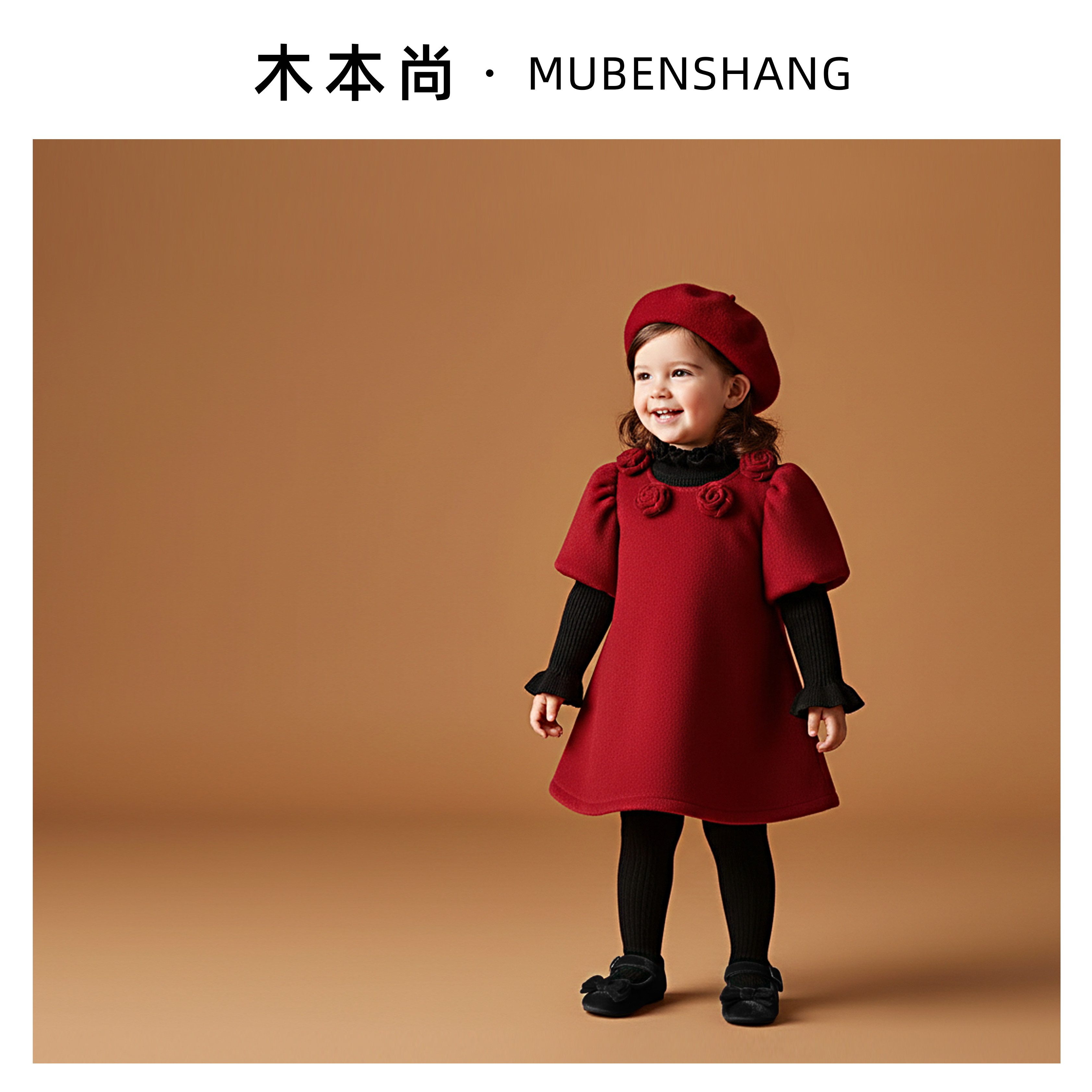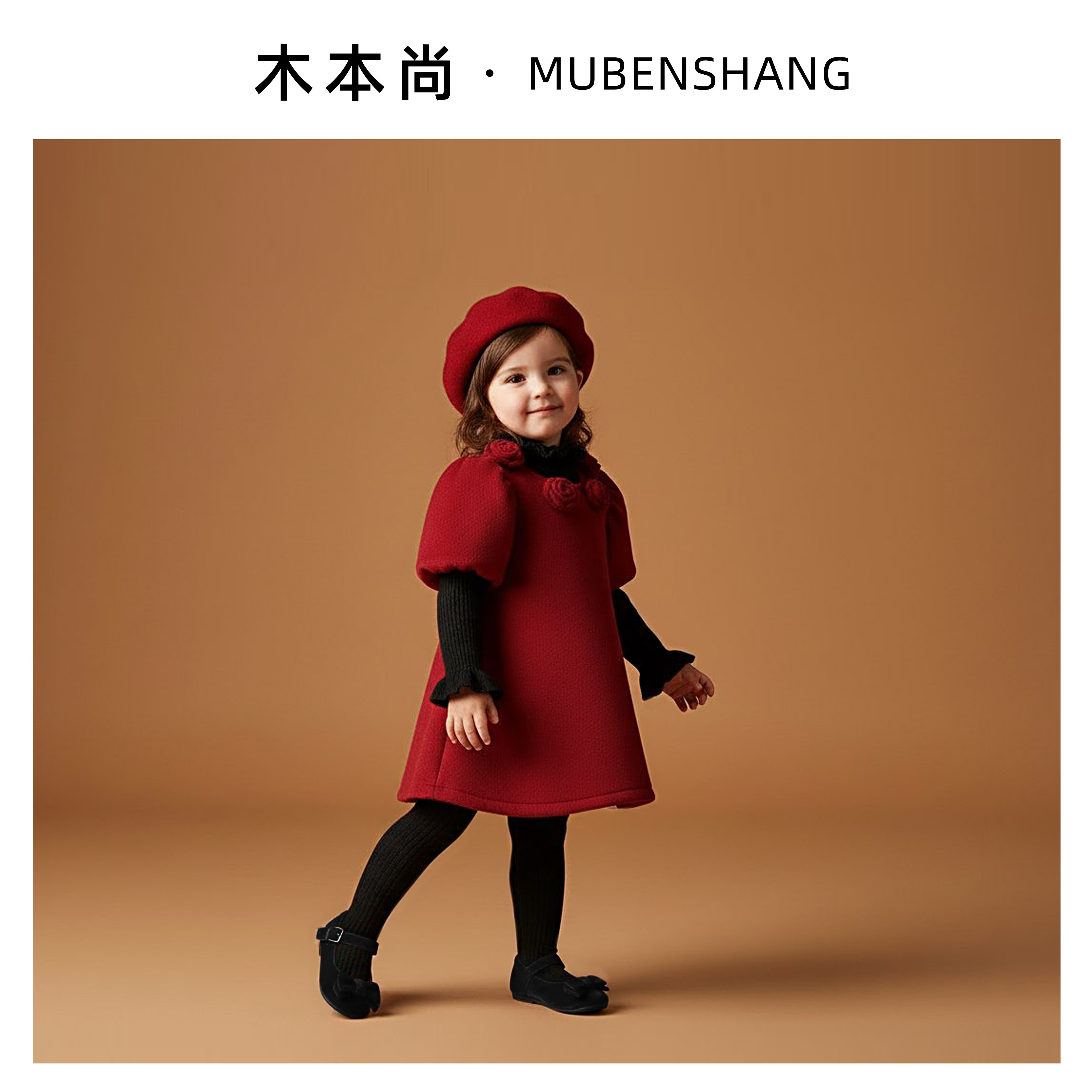木本尚女童冬装连衣裙红色拜年服2026新款呢子公主裙加绒加厚过年