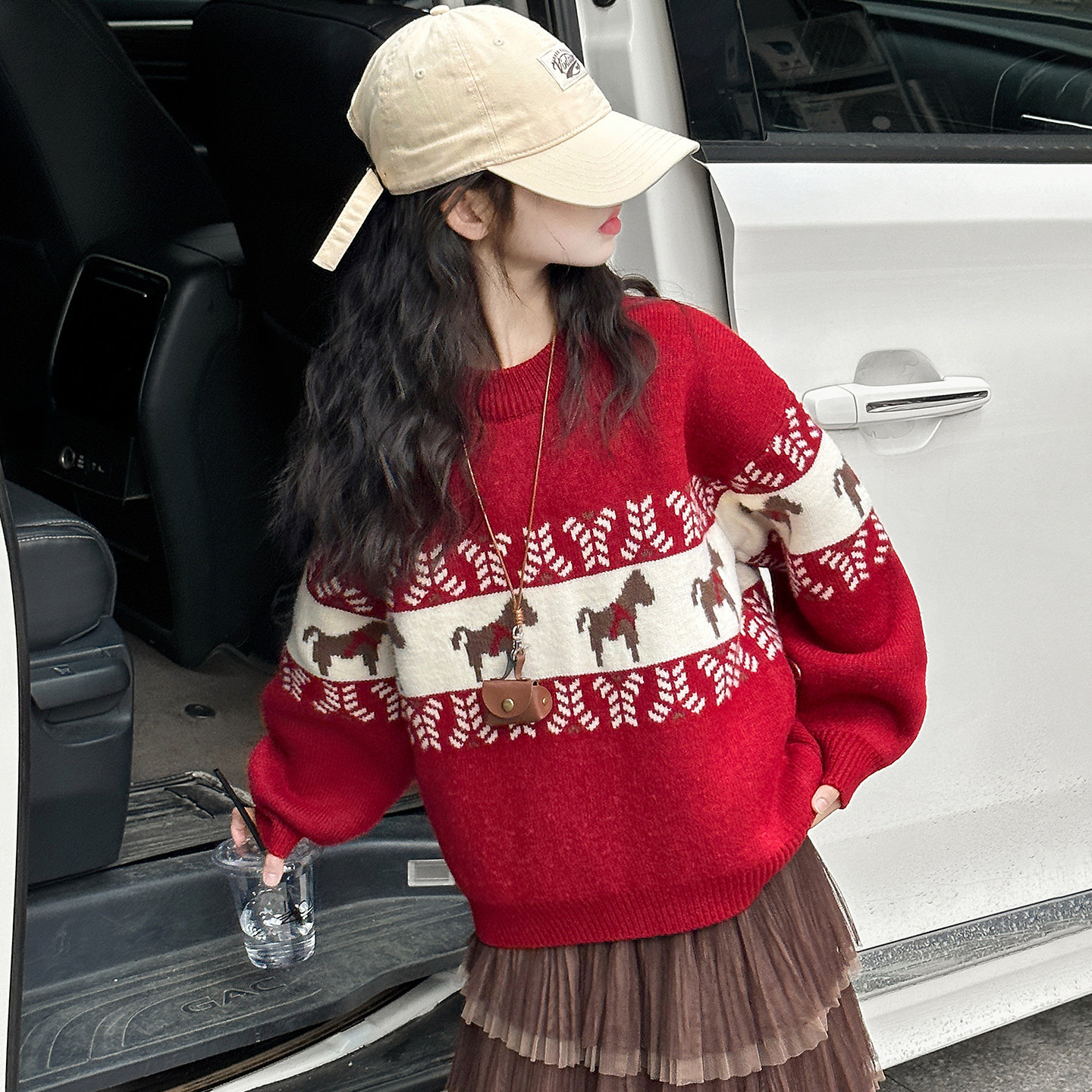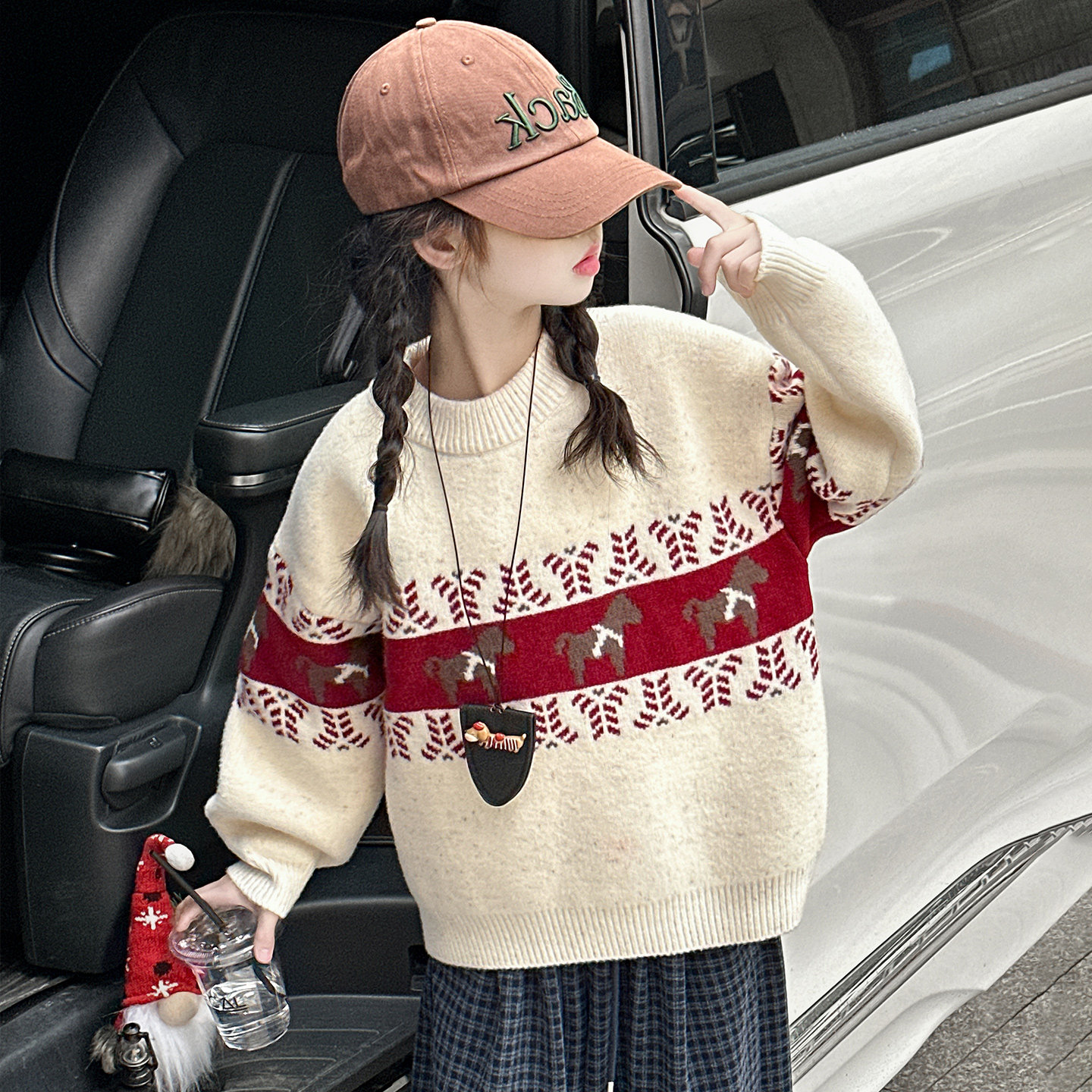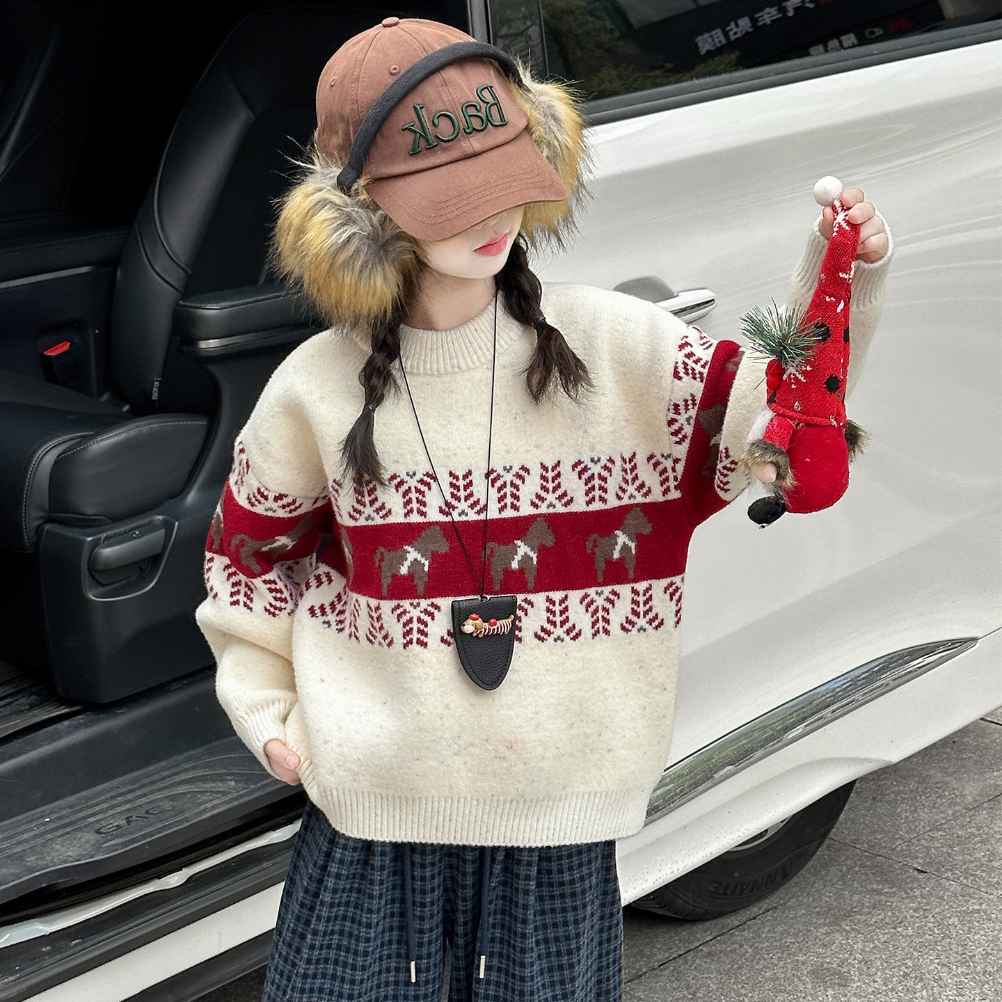 女童毛衣秋冬2026新款大童装冬季马年针织衫加厚冬装打底上衣红色
