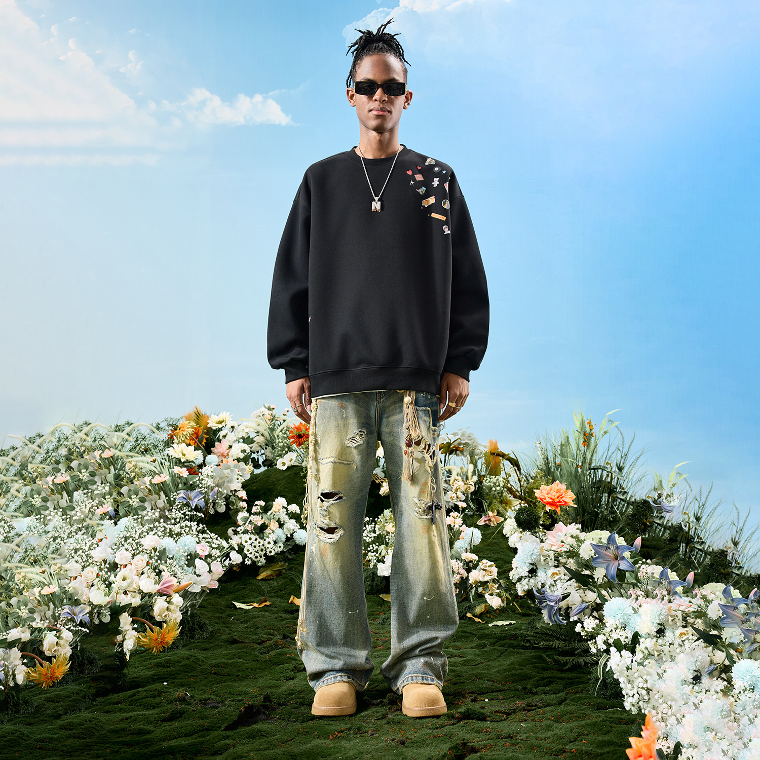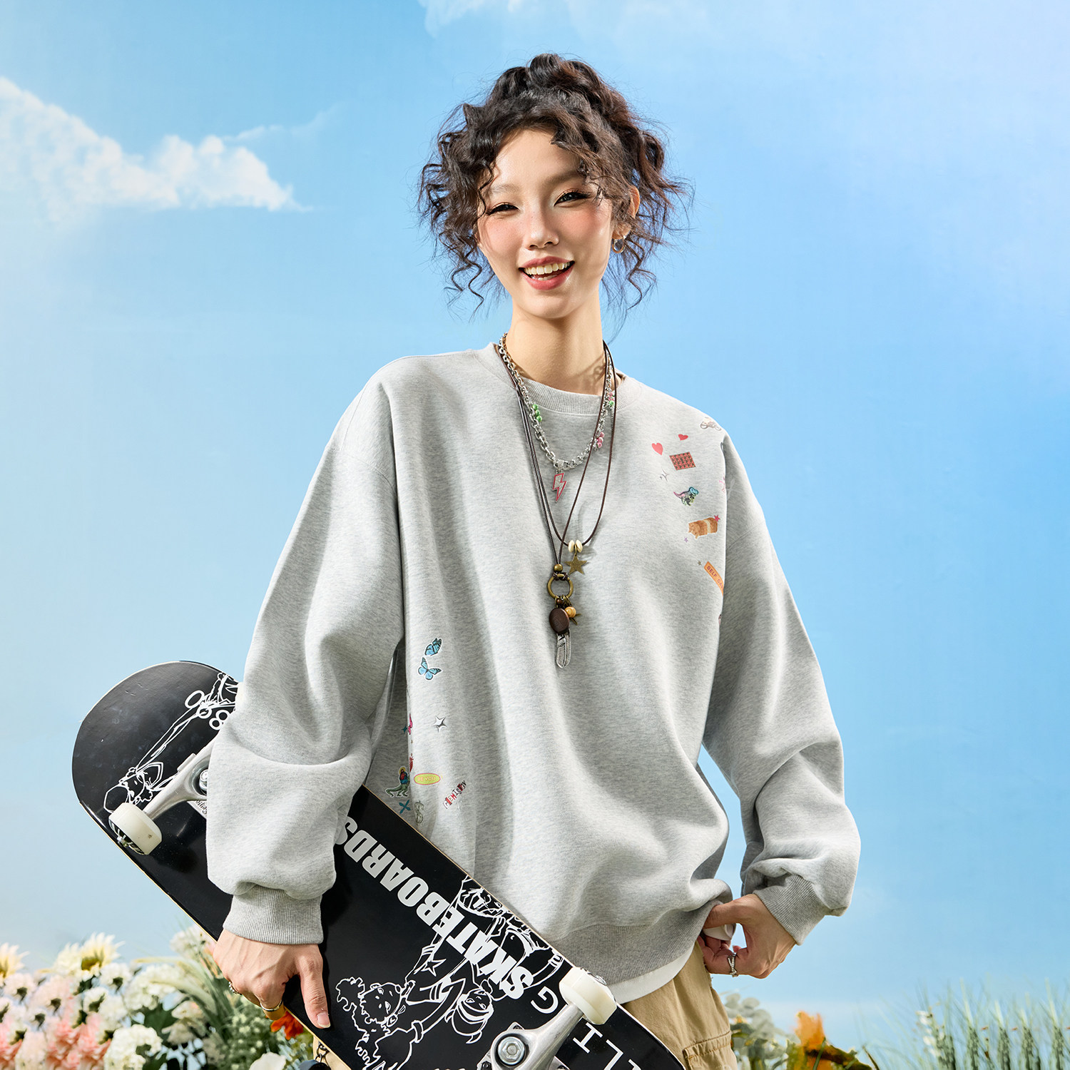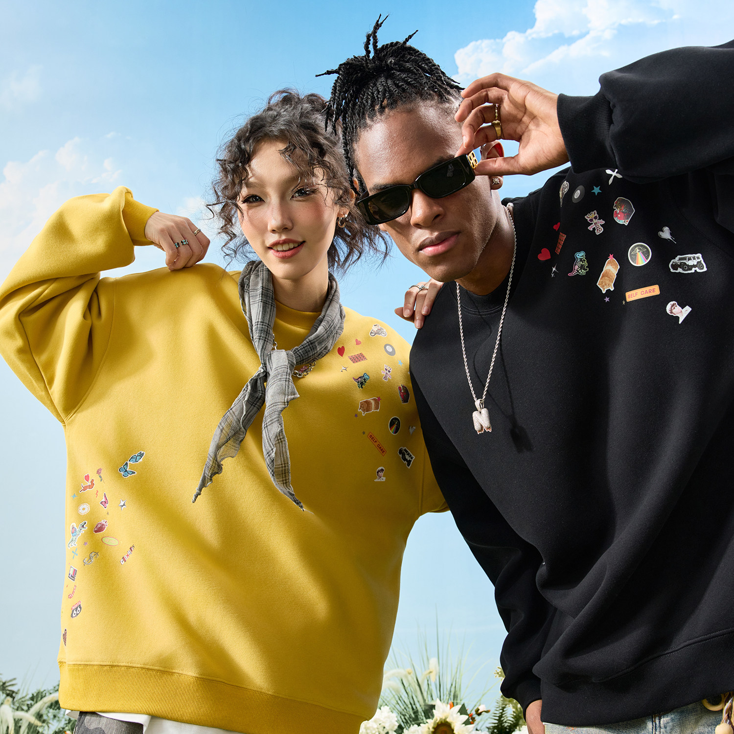 Nuthink美式潮牌卡通贴纸印花圆领卫衣姜黄色情侣男女款2026年春