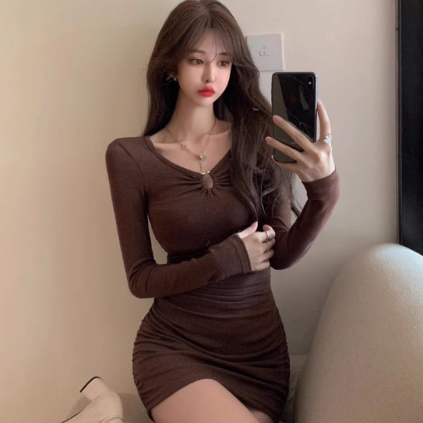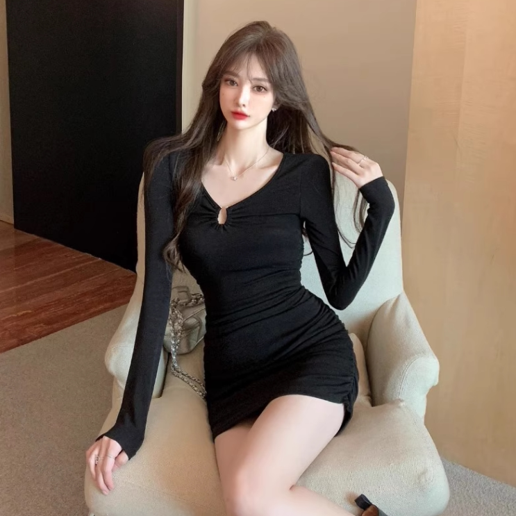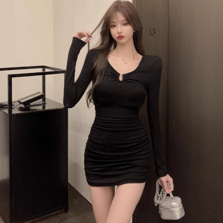 2026年新款女士春秋季长袖小个子连衣裙黑色修身显瘦包臀短裙子潮