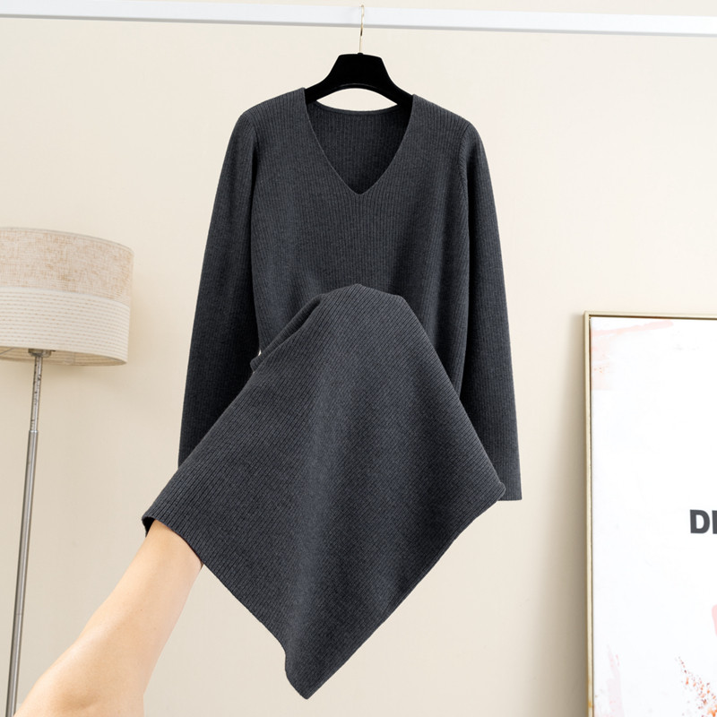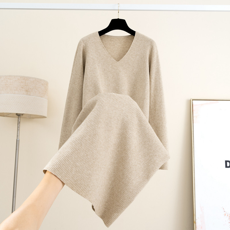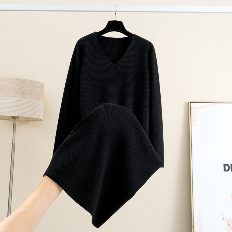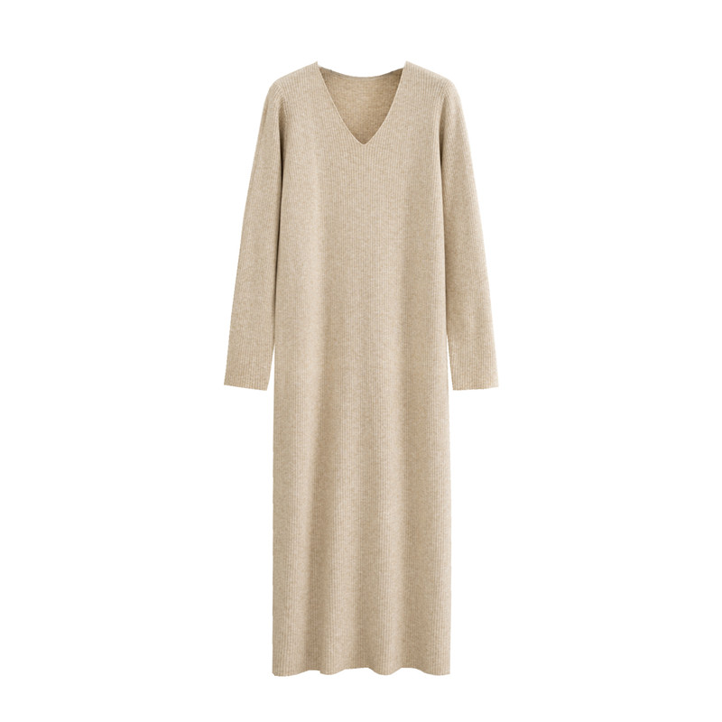 秋冬新款V领长袖针织连衣裙女中长款过膝打底外穿宽松显瘦毛衣裙