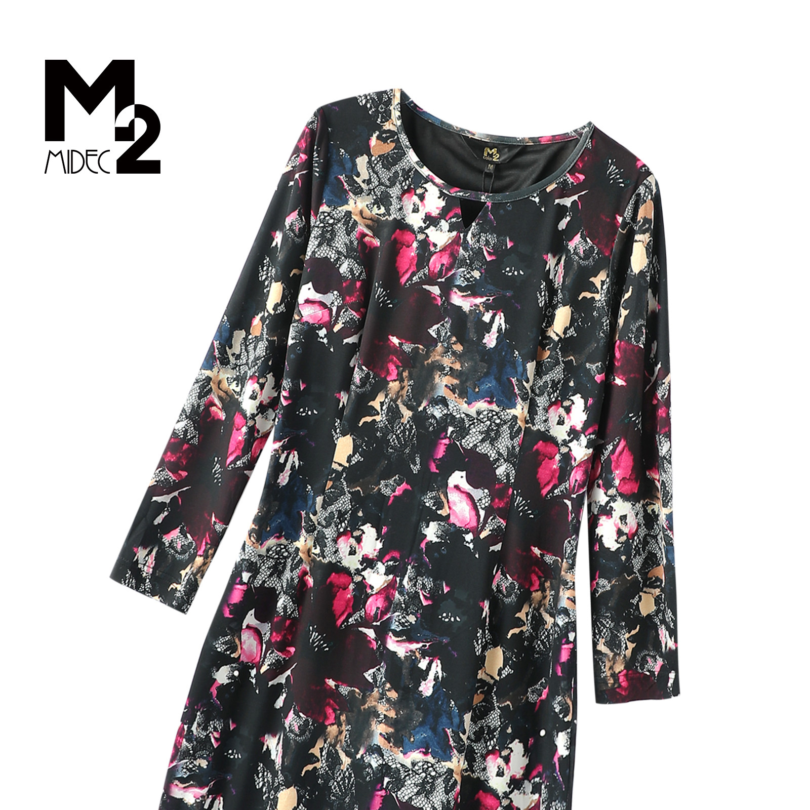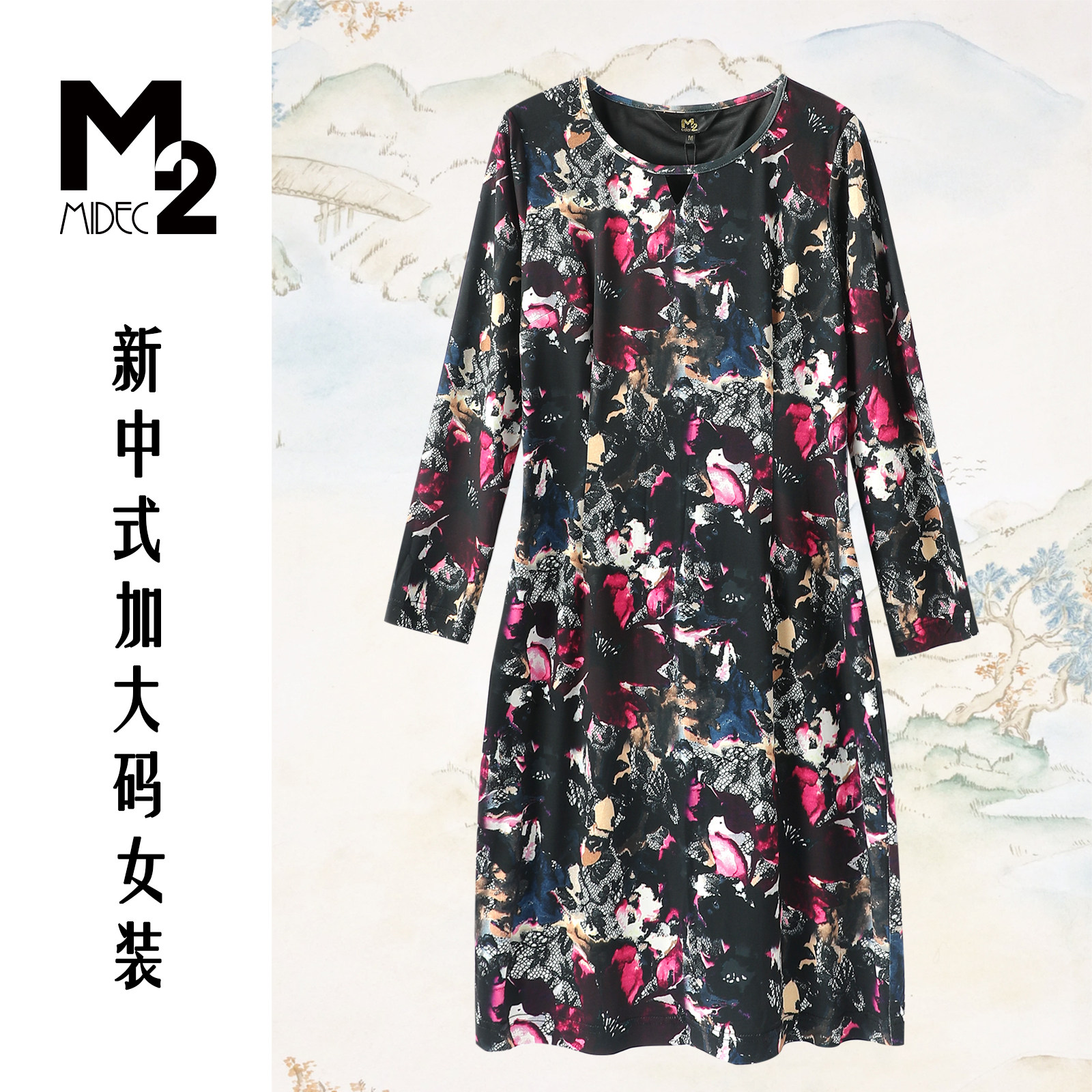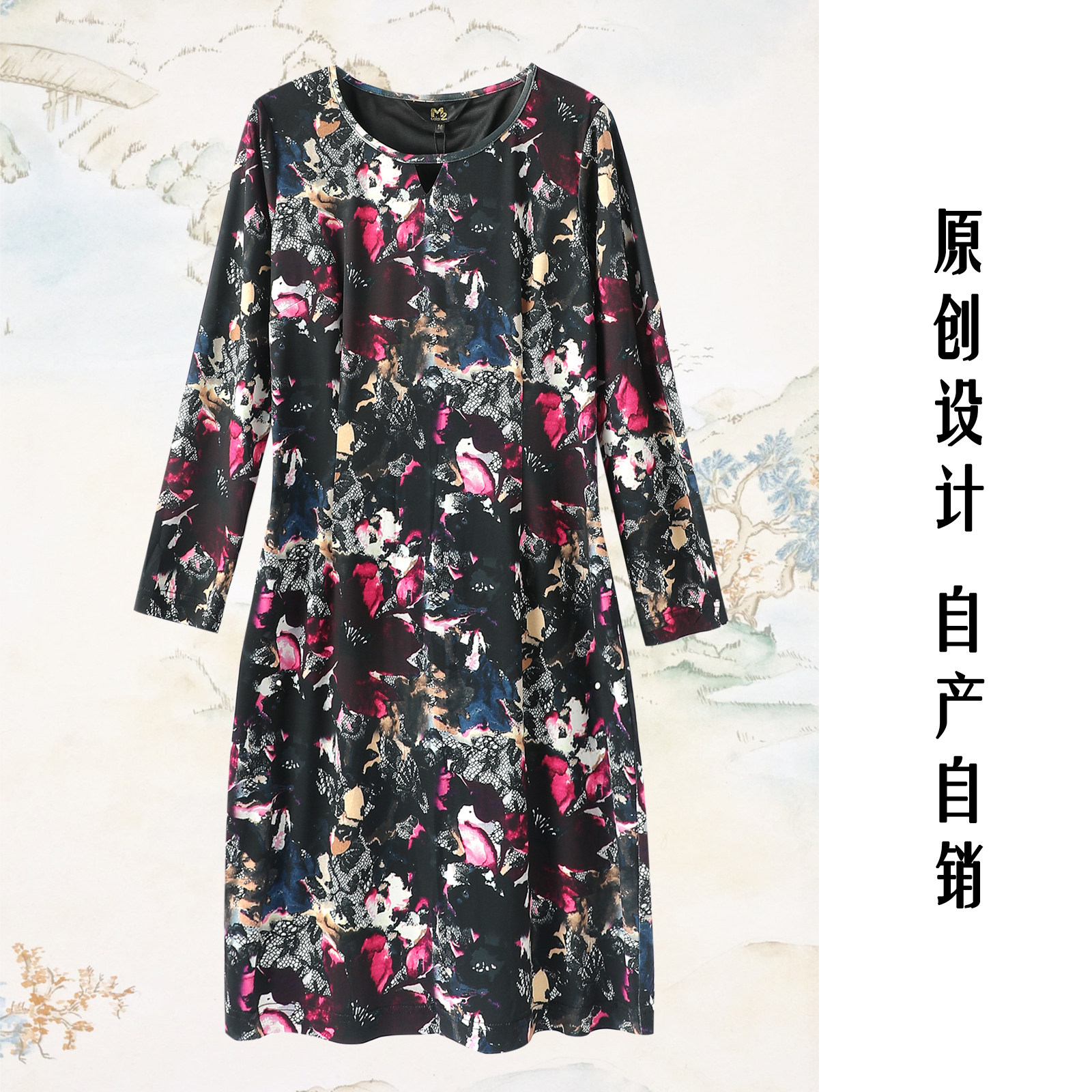 M2折扣店春秋新中式设计感碎花圆领修身中长款气质裙长袖连衣裙