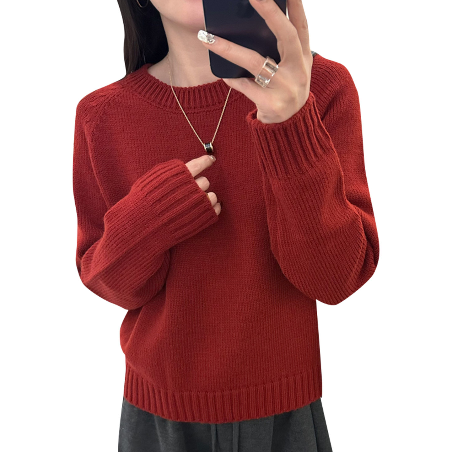 毛衣女款2025新款冬季加绒加厚打底衫圆领软糯针织衫内搭红色上衣